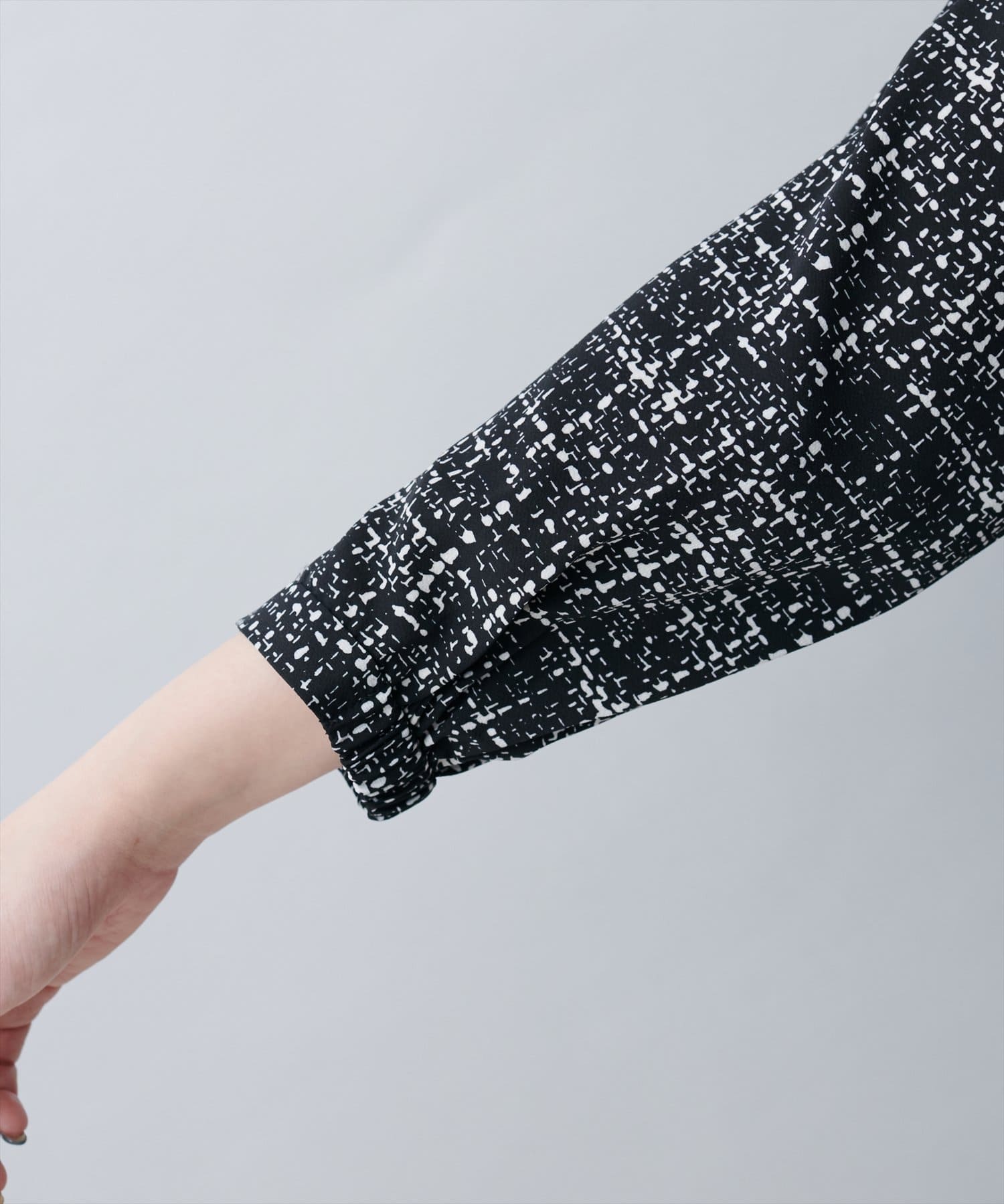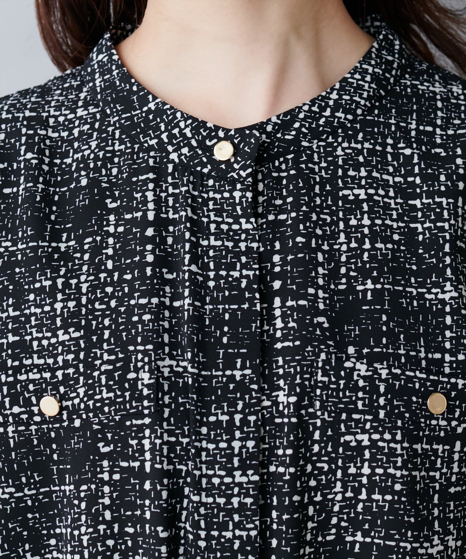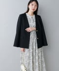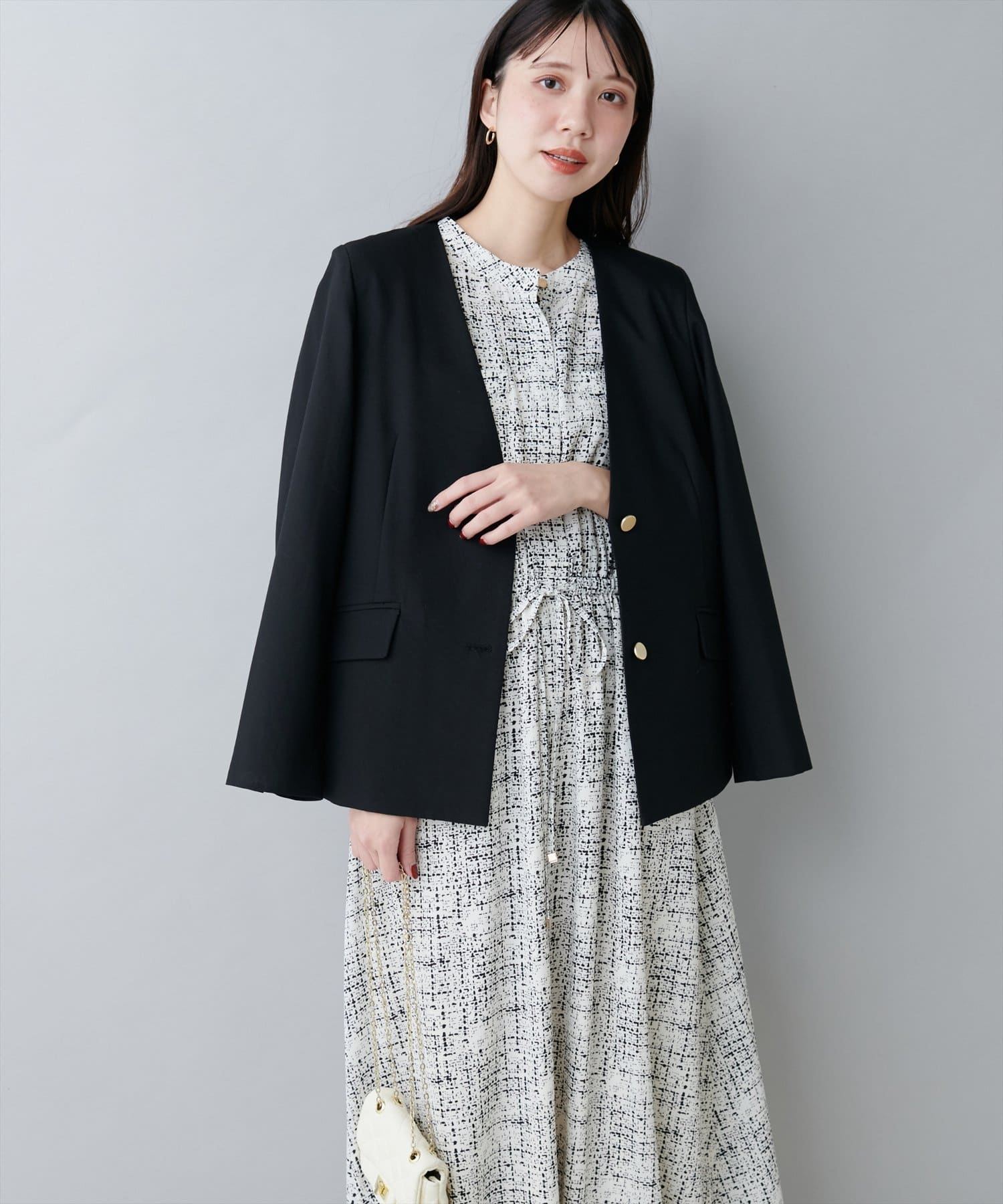 ノーカラーのすっきりとした首元に加え、8分袖で上品な印象に。