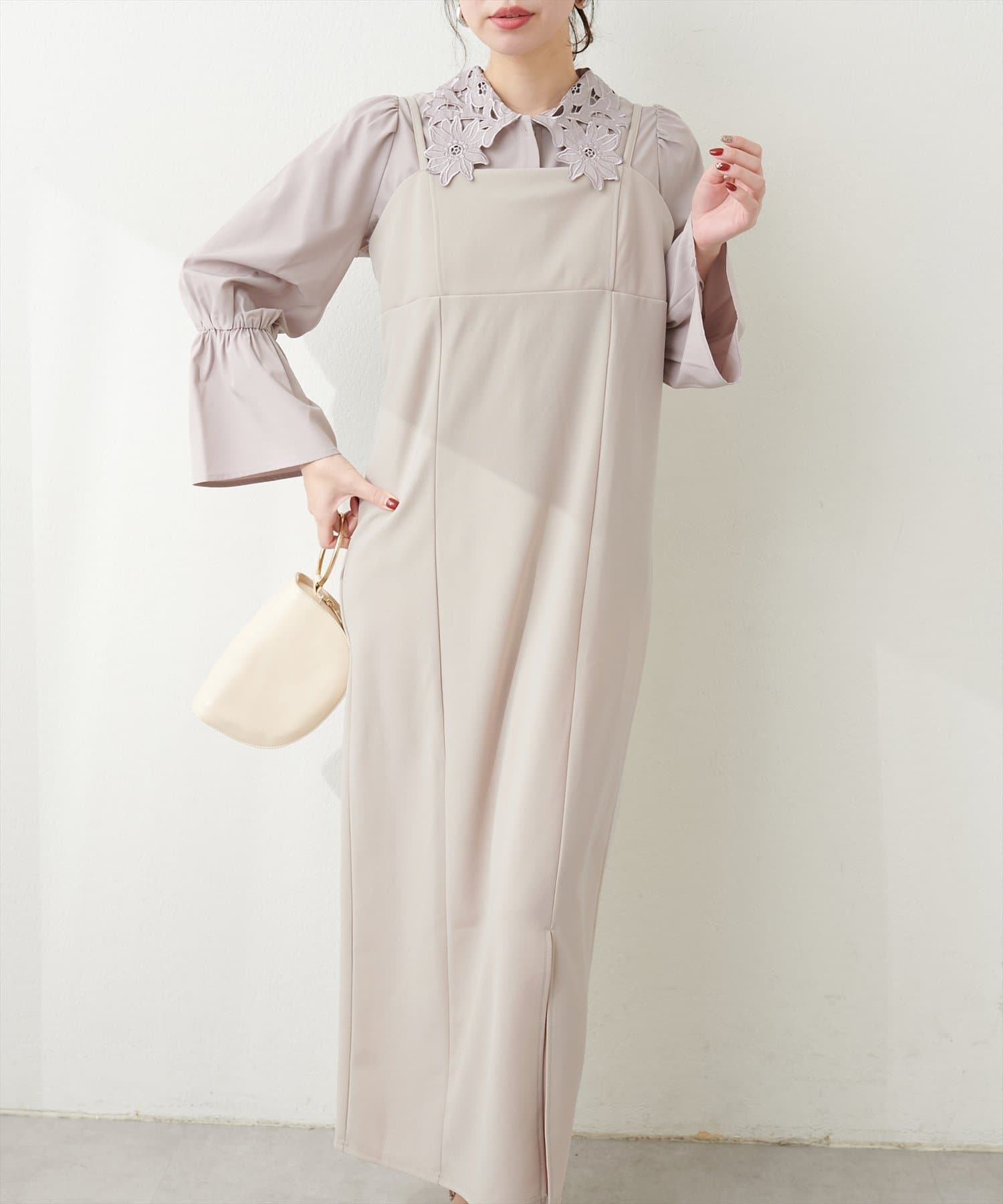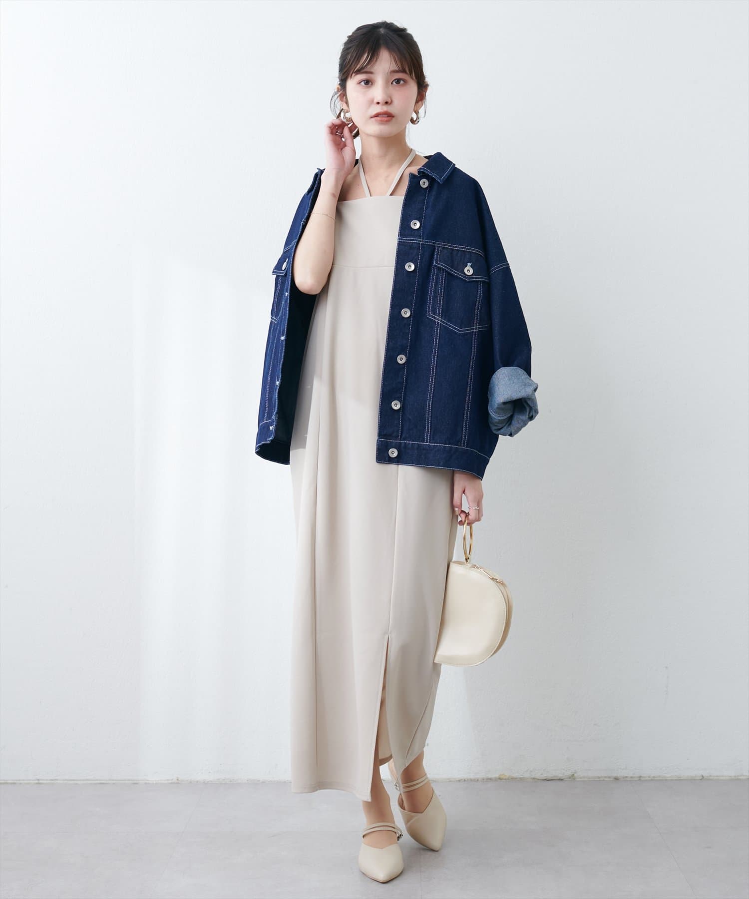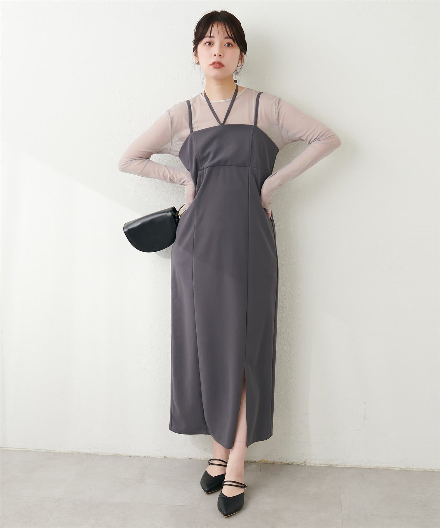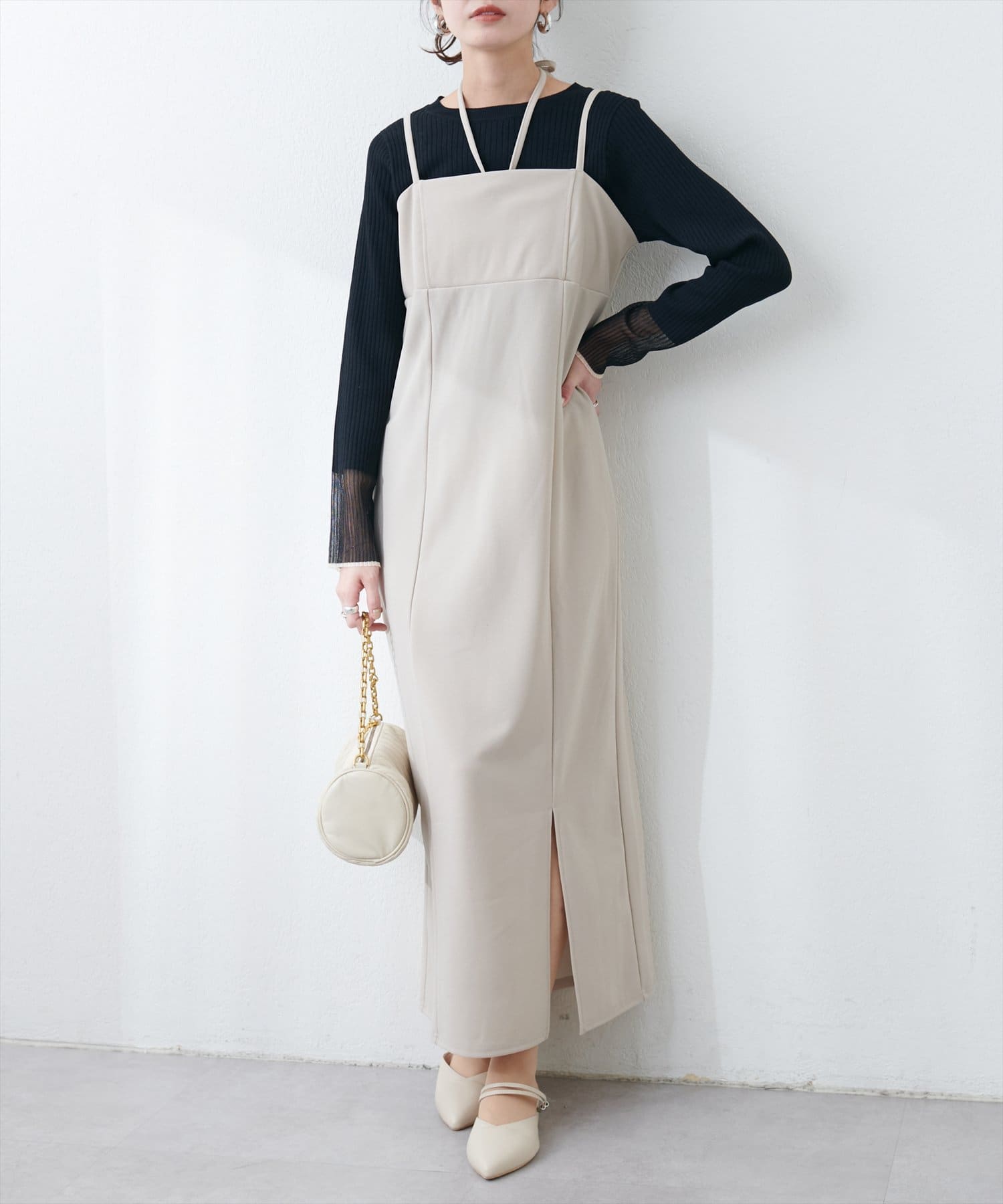 ニットなどをワンピの上に着て、レイヤードスタイルでもきれいに決まります。