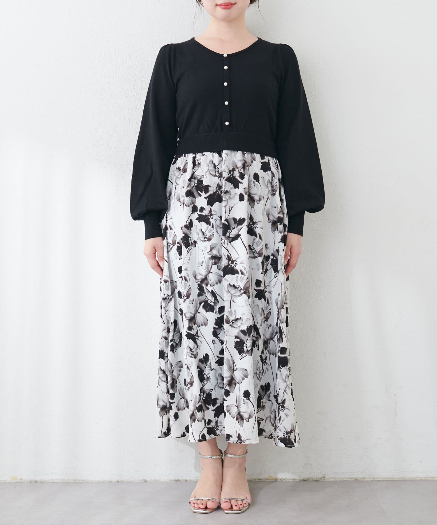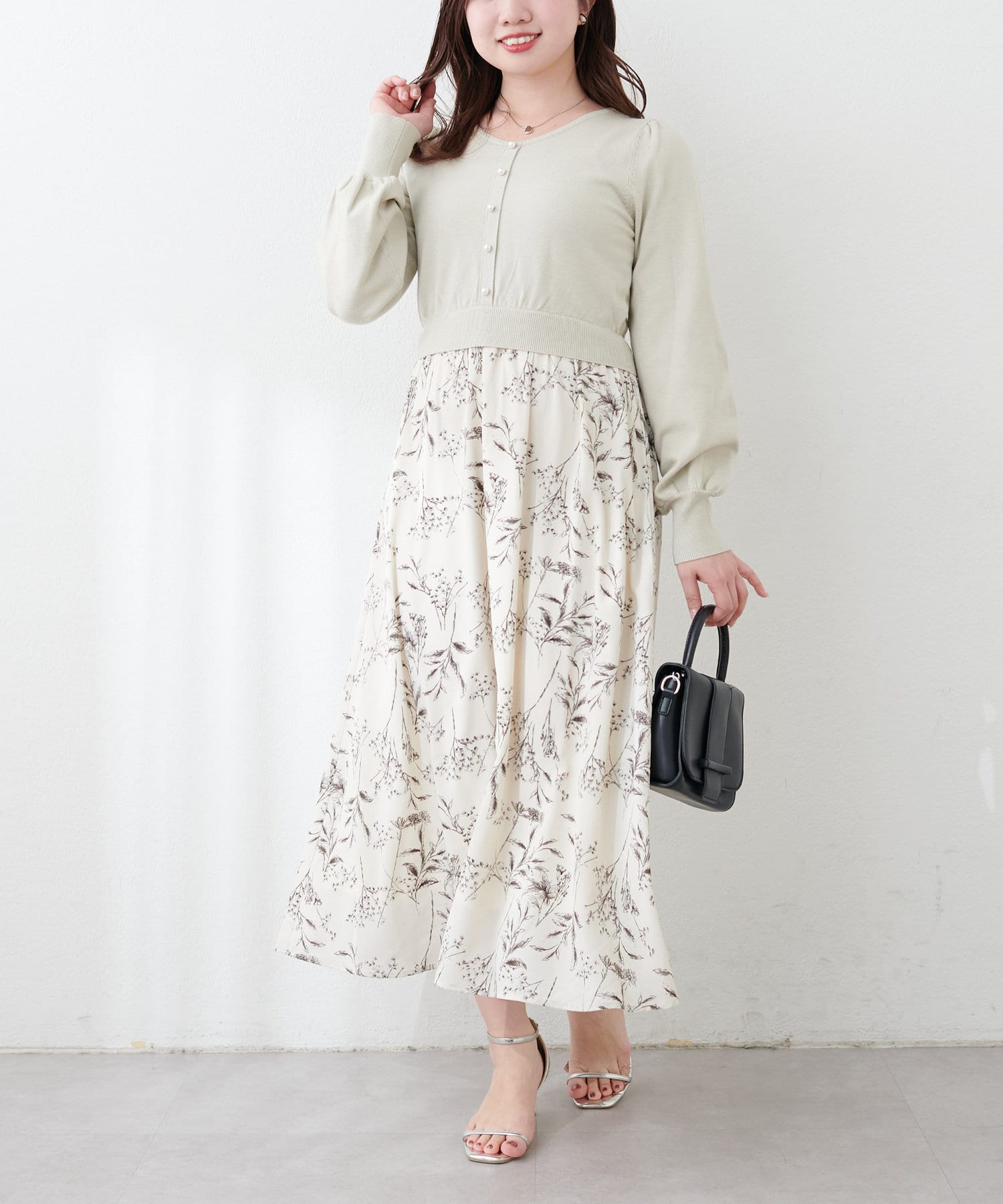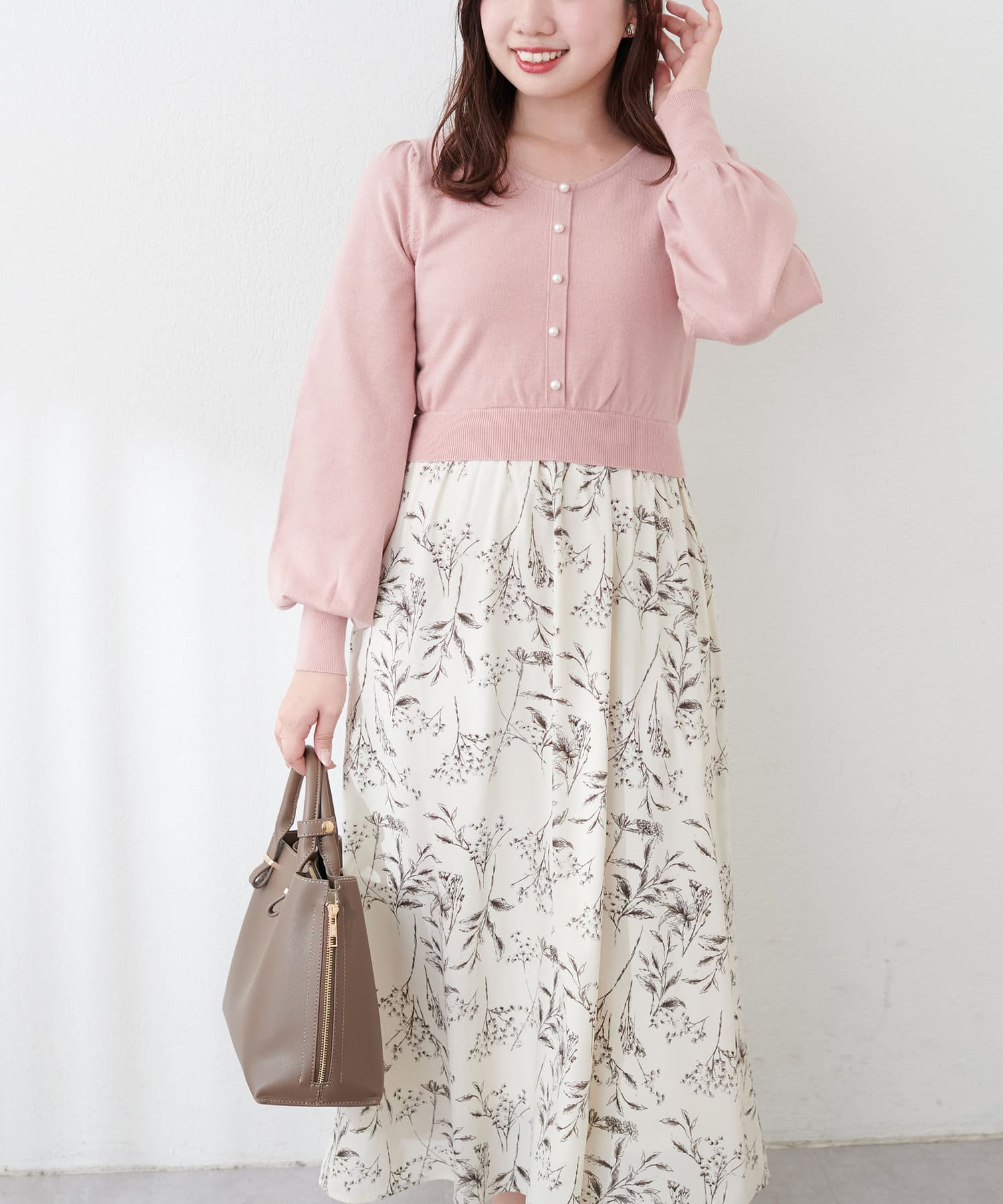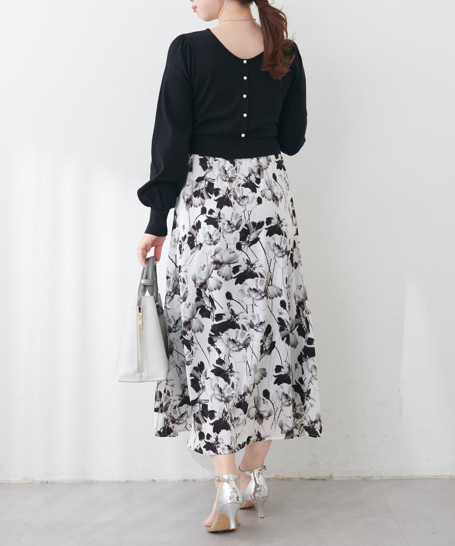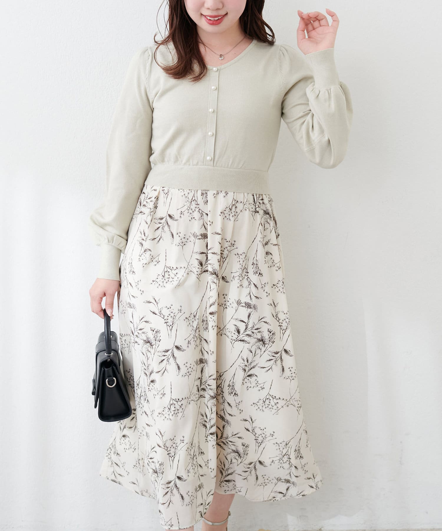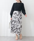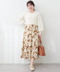 パール付ニットと花柄スカートをドッキングした大人フェミニンなワンピース。