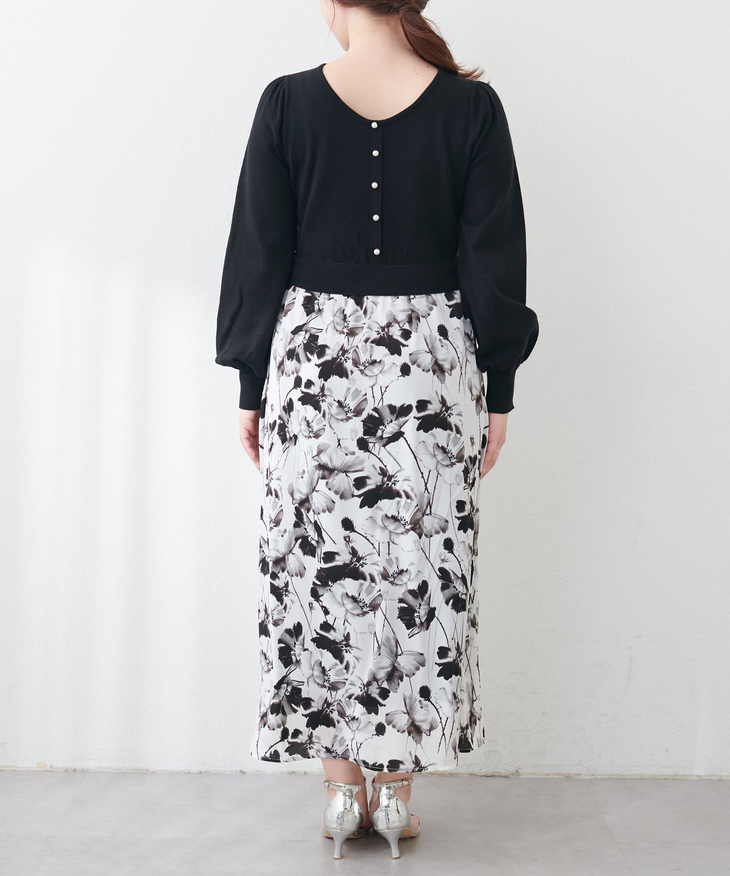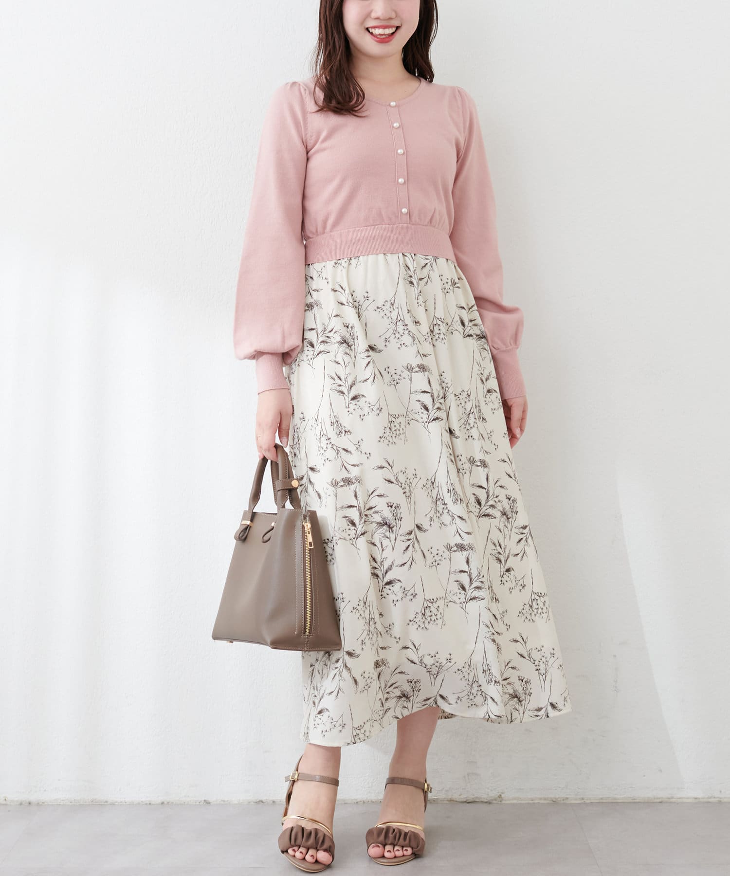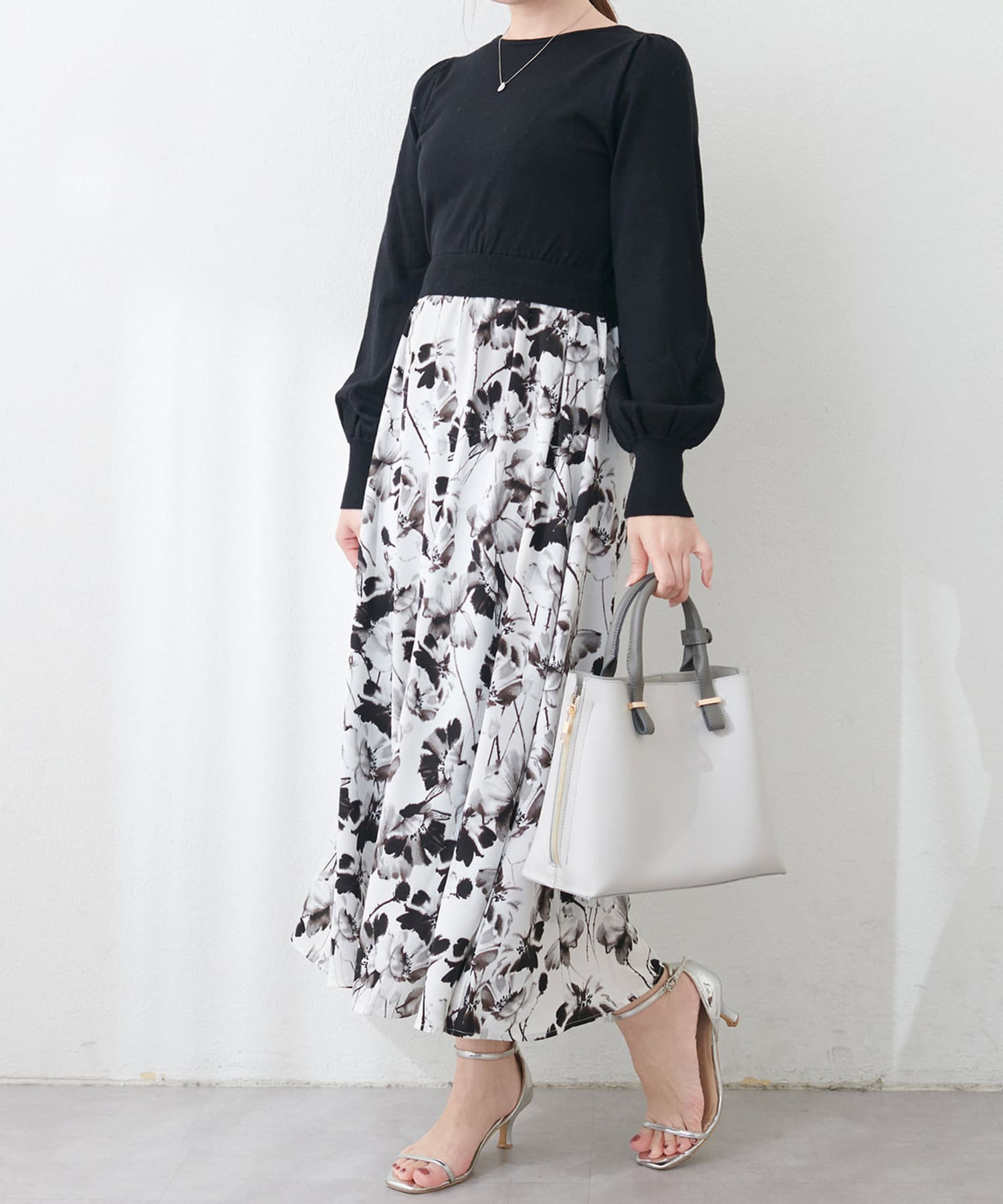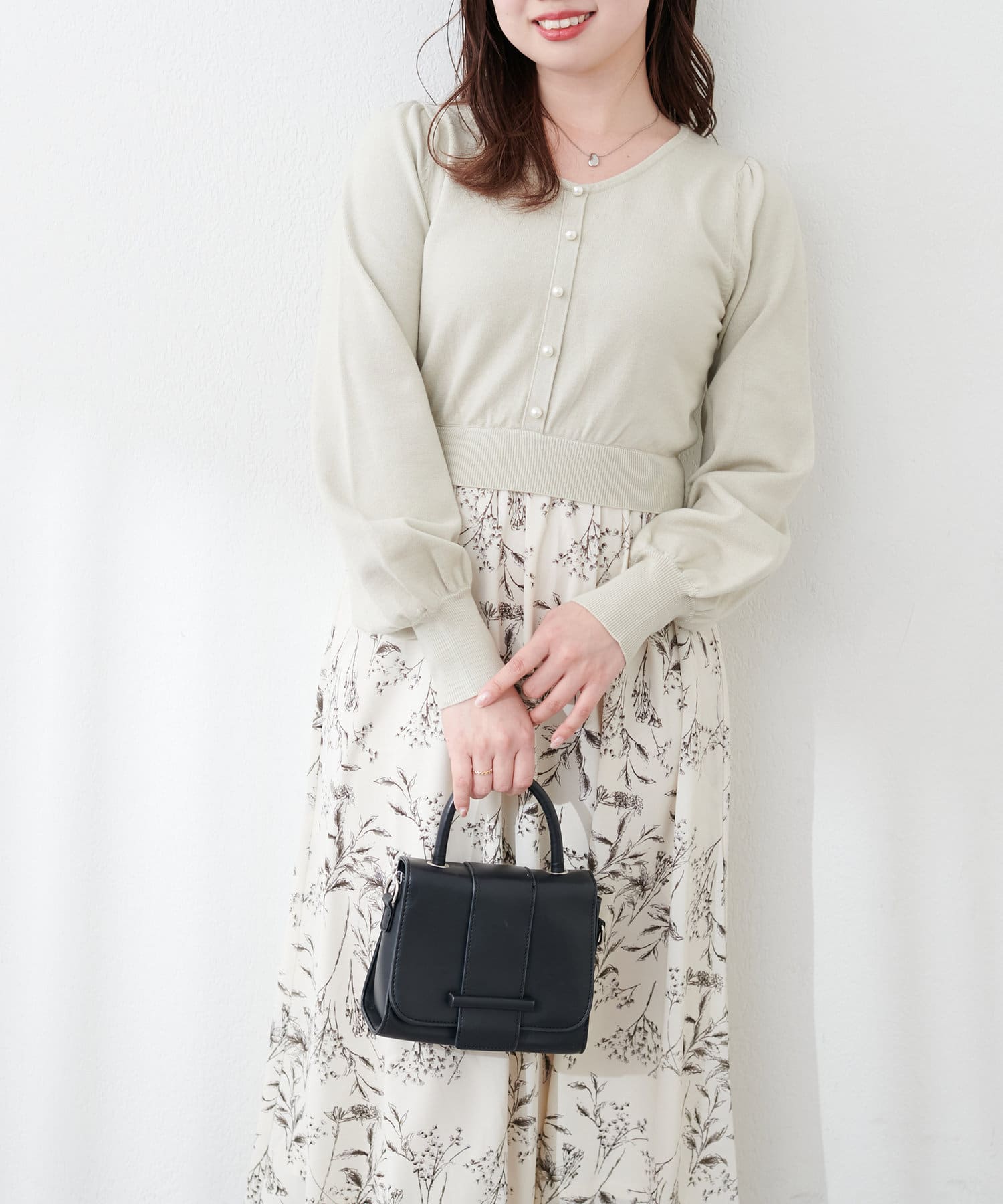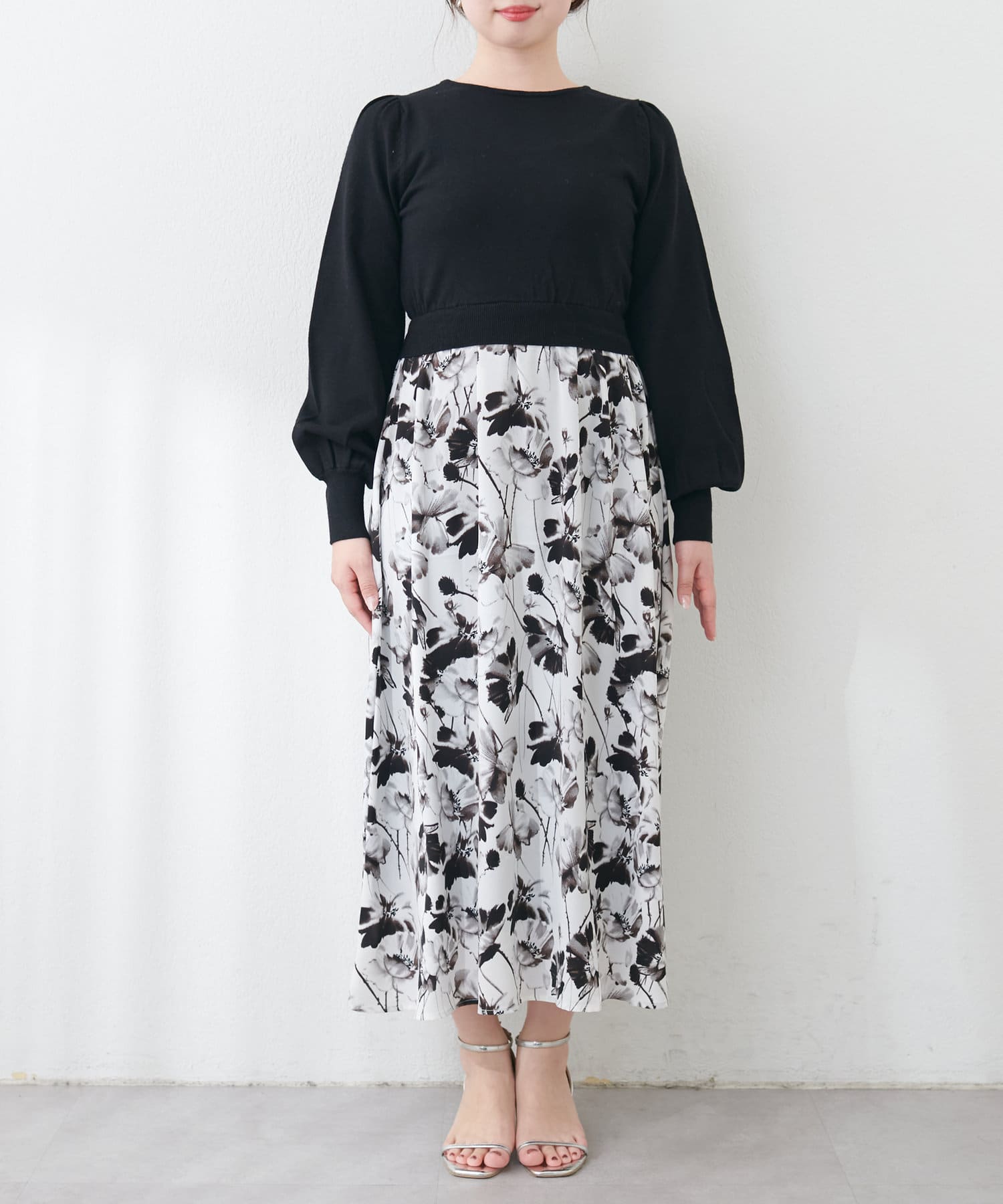 パール付ニットと花柄スカートをドッキングした大人フェミニンなワンピース。