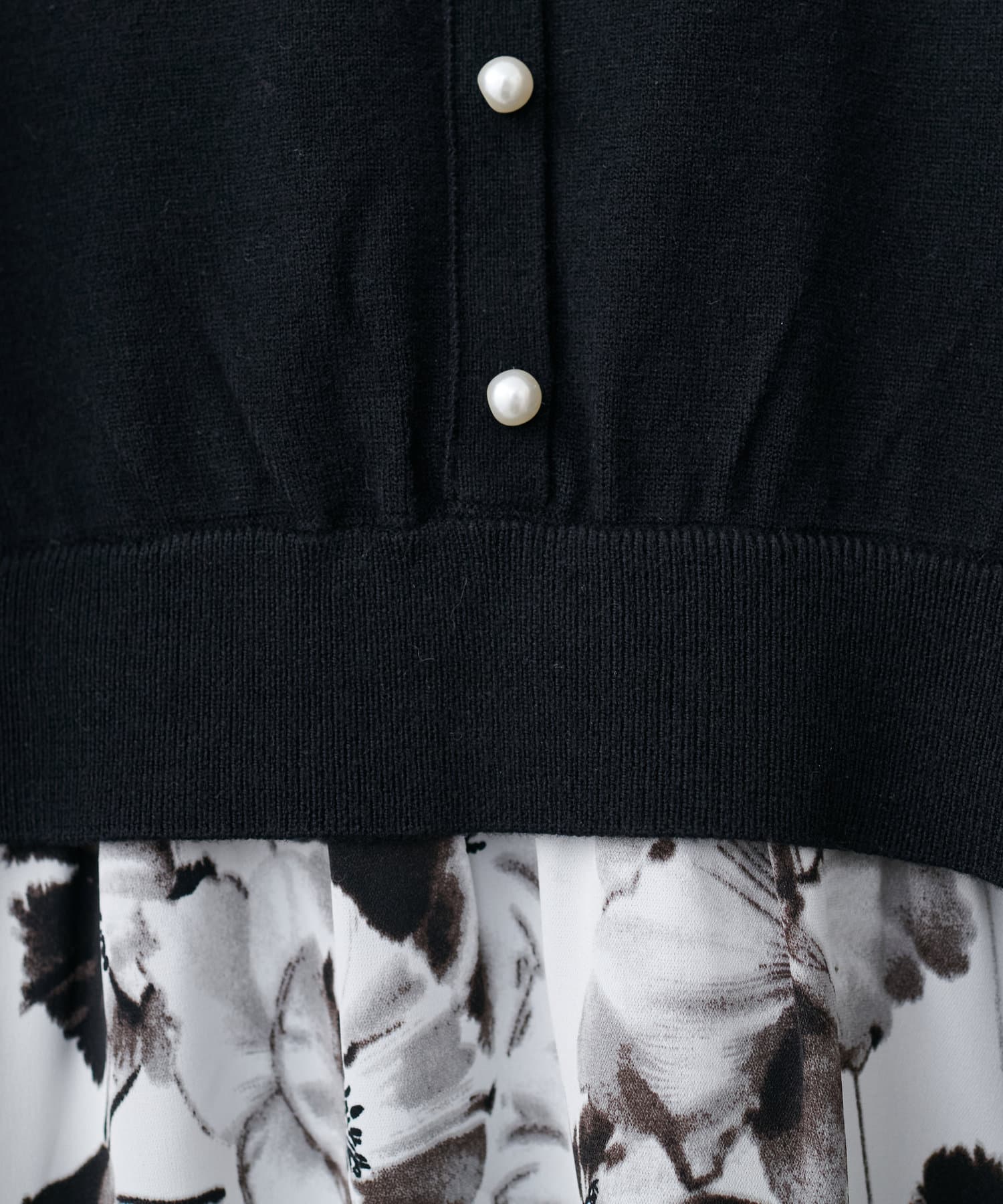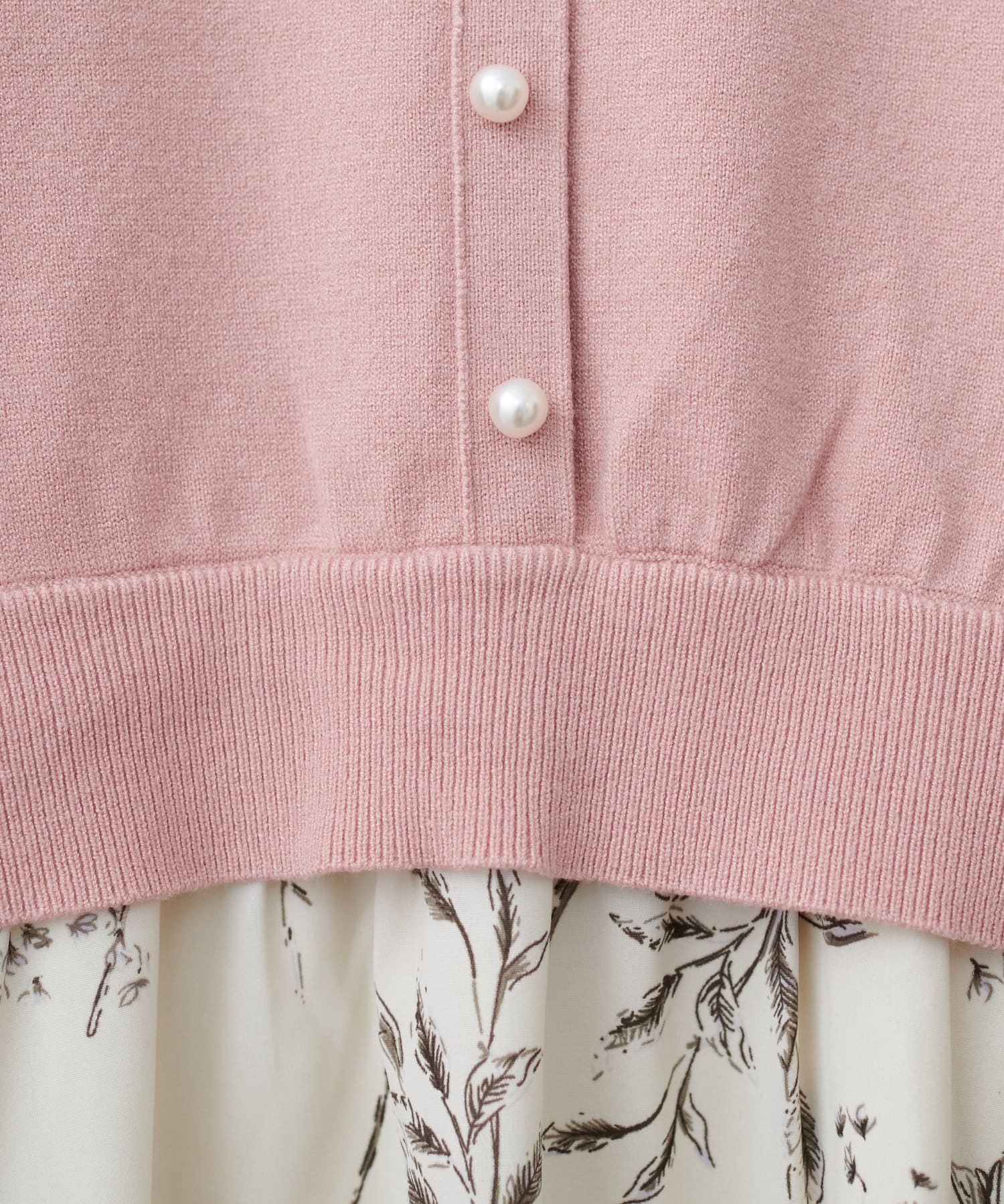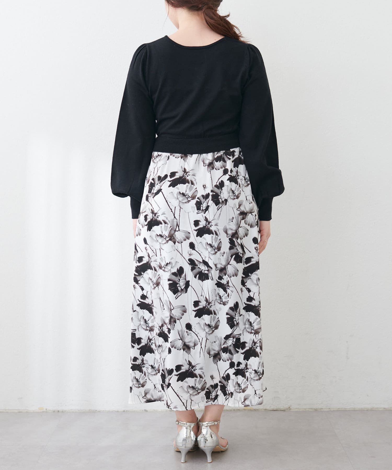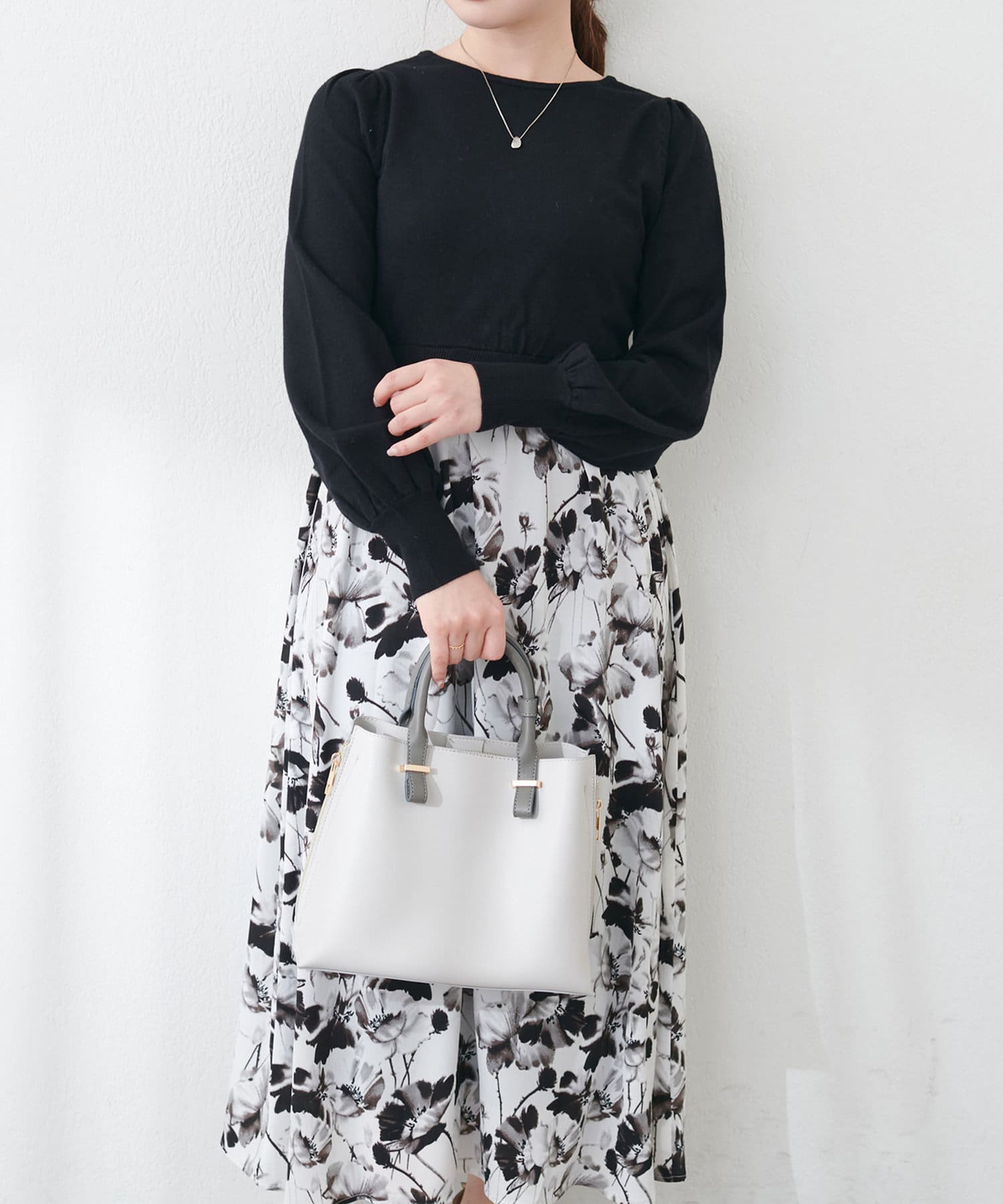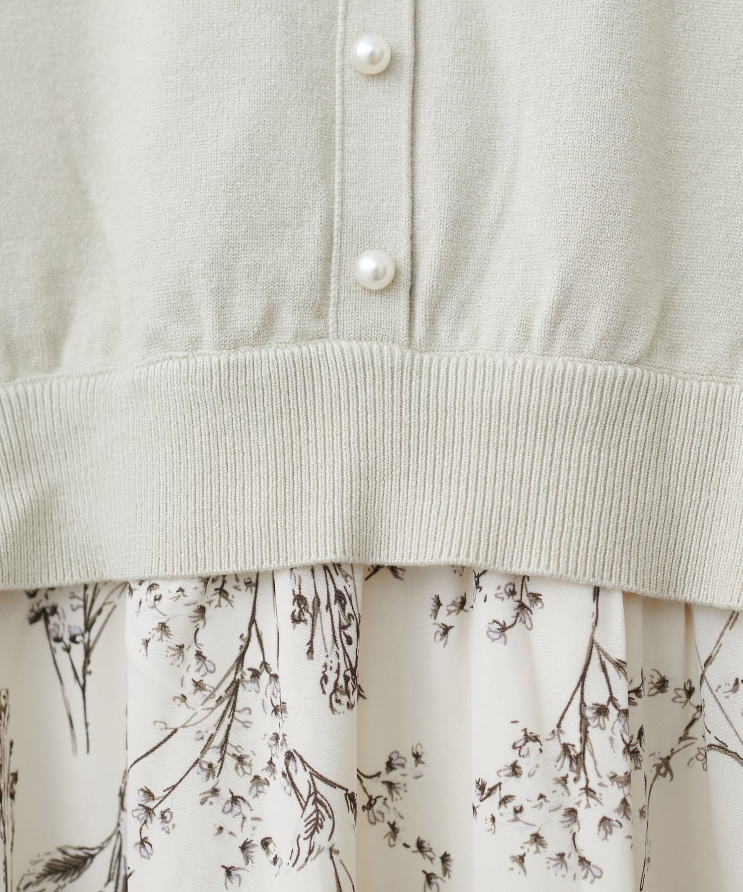 パール付ニットと花柄スカートをドッキングした大人フェミニンなワンピース。