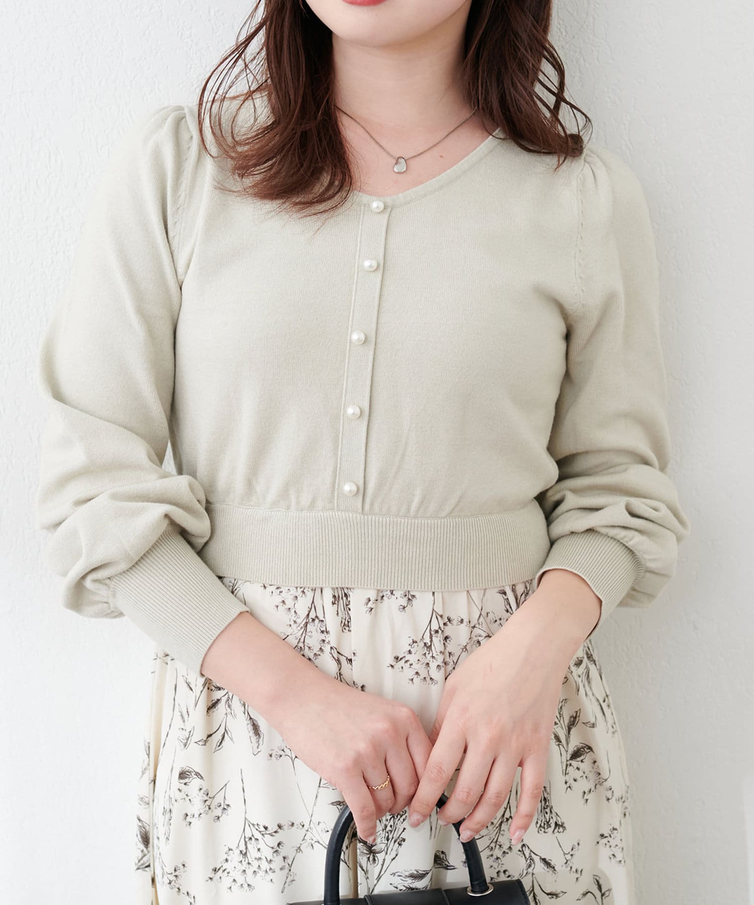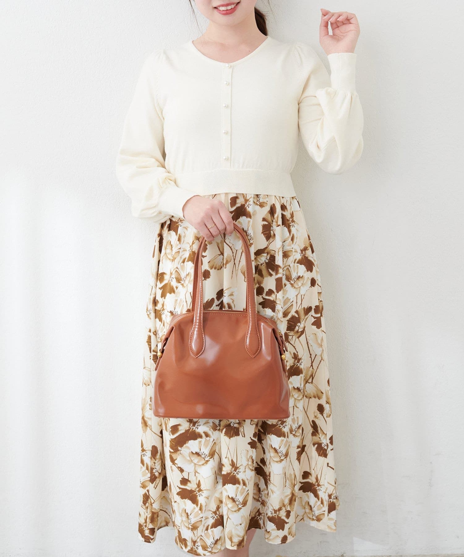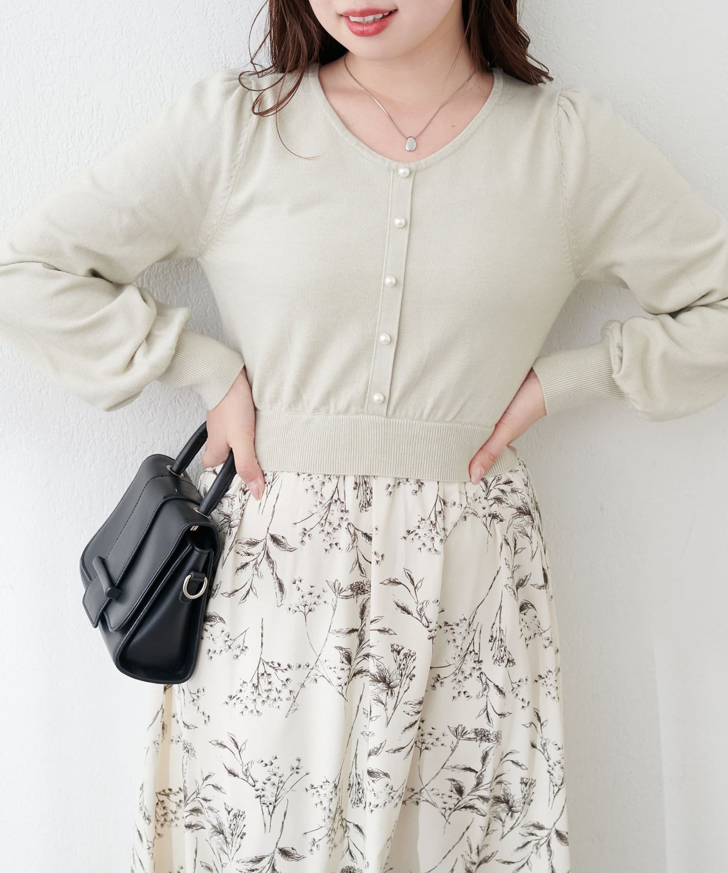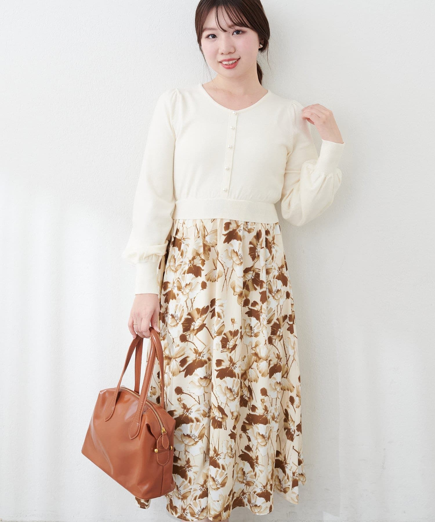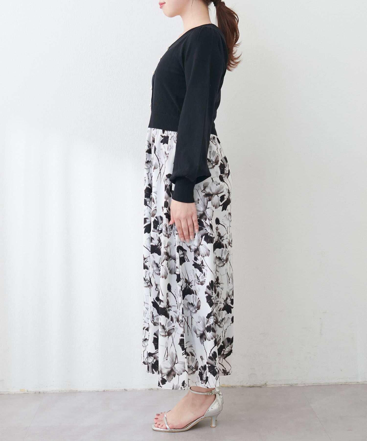 パール付ニットと花柄スカートをドッキングした大人フェミニンなワンピース。