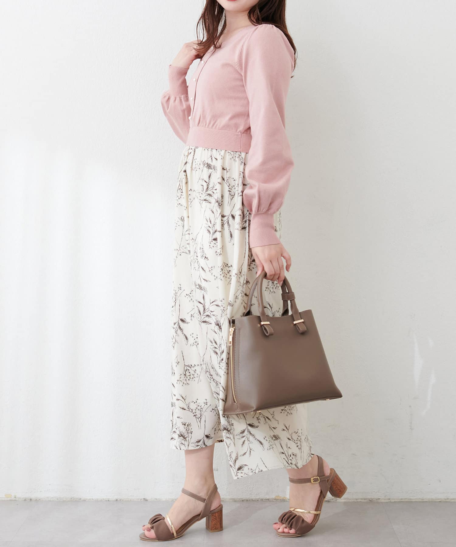 ニットとメリハリの出るスカートは、ひらっと動くフェニミンムードな花柄を使用しました。