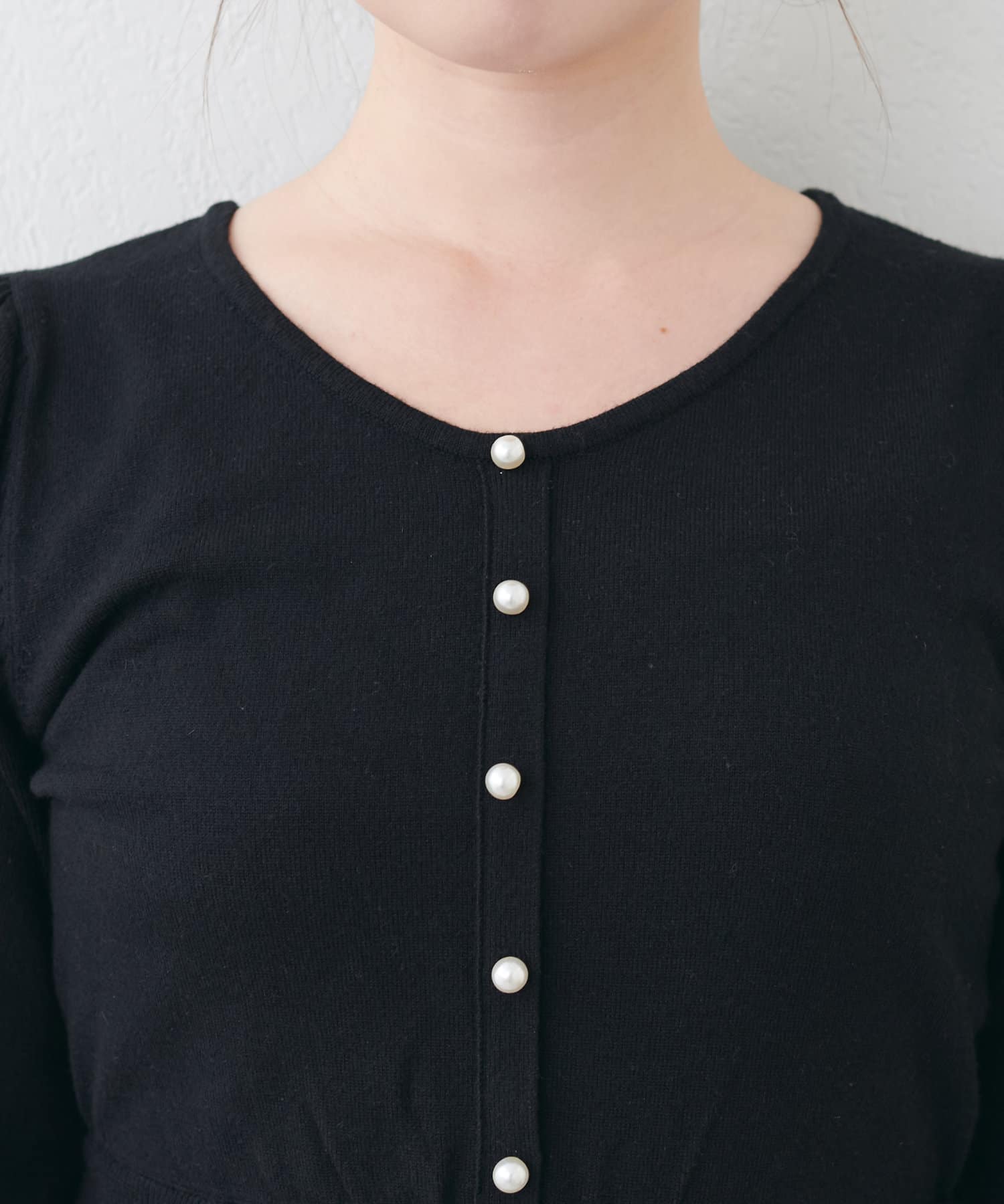 前後2way仕様で、パール装飾側はデコルテがヘルシ見えするVネックデザイン。装飾の無い側はUネックで、