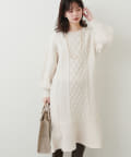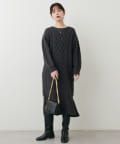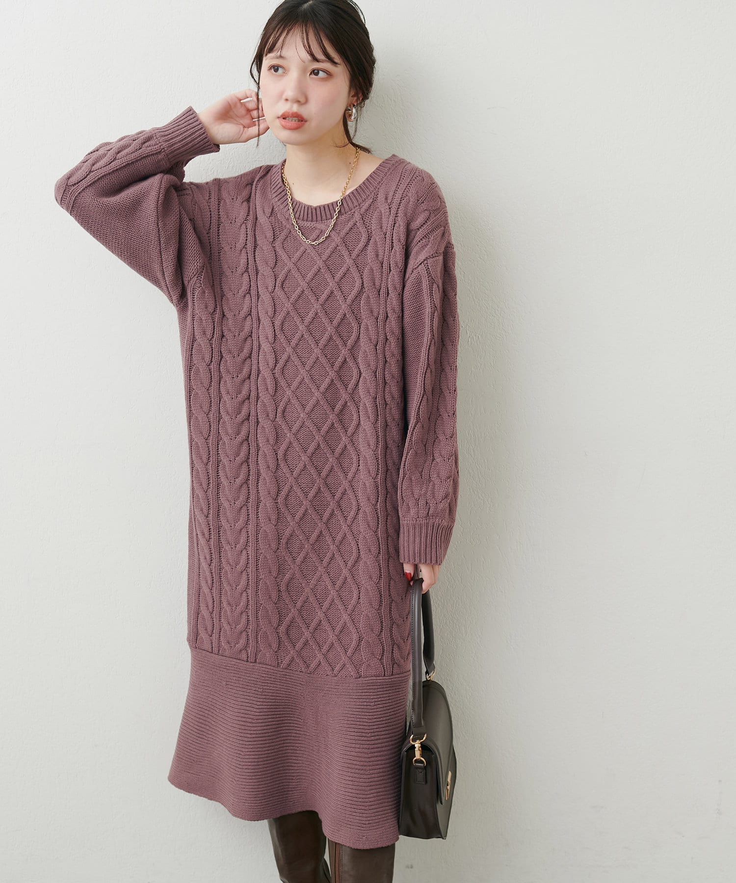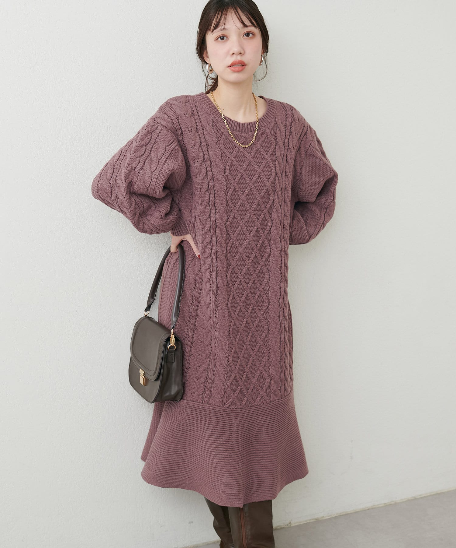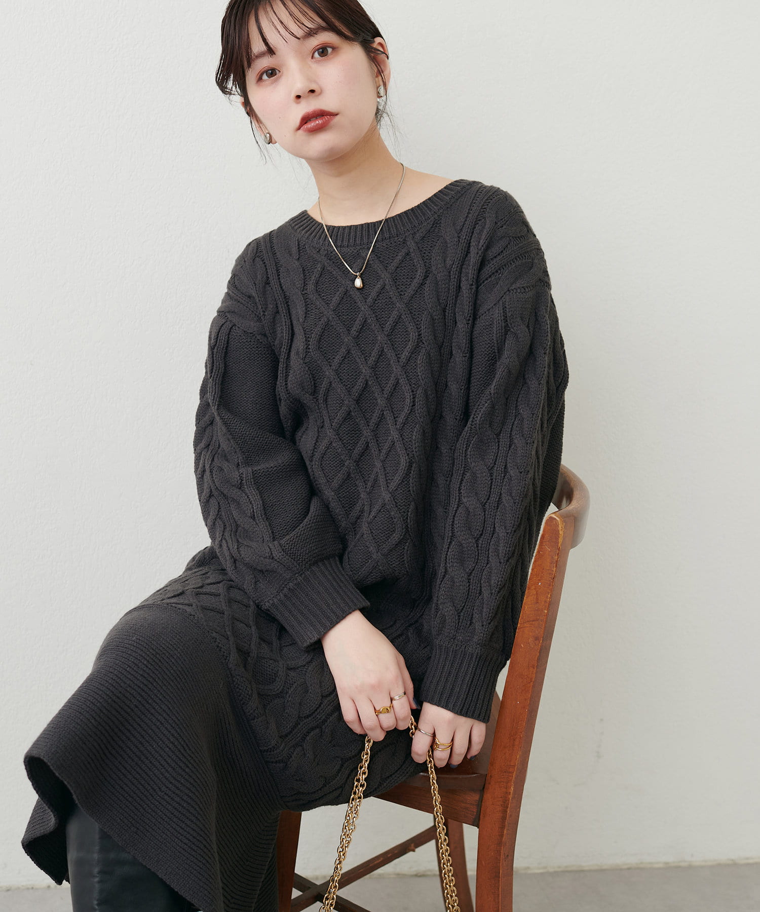 身頃と袖部分を暖かみのあるケーブル編みで仕立てた、