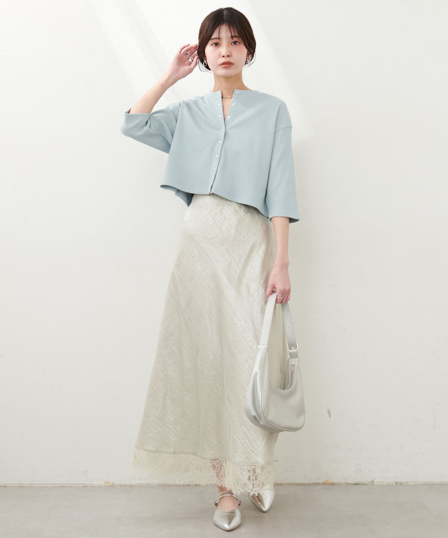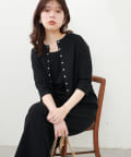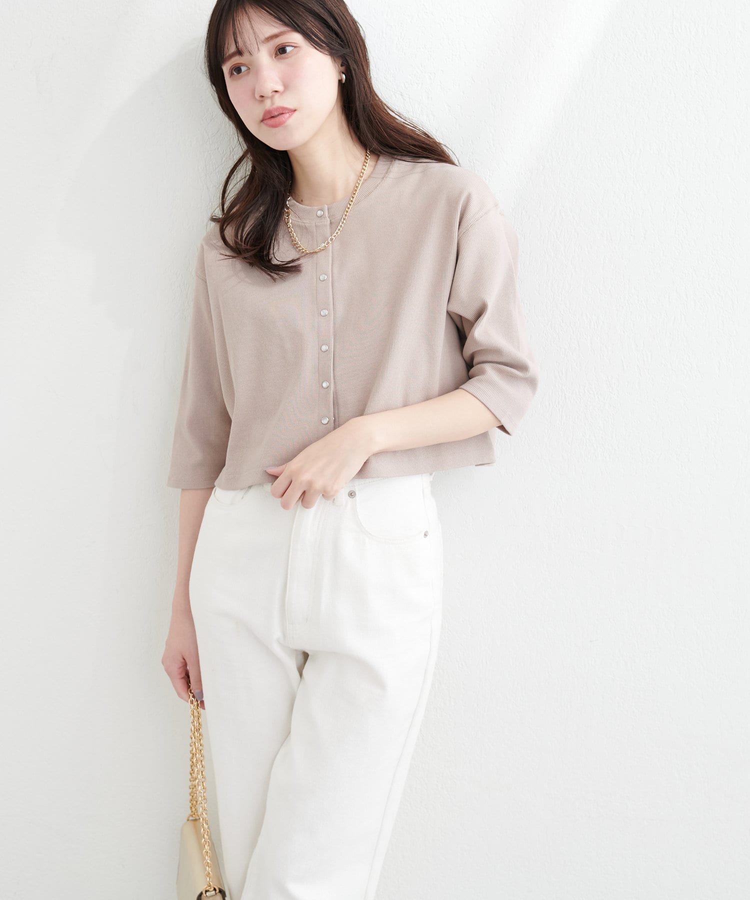 カーディガンはショート丈でスタイルアップし、ツヤっとしたボタンがアクセントに。