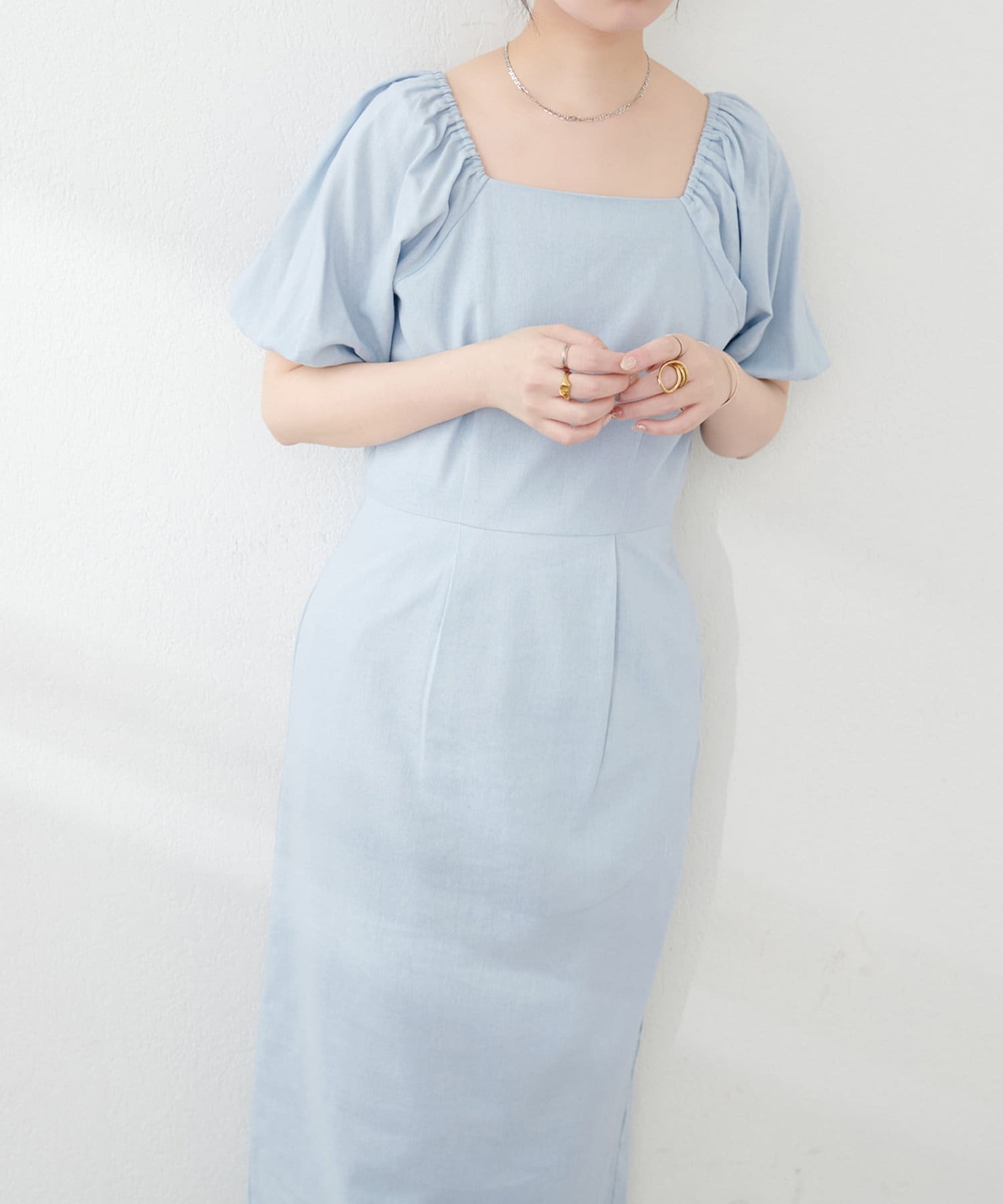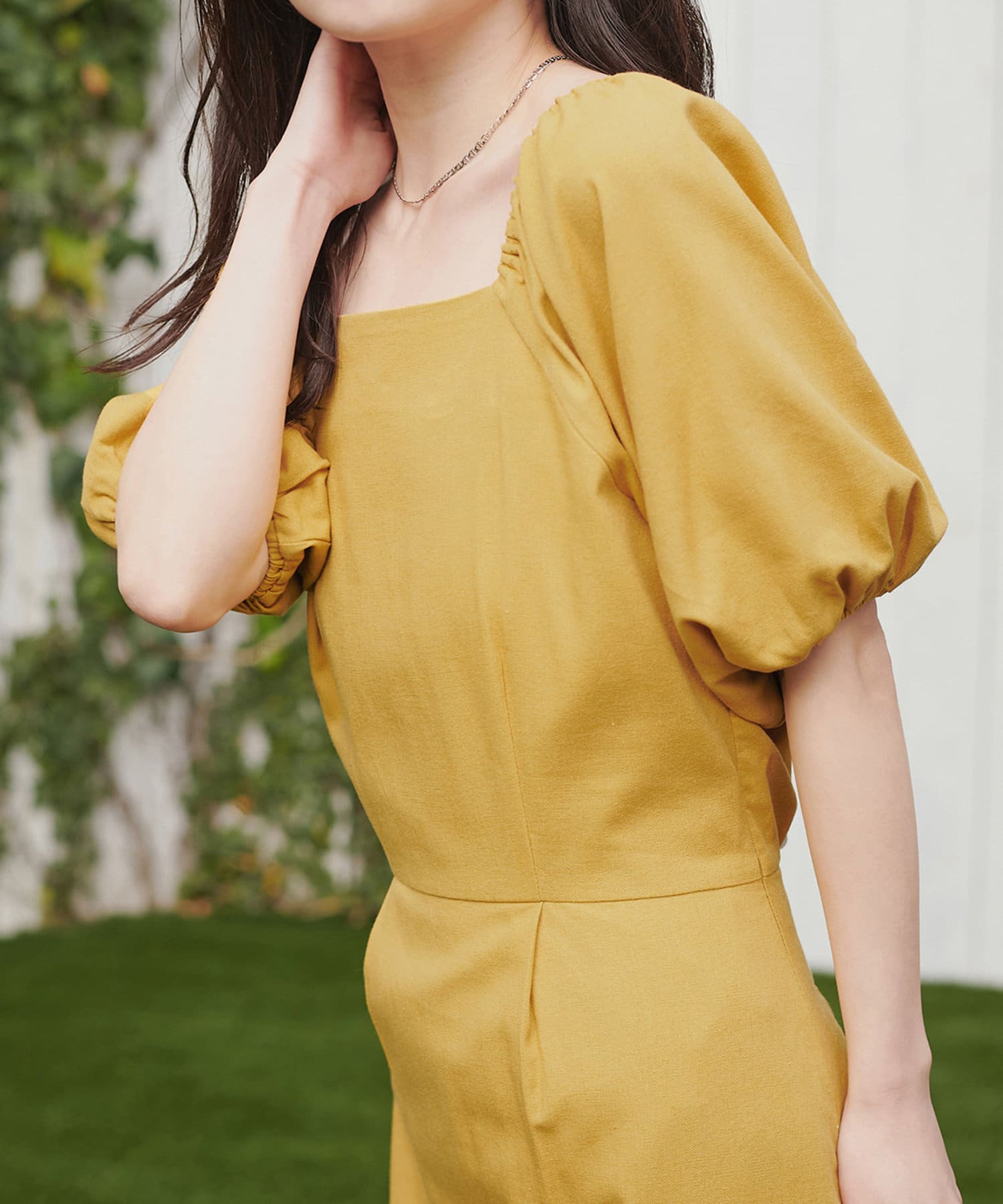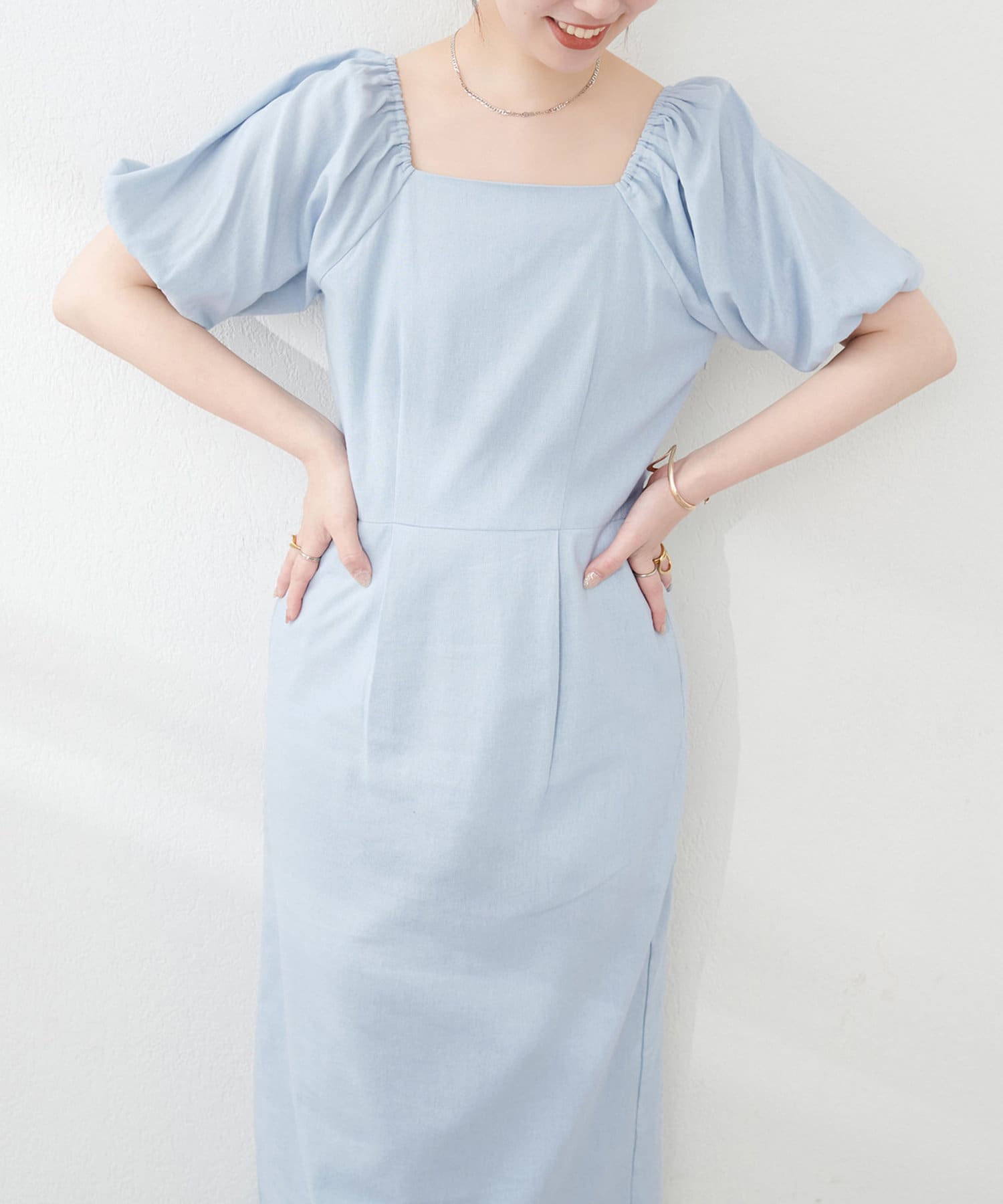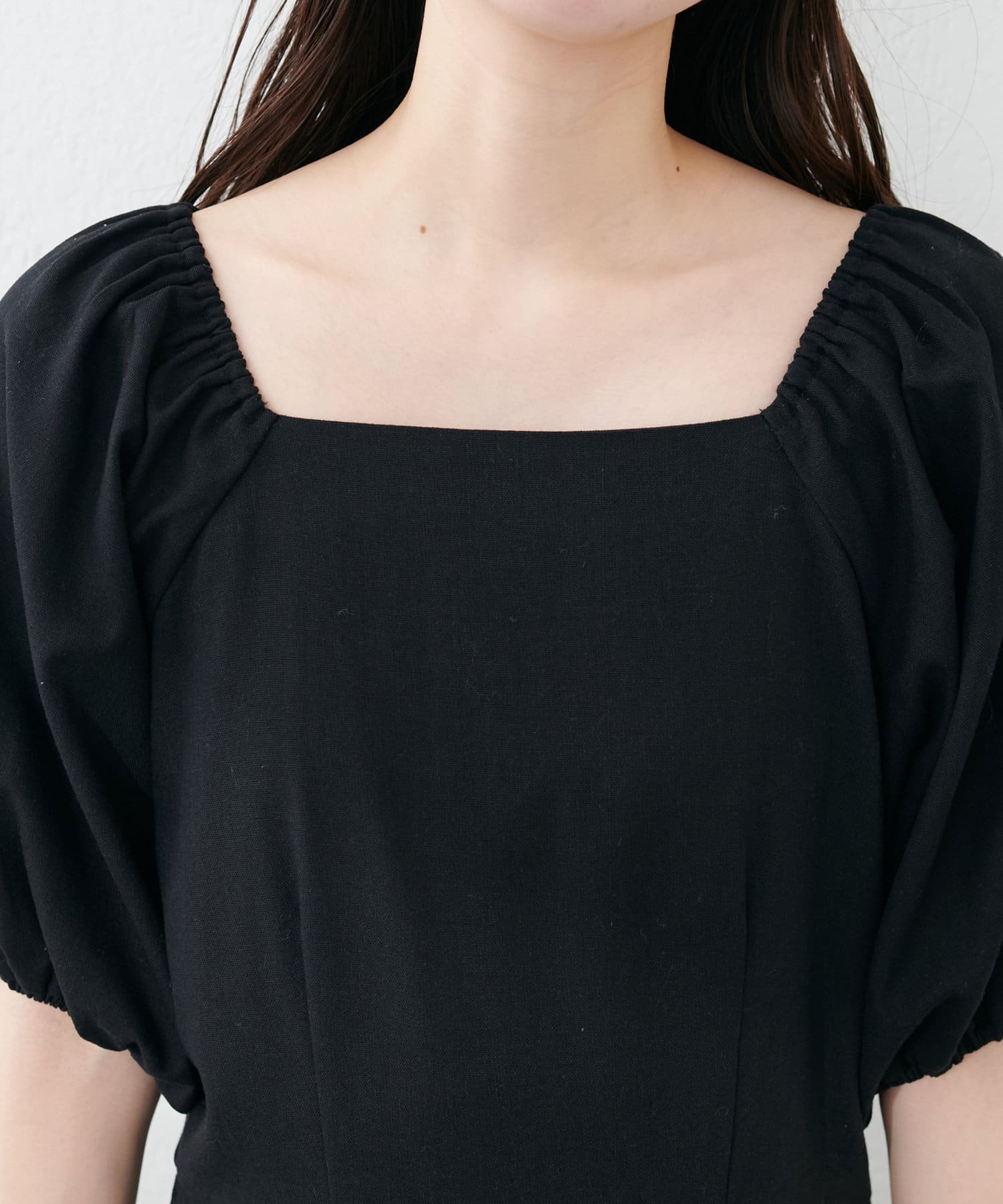 内側から始まるボリューム袖は対比で肘下を細く見せてくれたり、スクエアネックで小顔効果も…◎