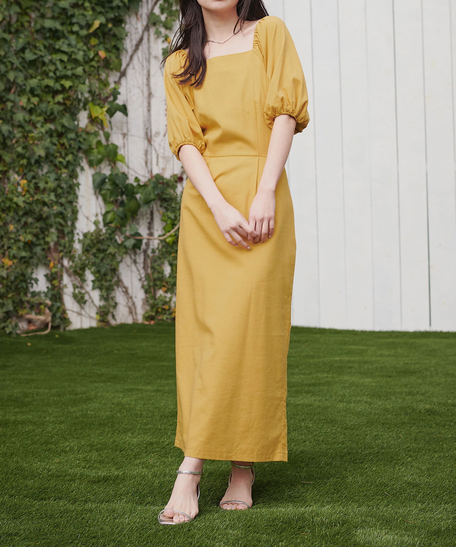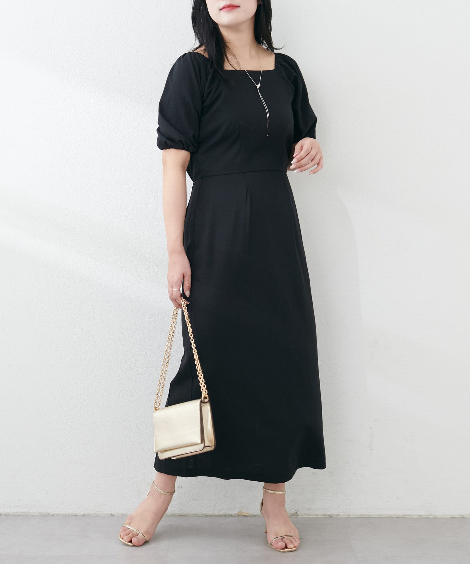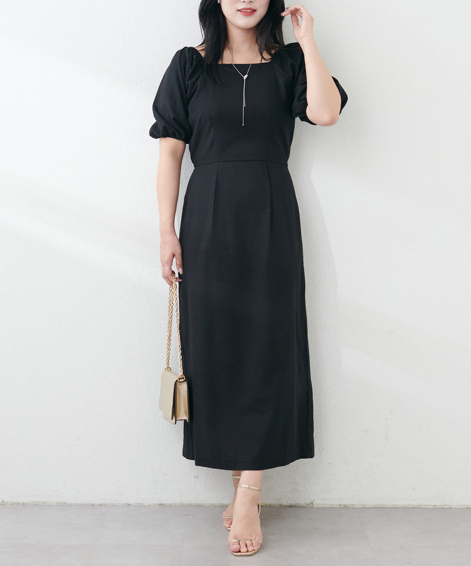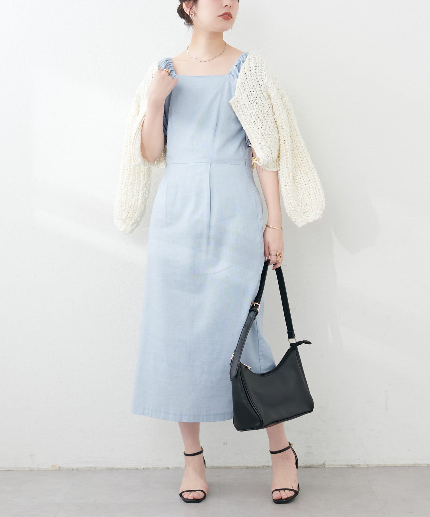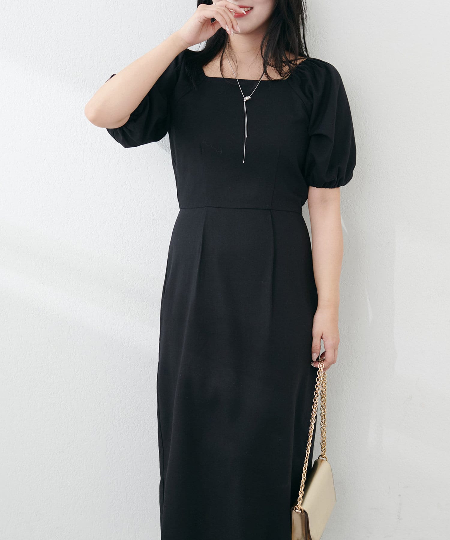 内側から始まるボリューム袖は対比で肘下を細く見せてくれたり、スクエアネックで小顔効果も…◎