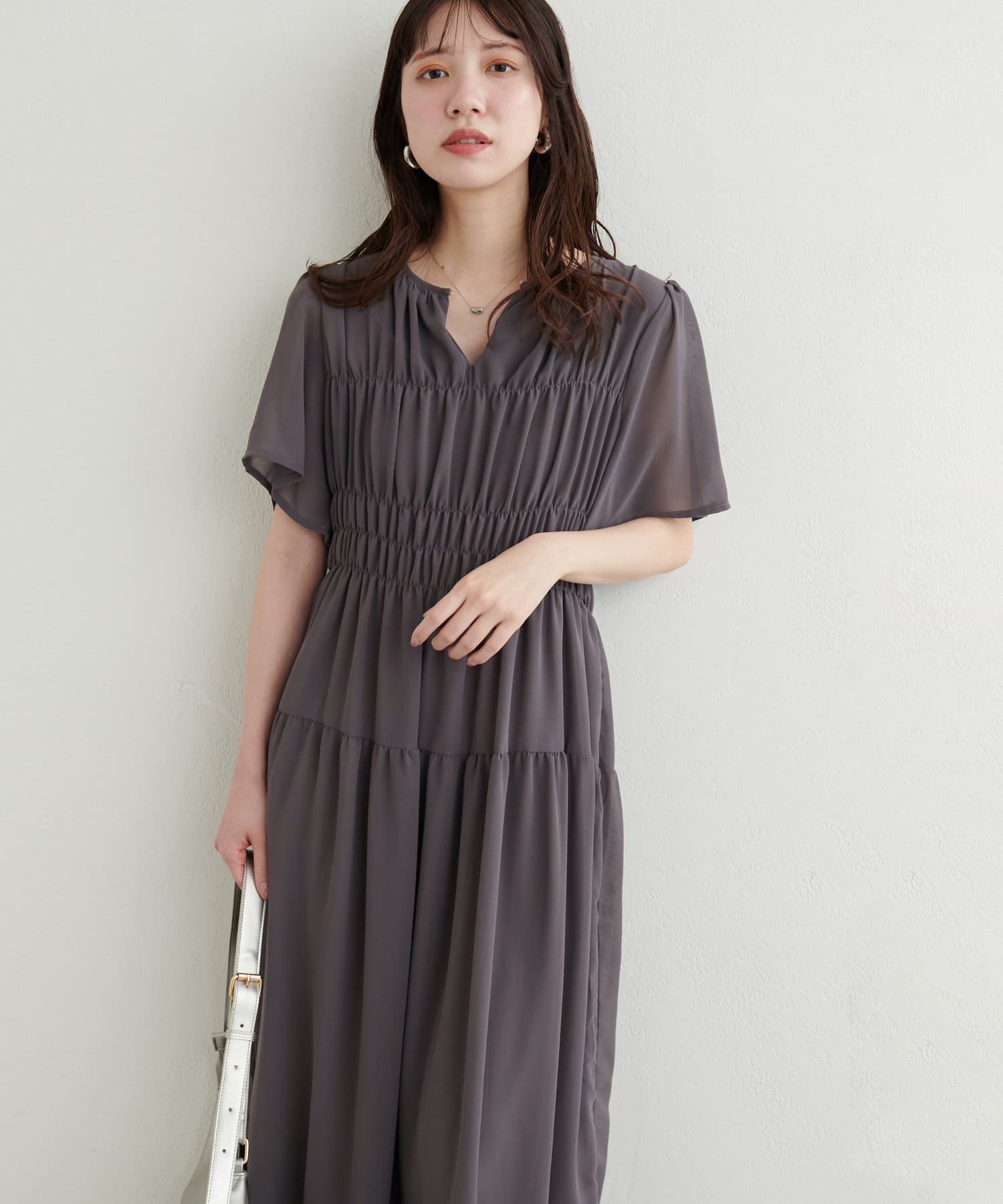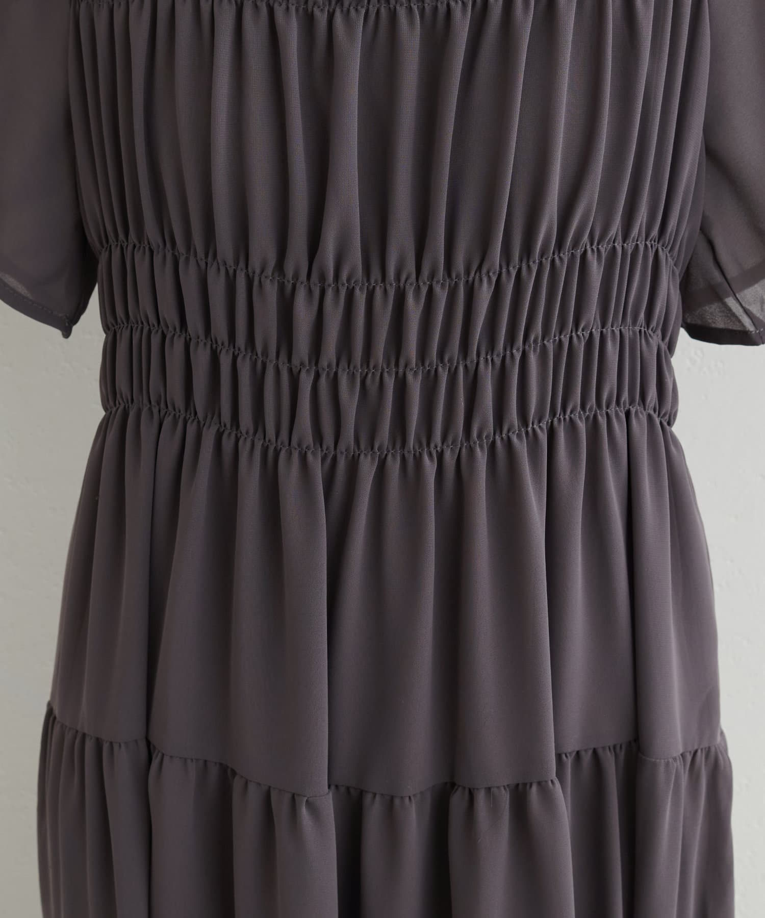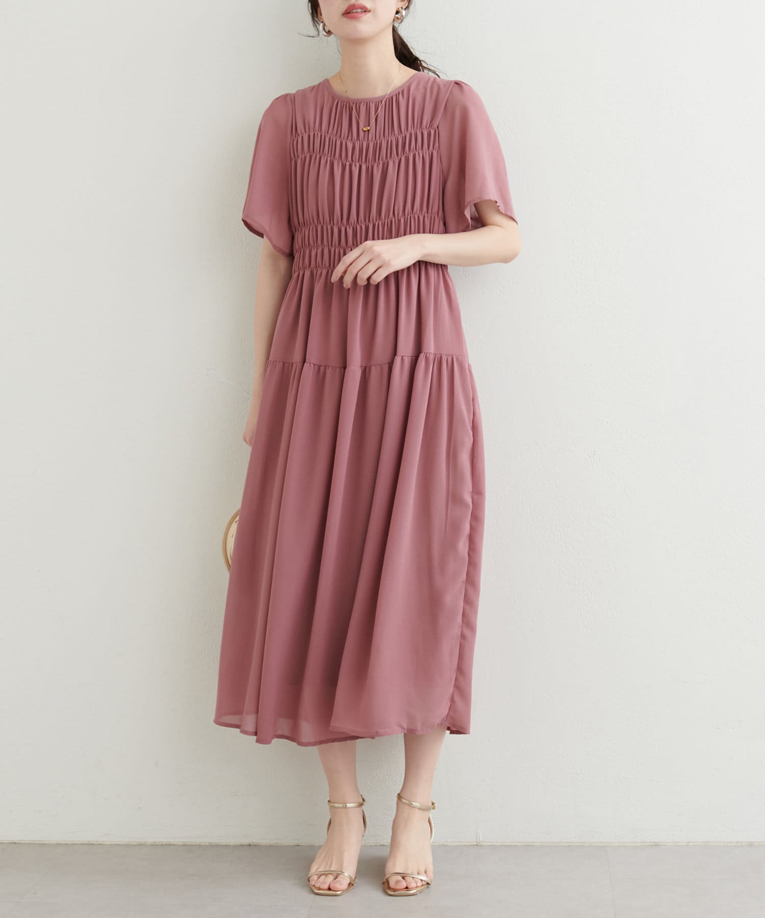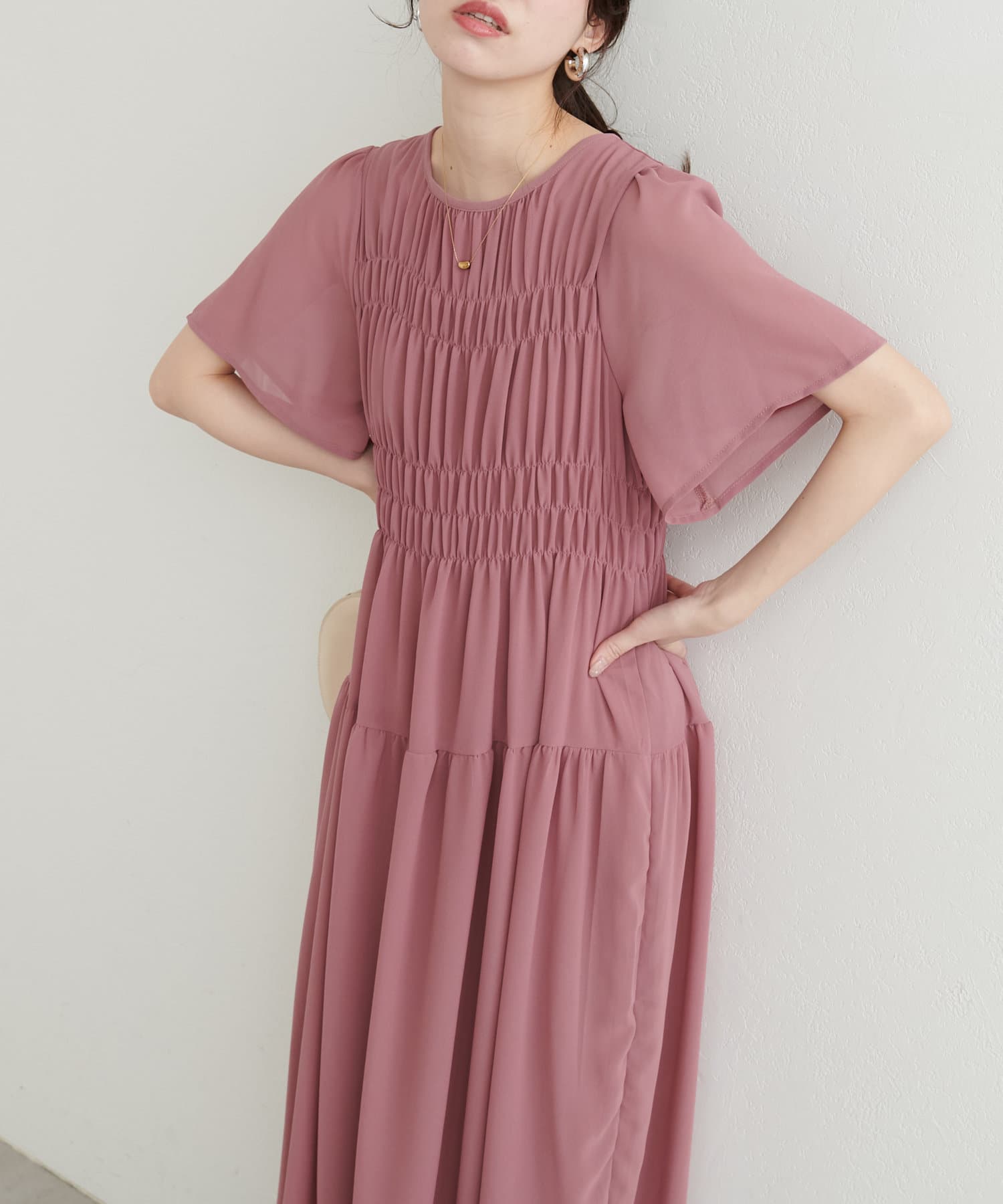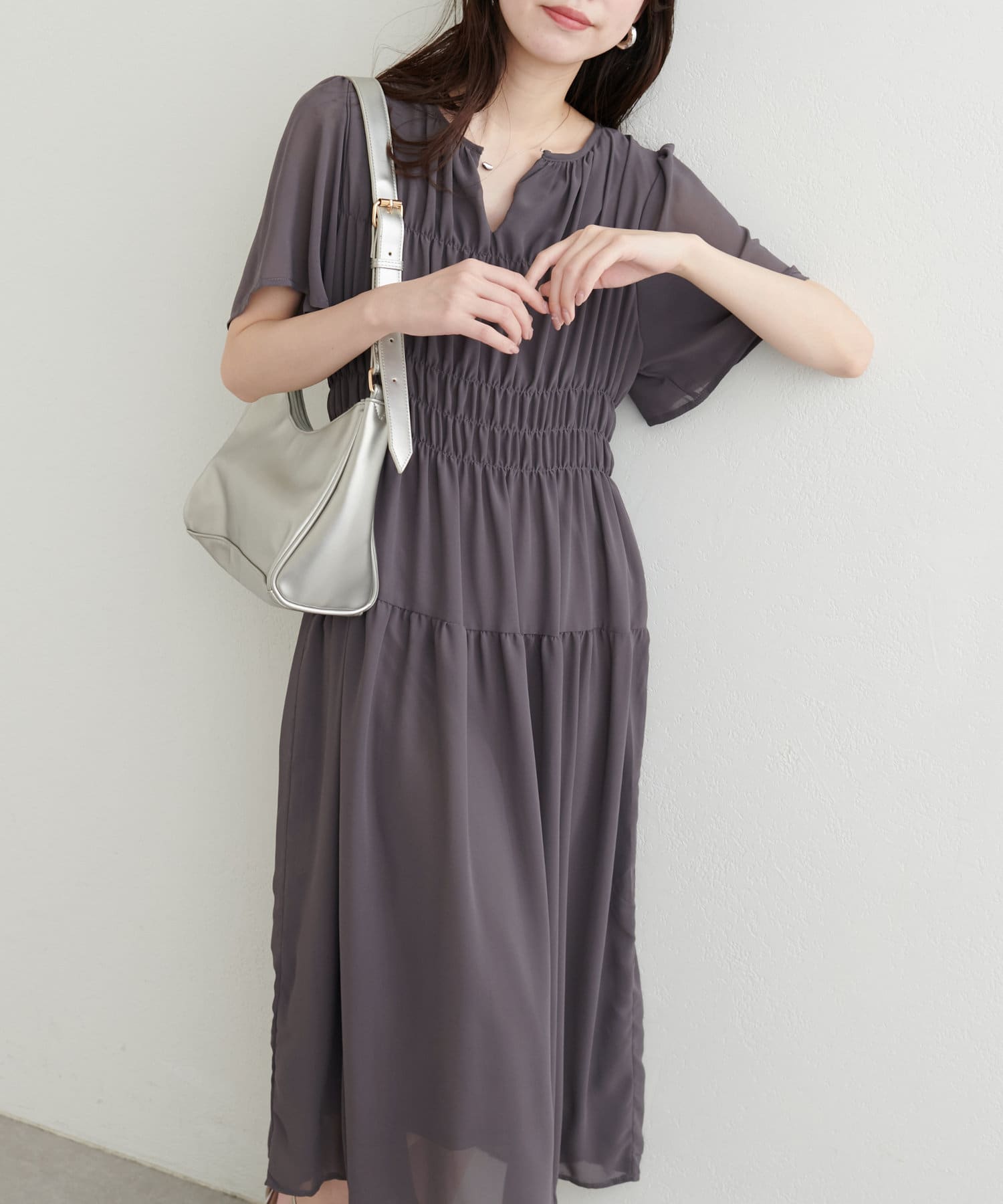 見頃部分にたっぷりシャーリングの入ったワンピース。