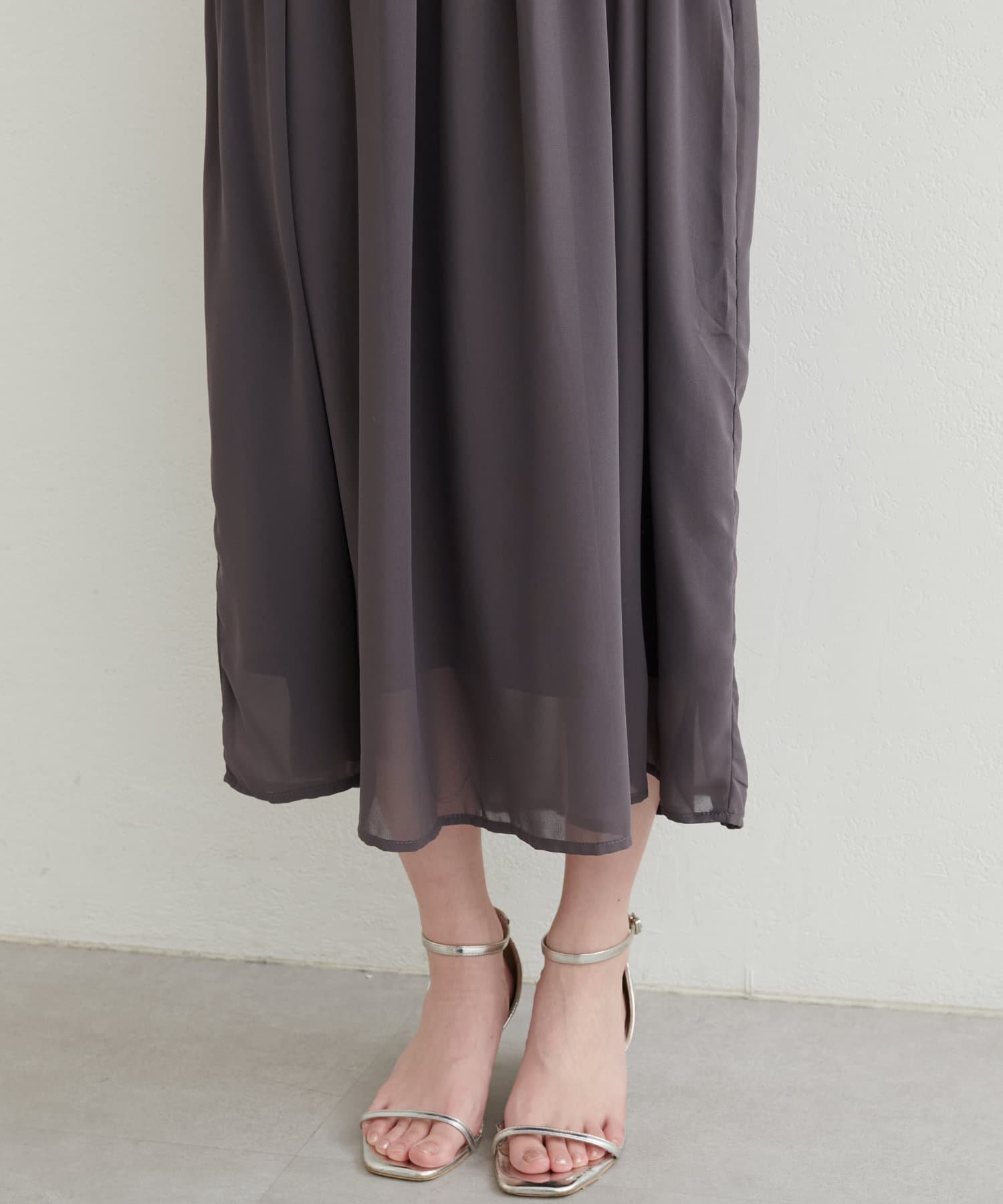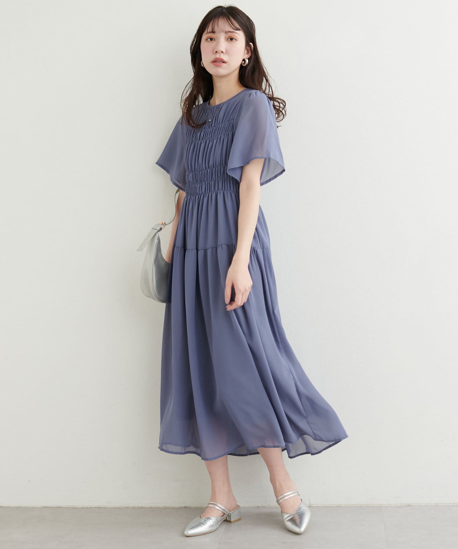 見頃部分のシャーリングと裾にむかってフワッと広がるシルエットでキレイなラインに。