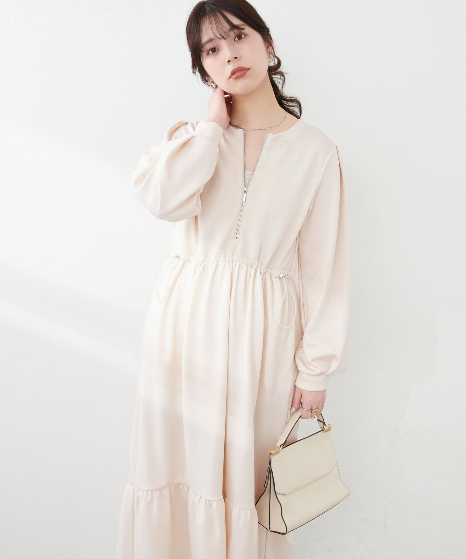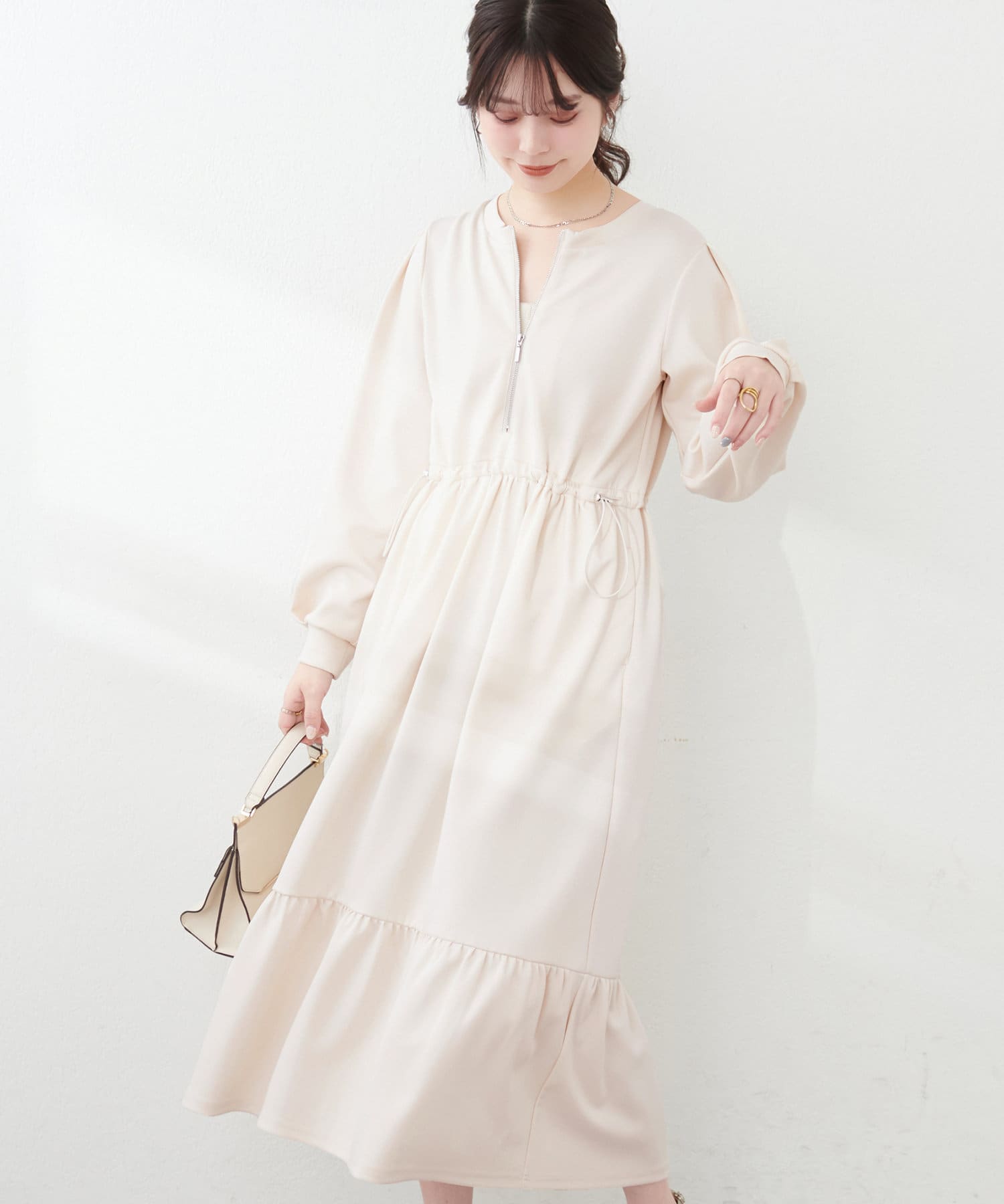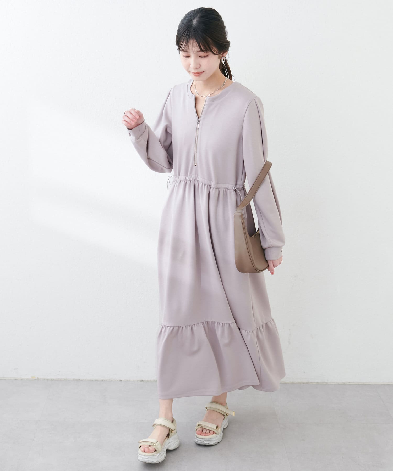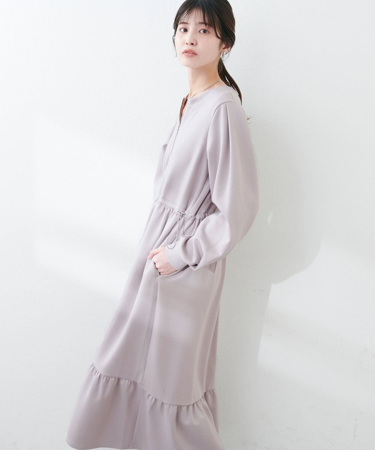 ドロストとハーフジップでトレンドを取り入れ、ギャザーと裾のティアードでディテールを効かせてレディライクな印象に。