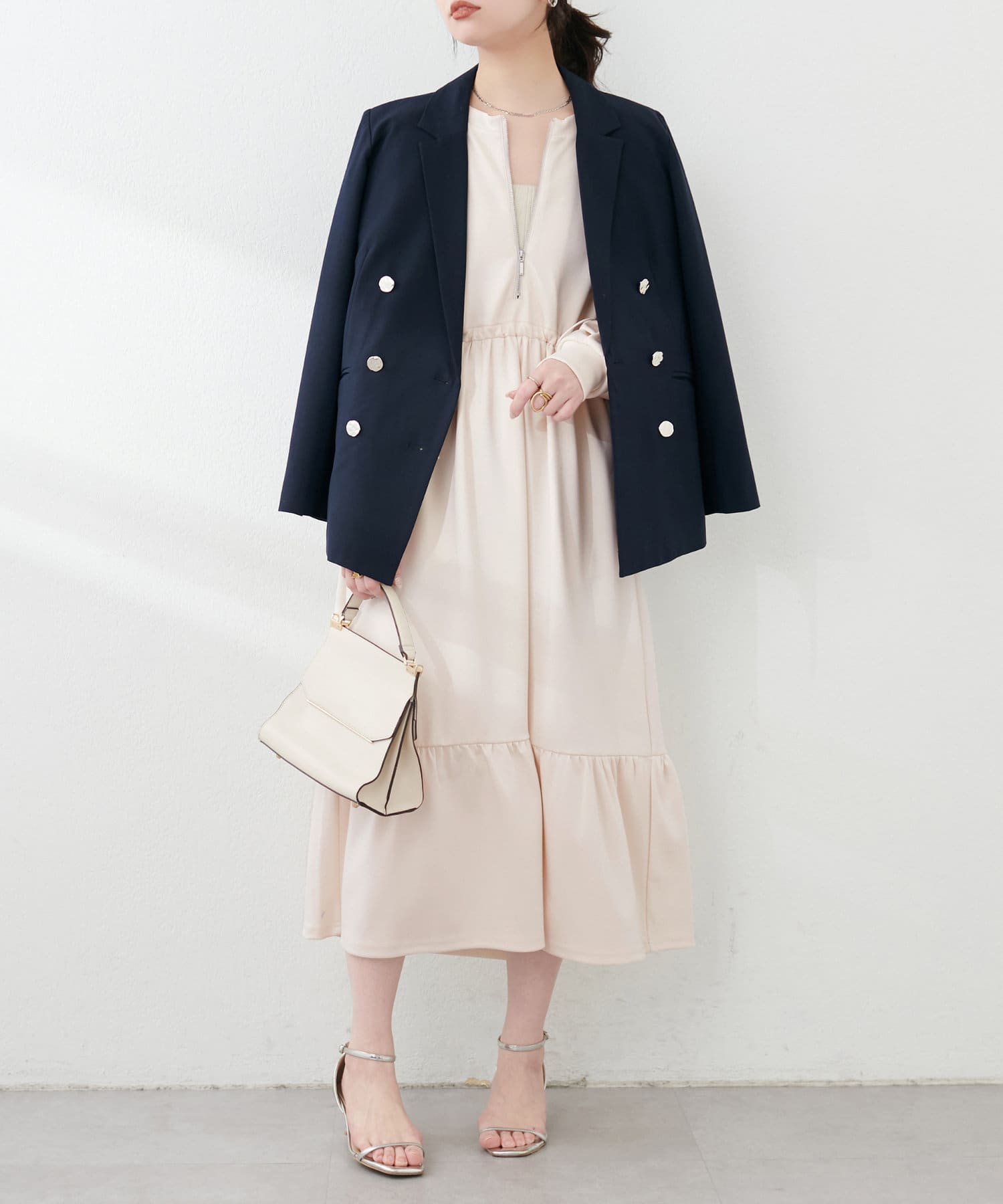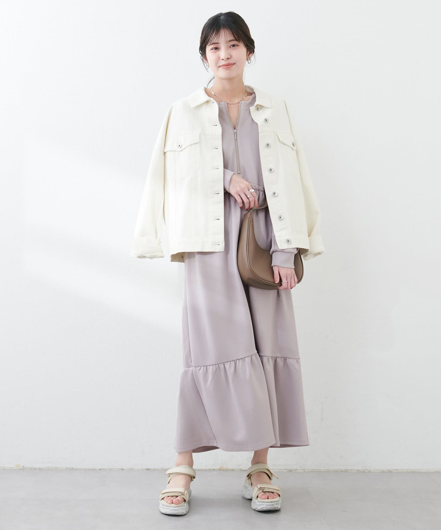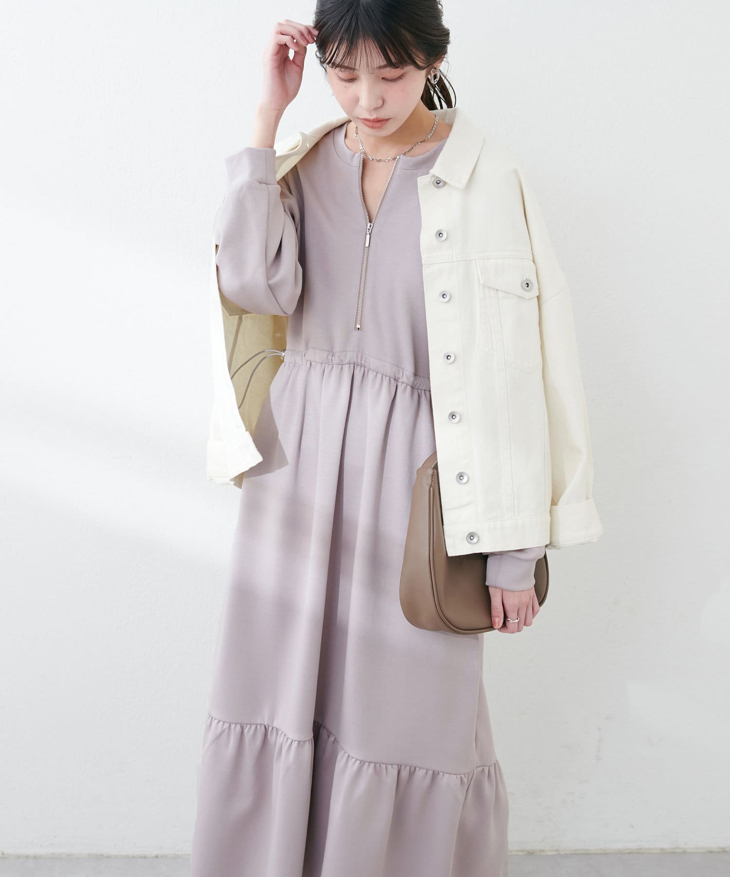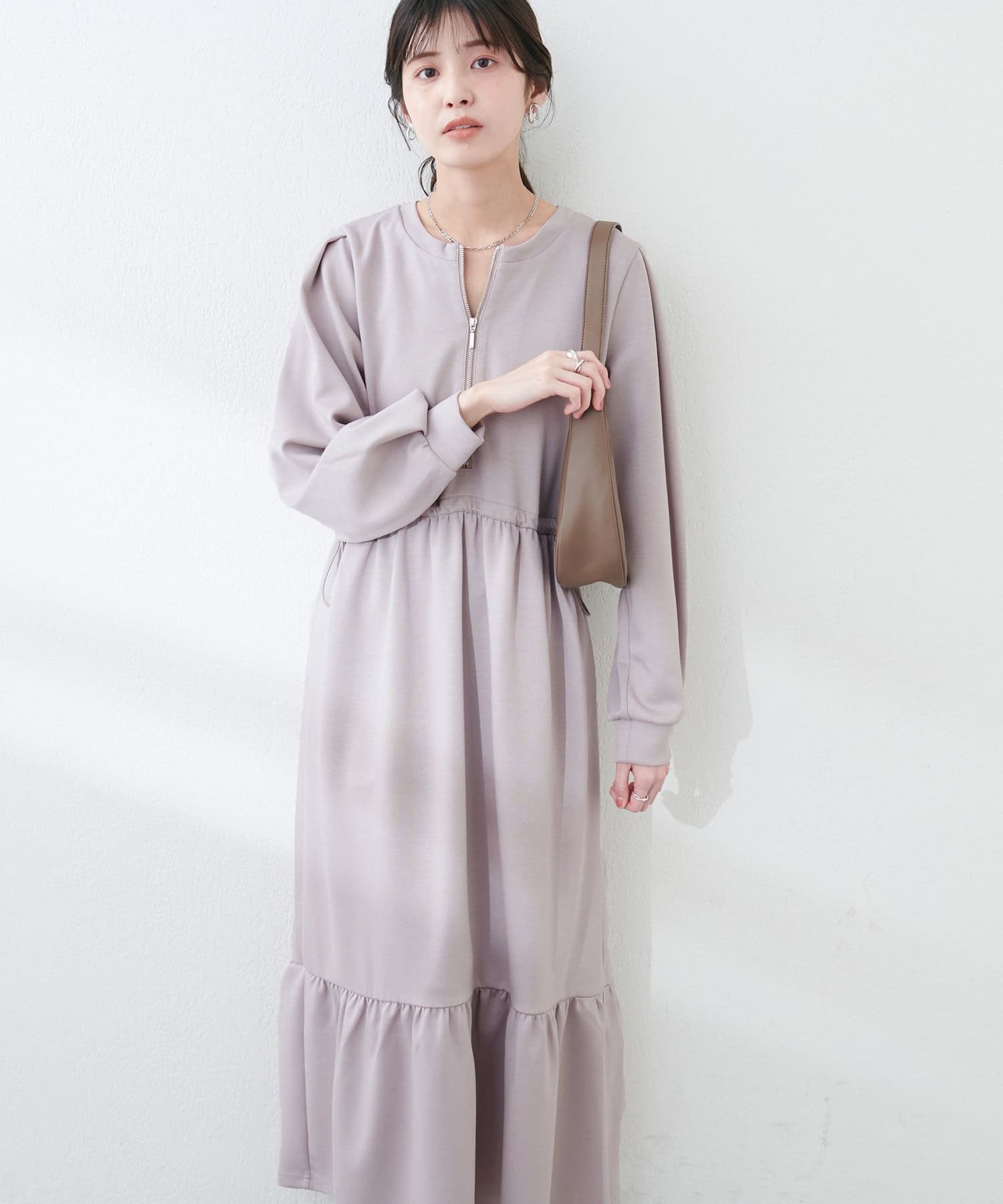 ドロストとハーフジップでトレンドを取り入れ、ギャザーと裾のティアードでディテールを効かせてレディライクな印象に。