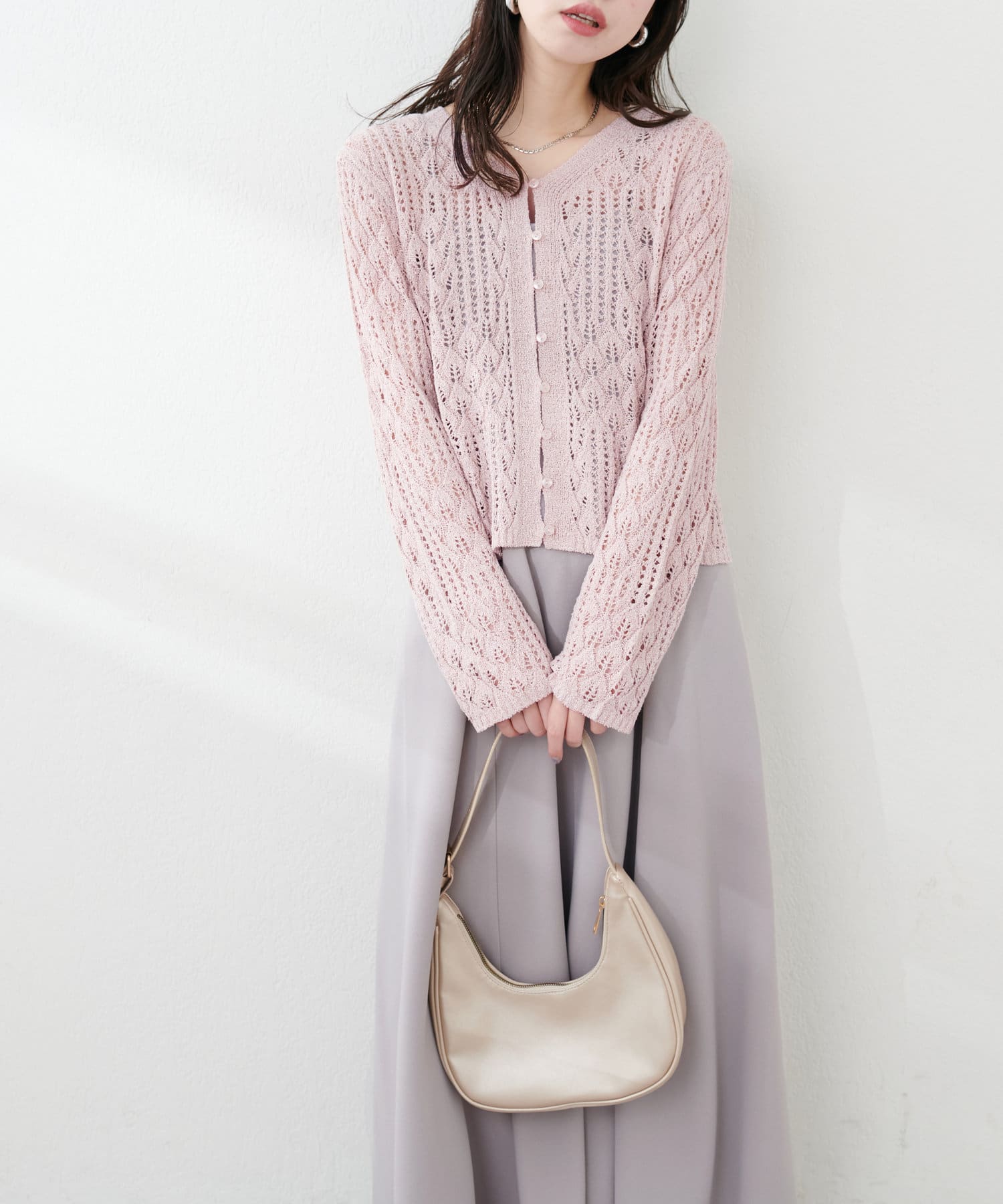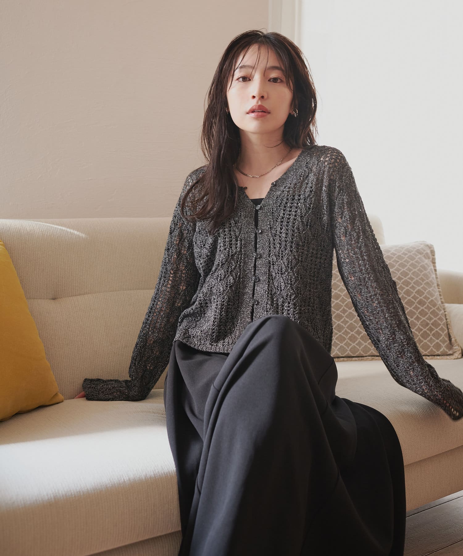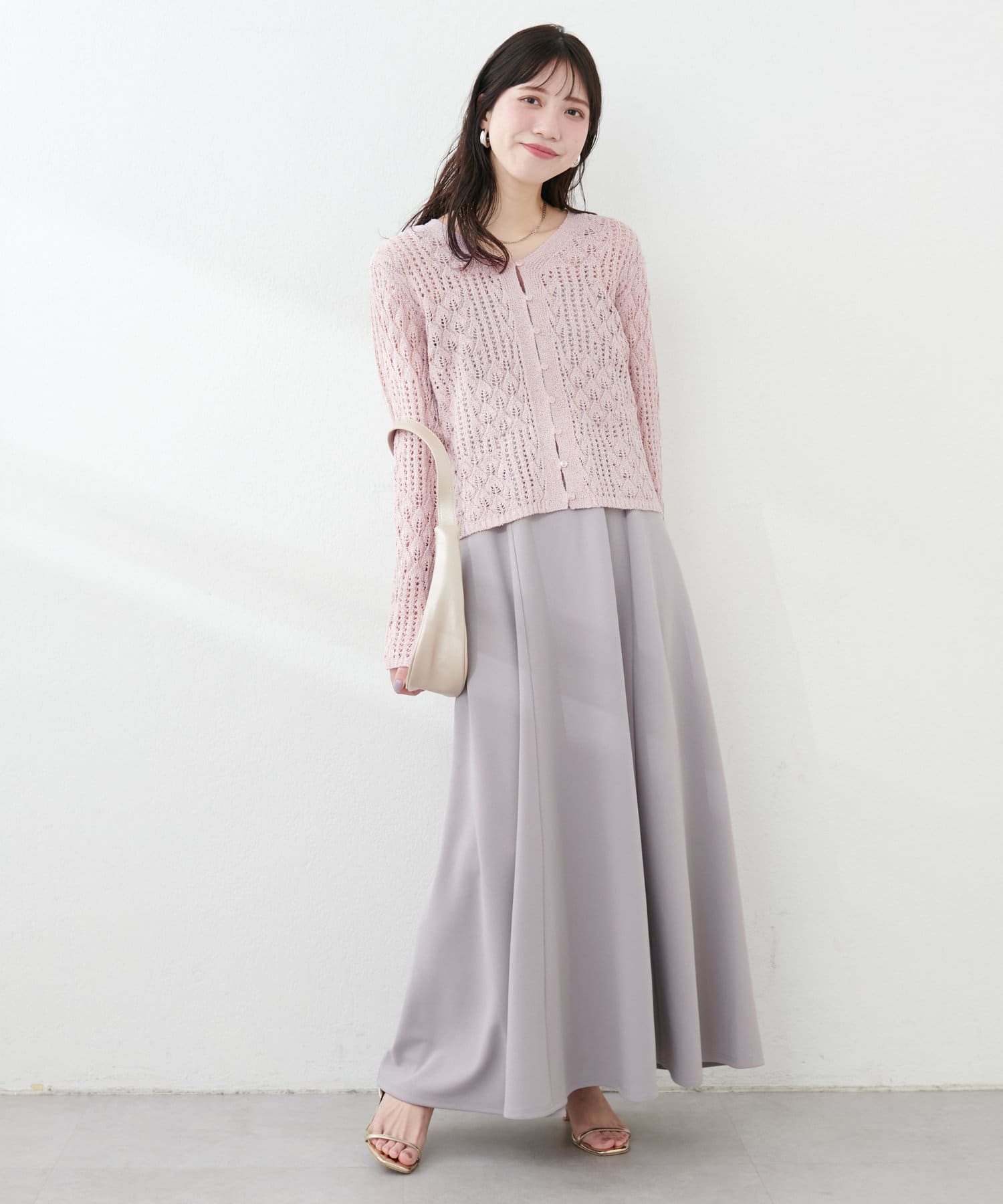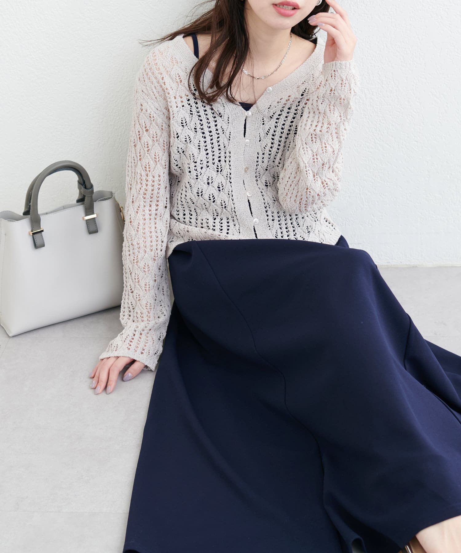 カーディガンは透かし編みで重たくならず抜け感のあるデザイン。