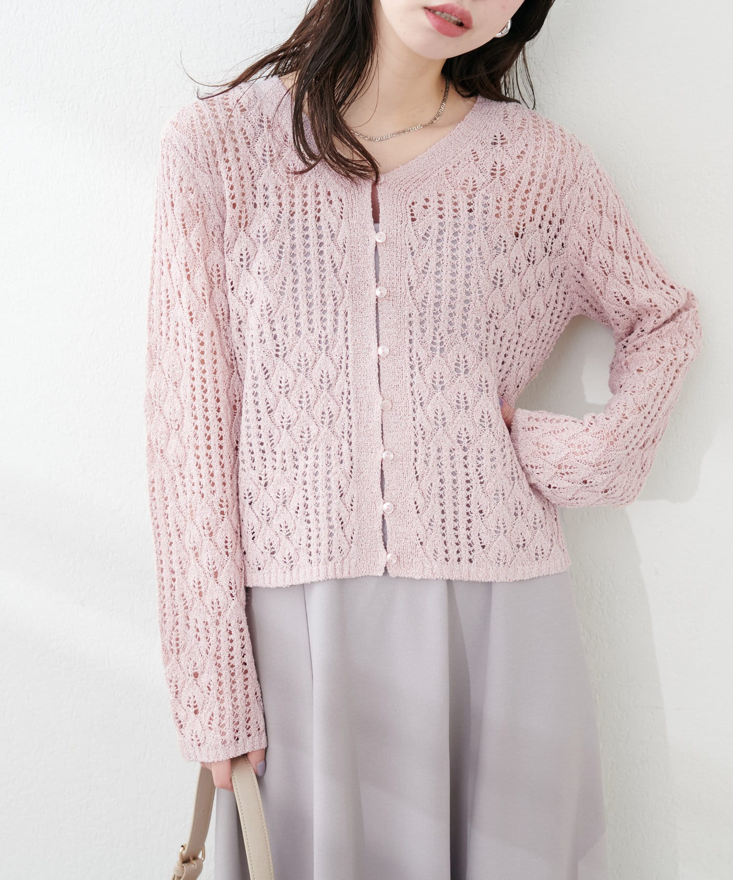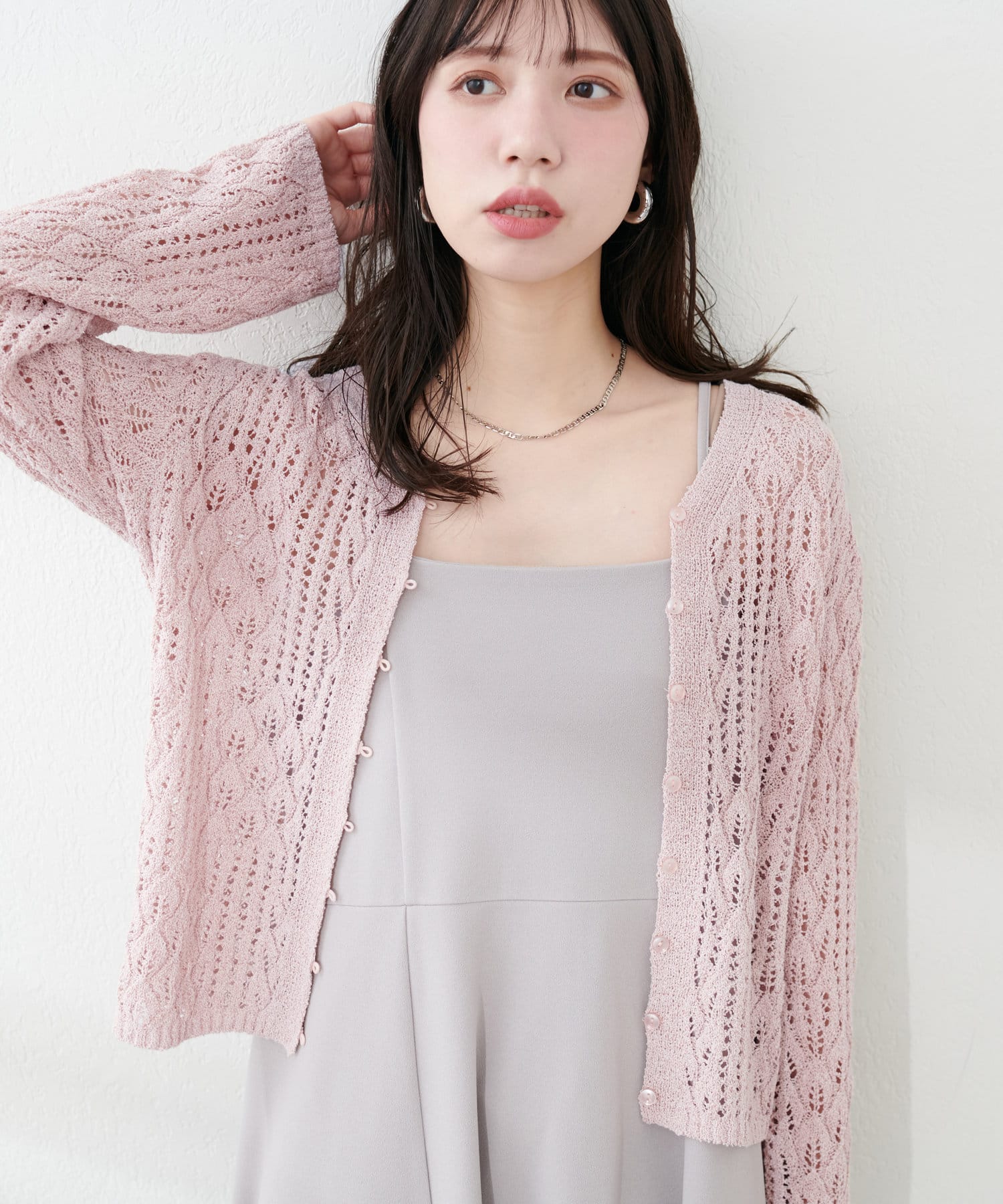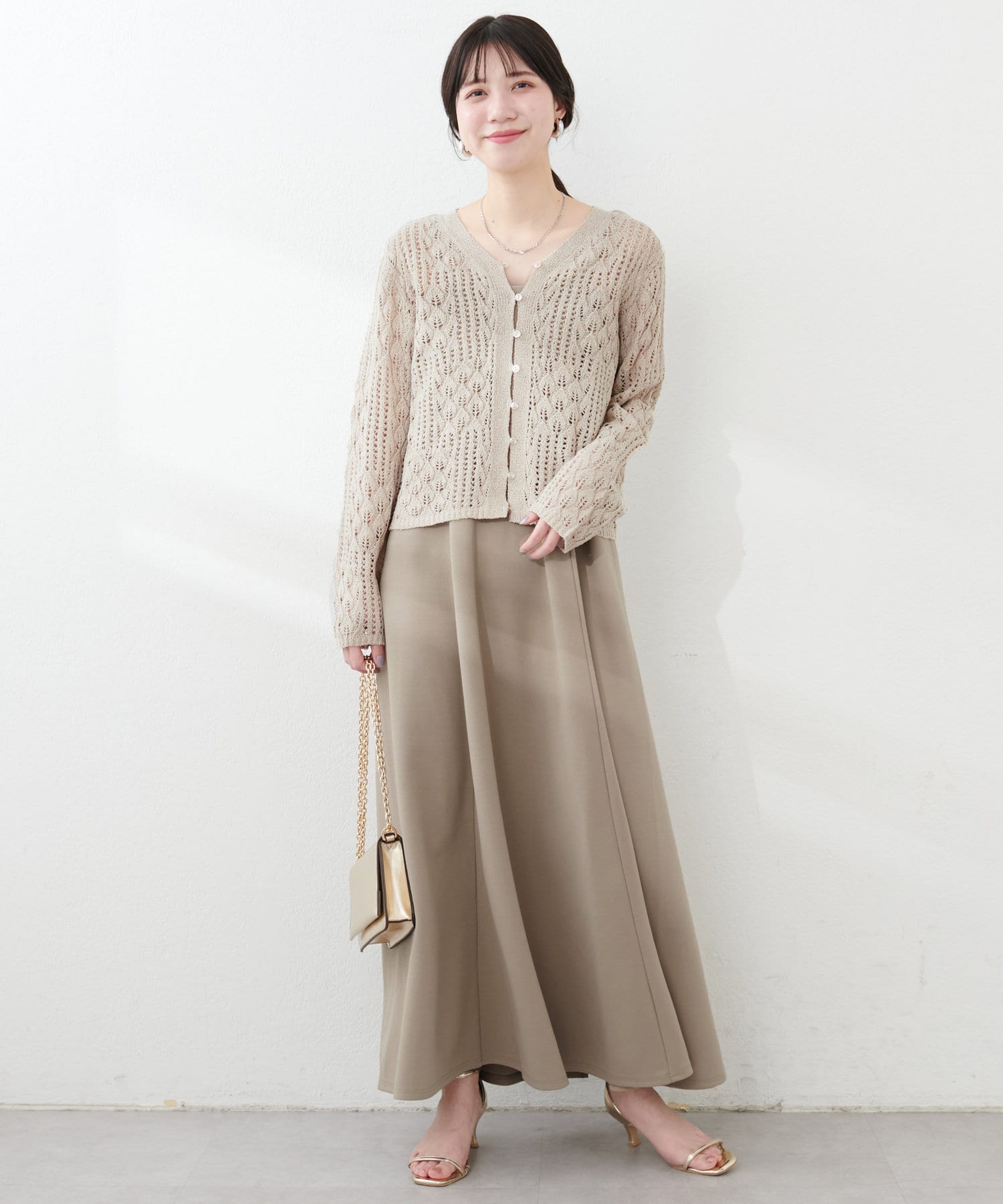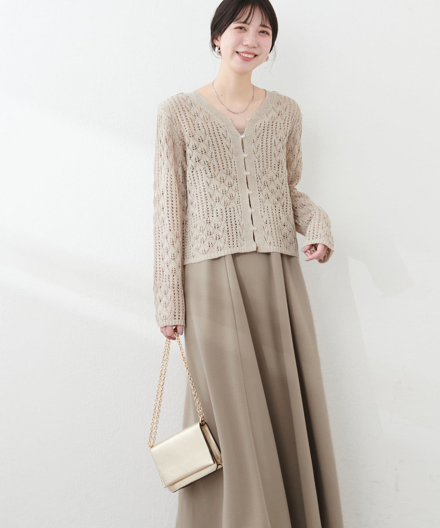 カーディガンは透かし編みで重たくならず抜け感のあるデザイン。