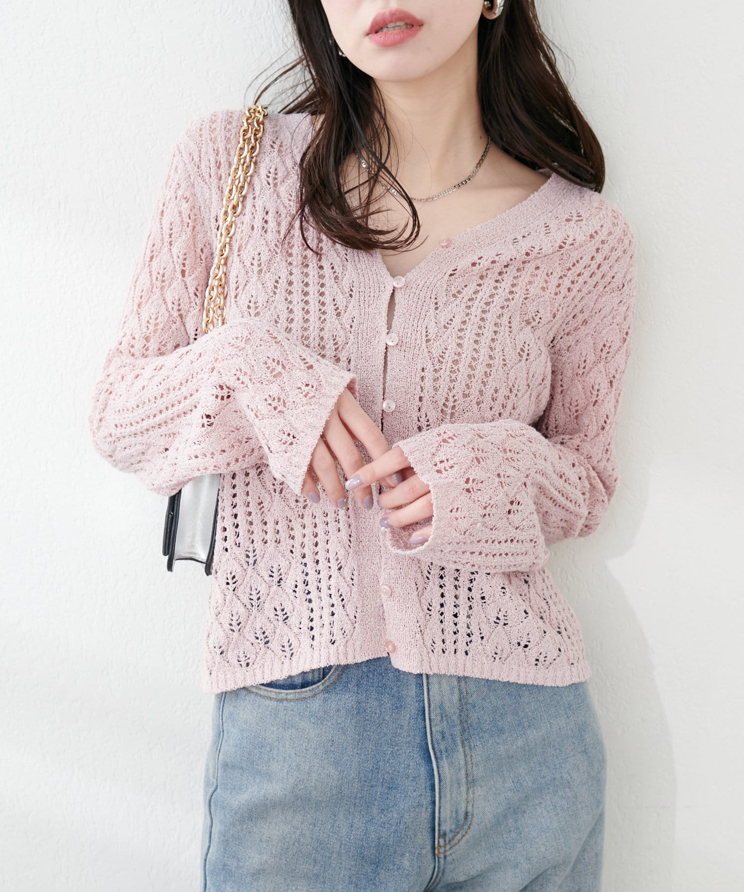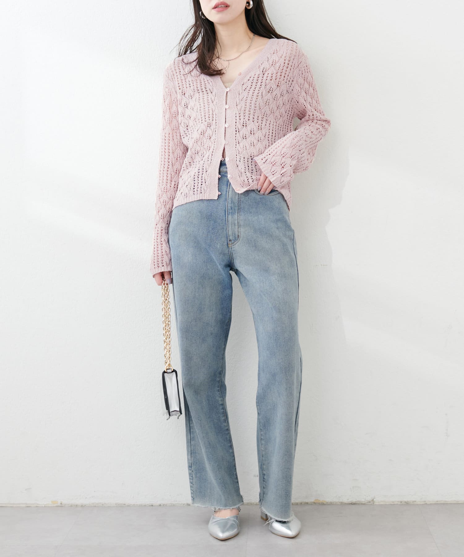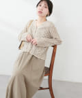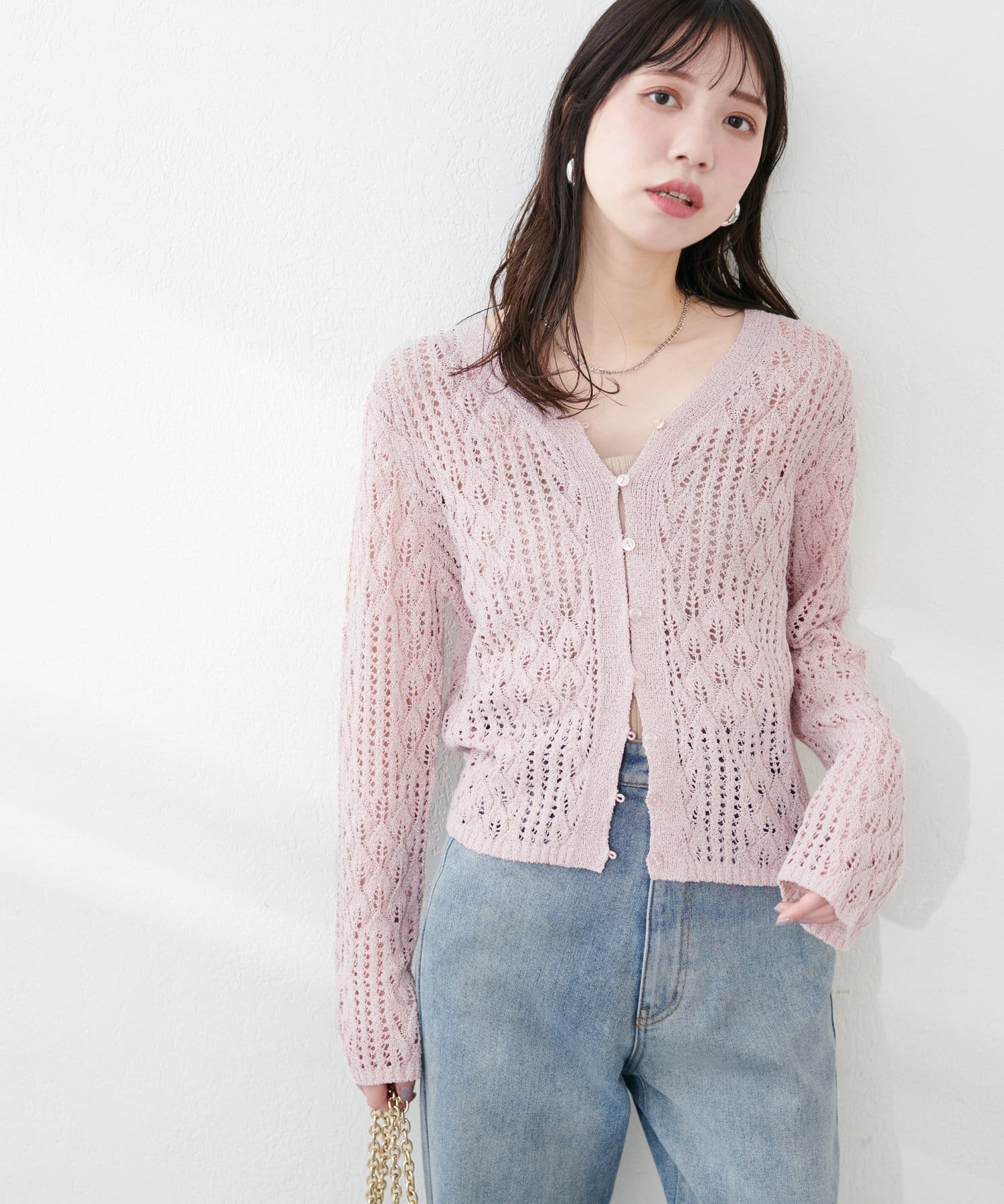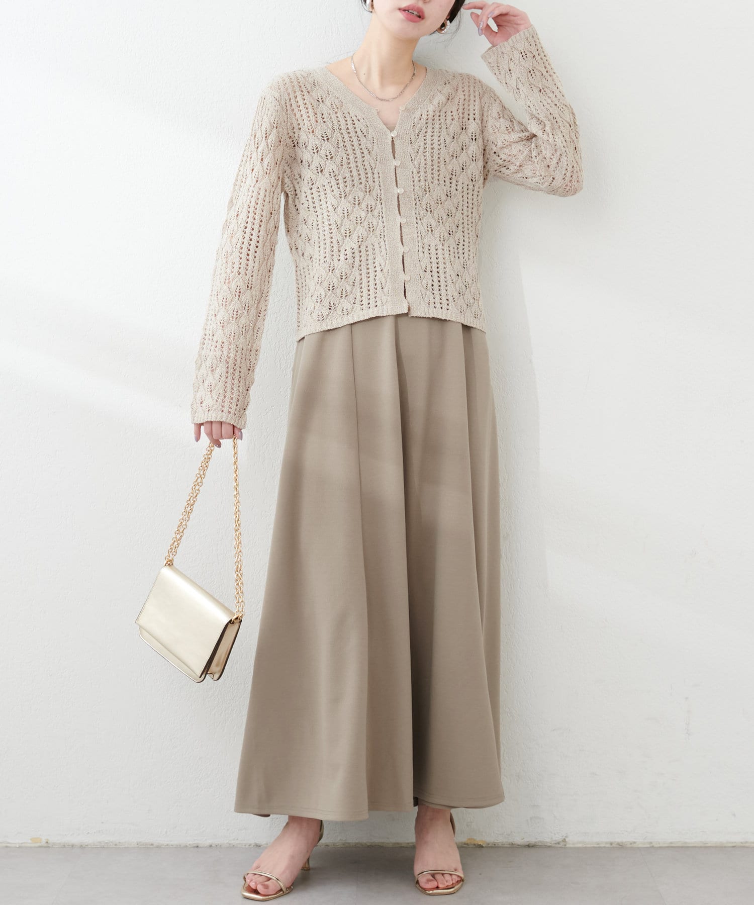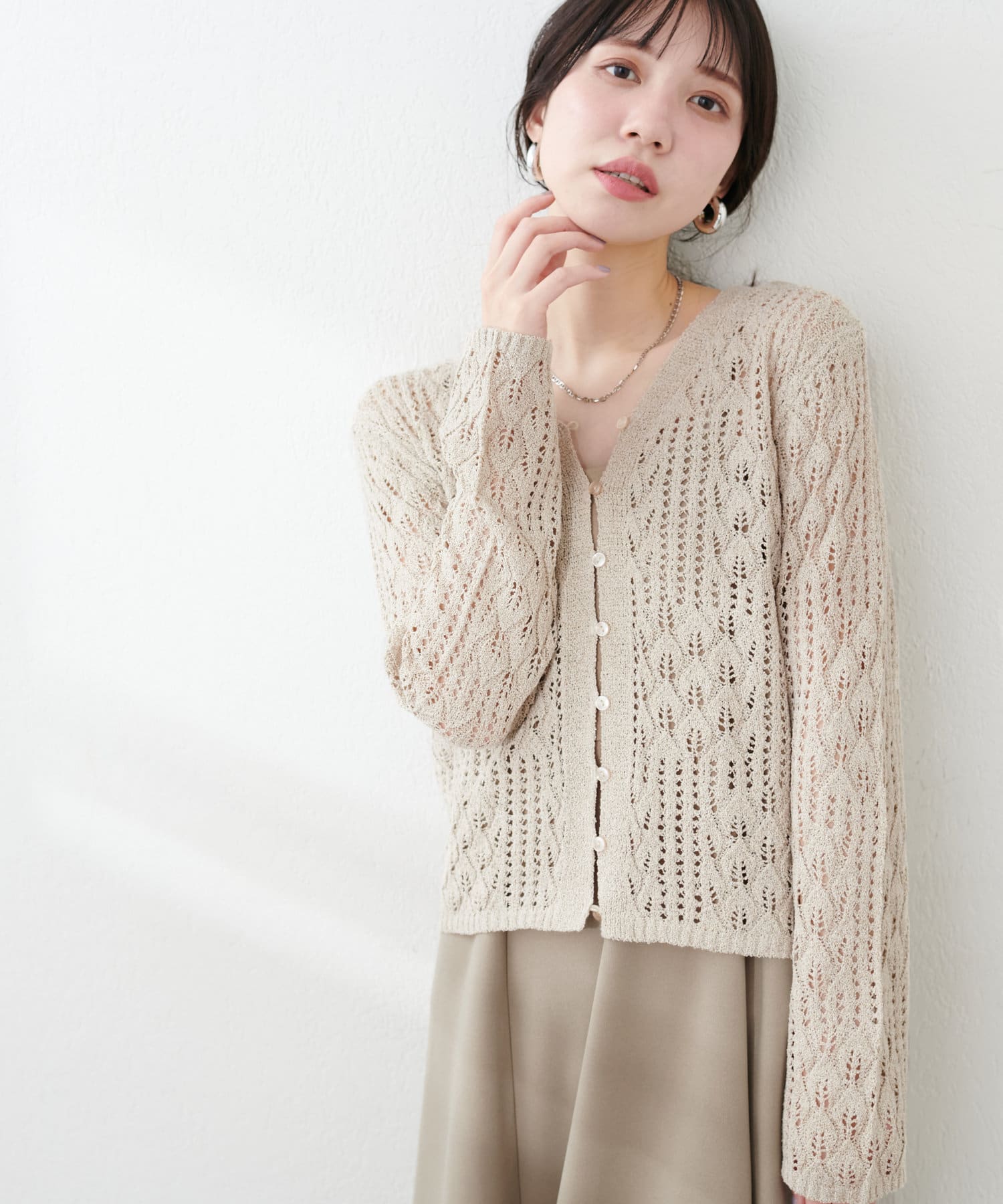 カーディガンは透かし編みで重たくならず抜け感のあるデザイン。