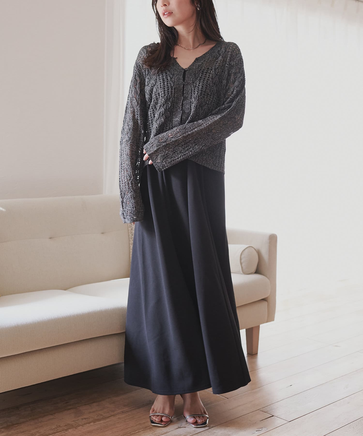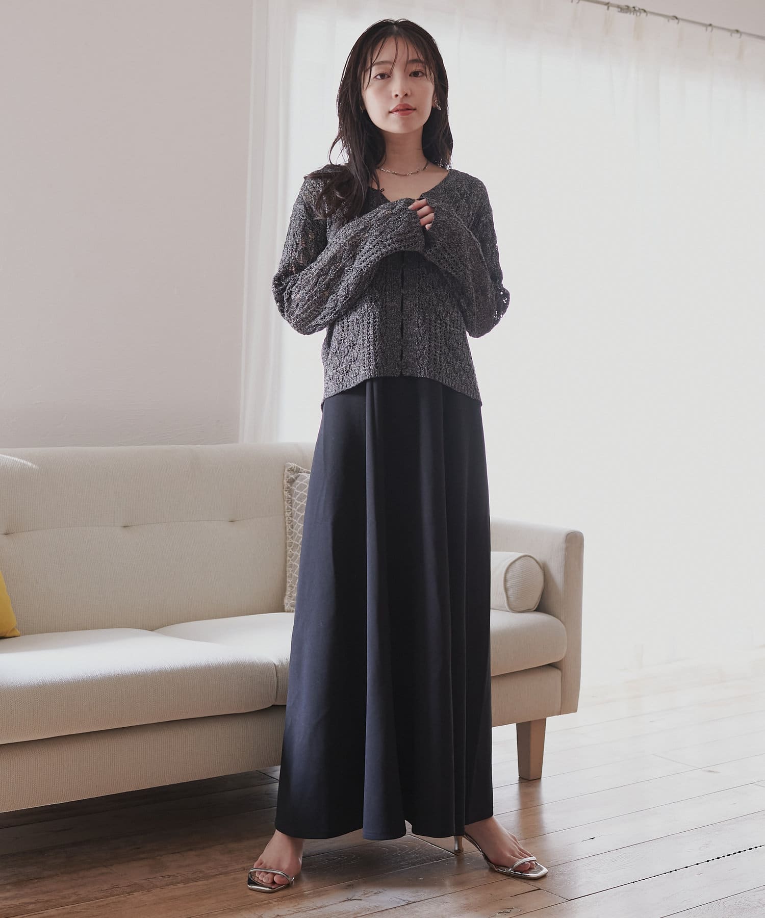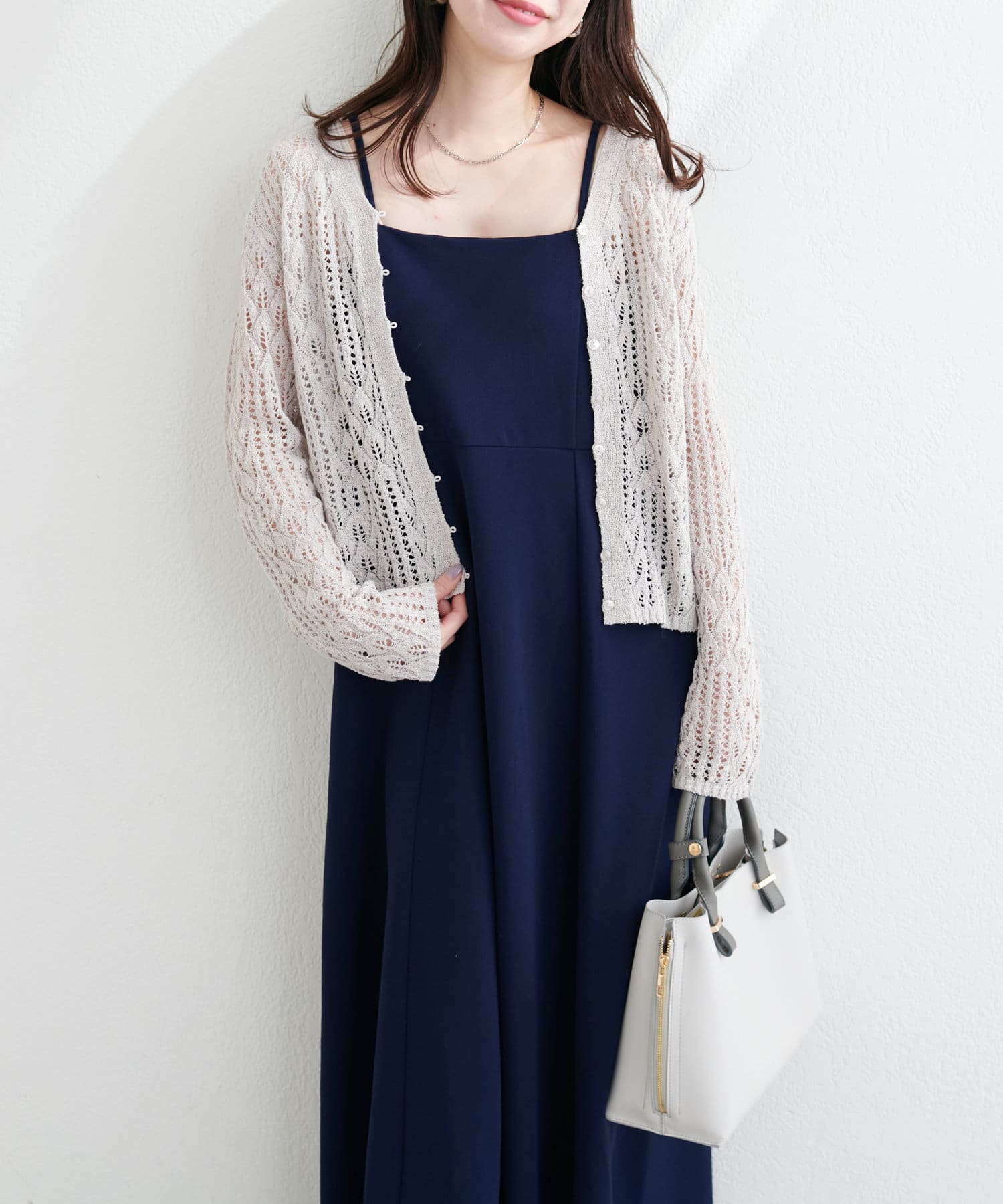 透かし編みニットカーディガンとキャミワンピースがセットになったアイテム。