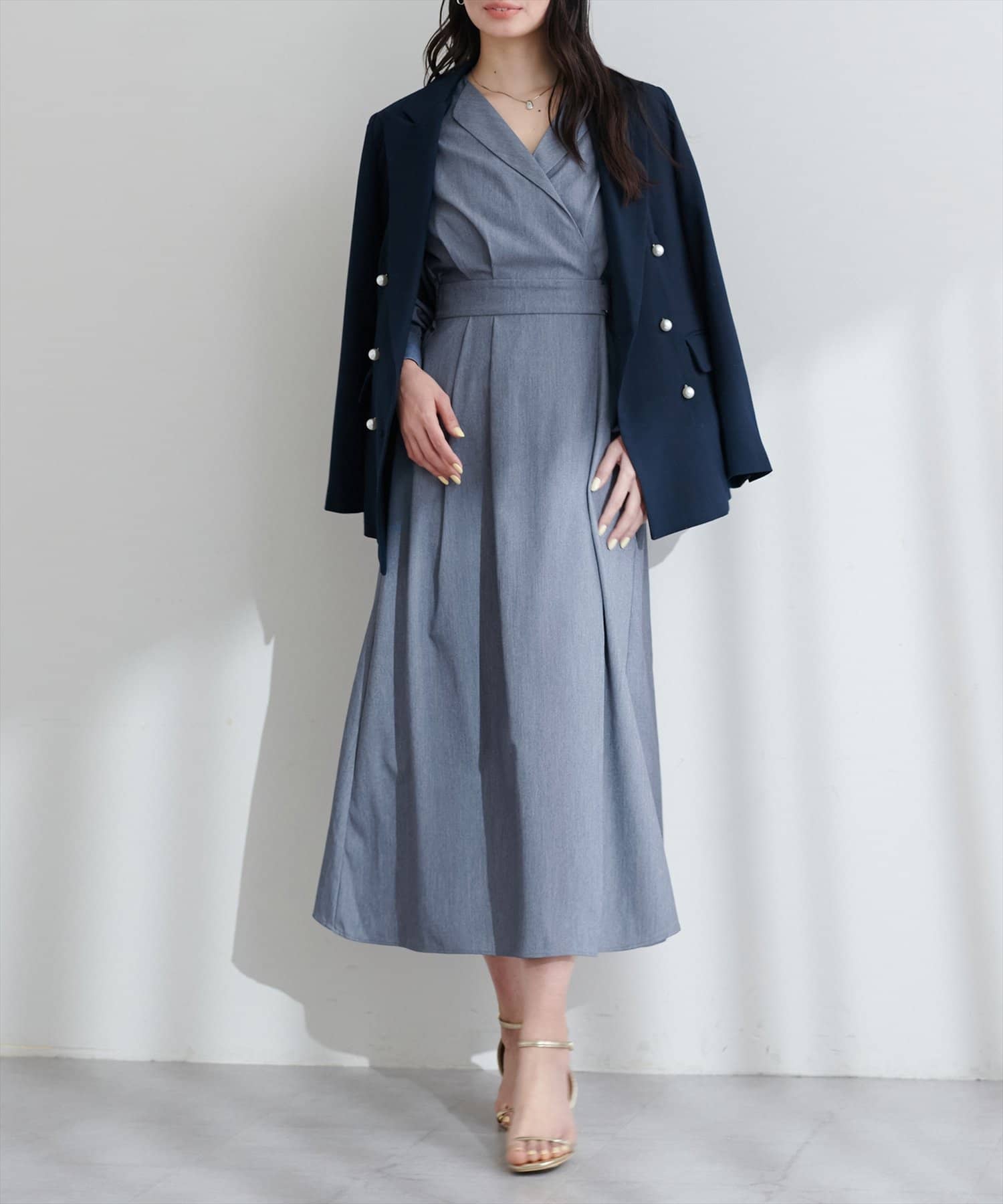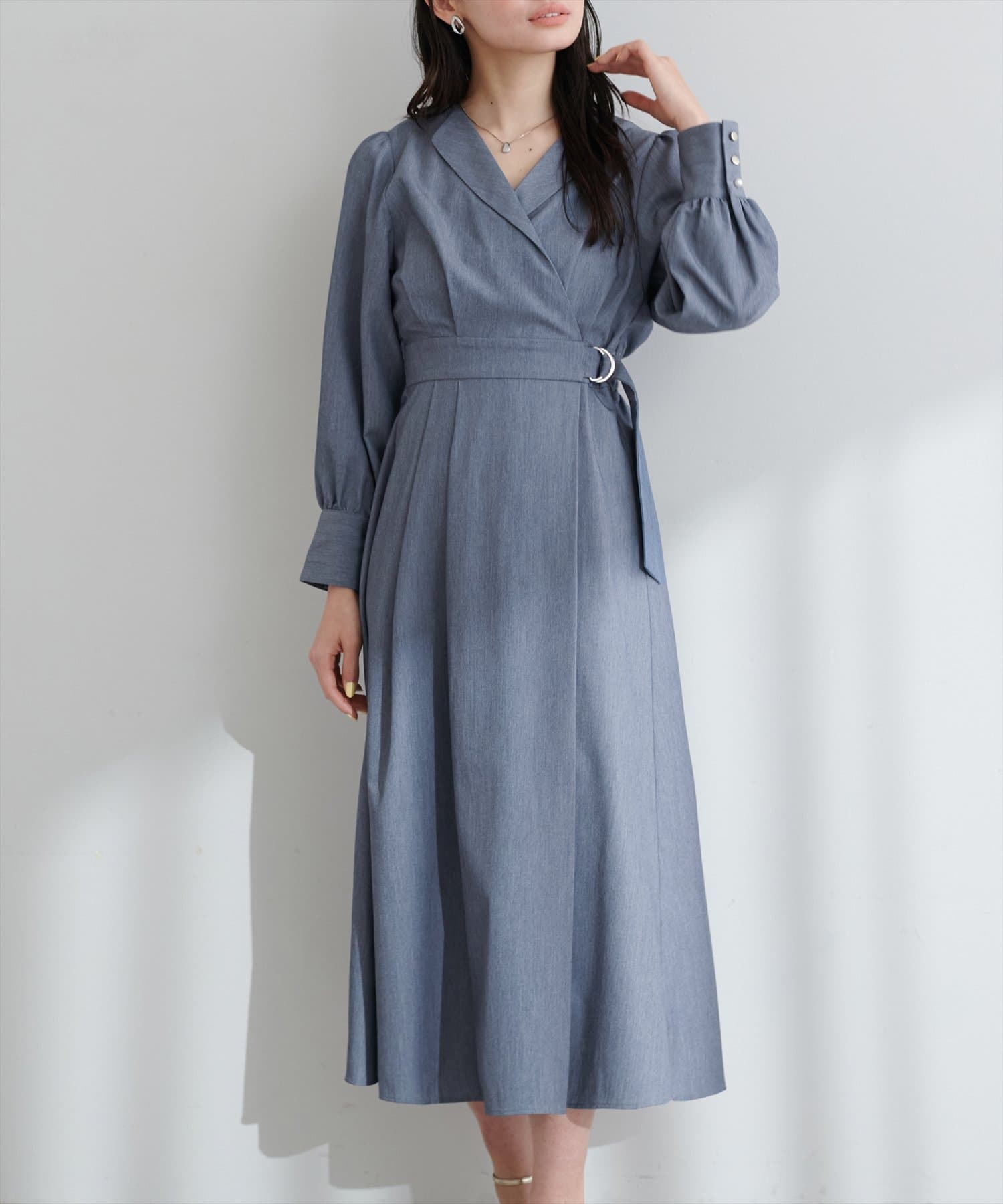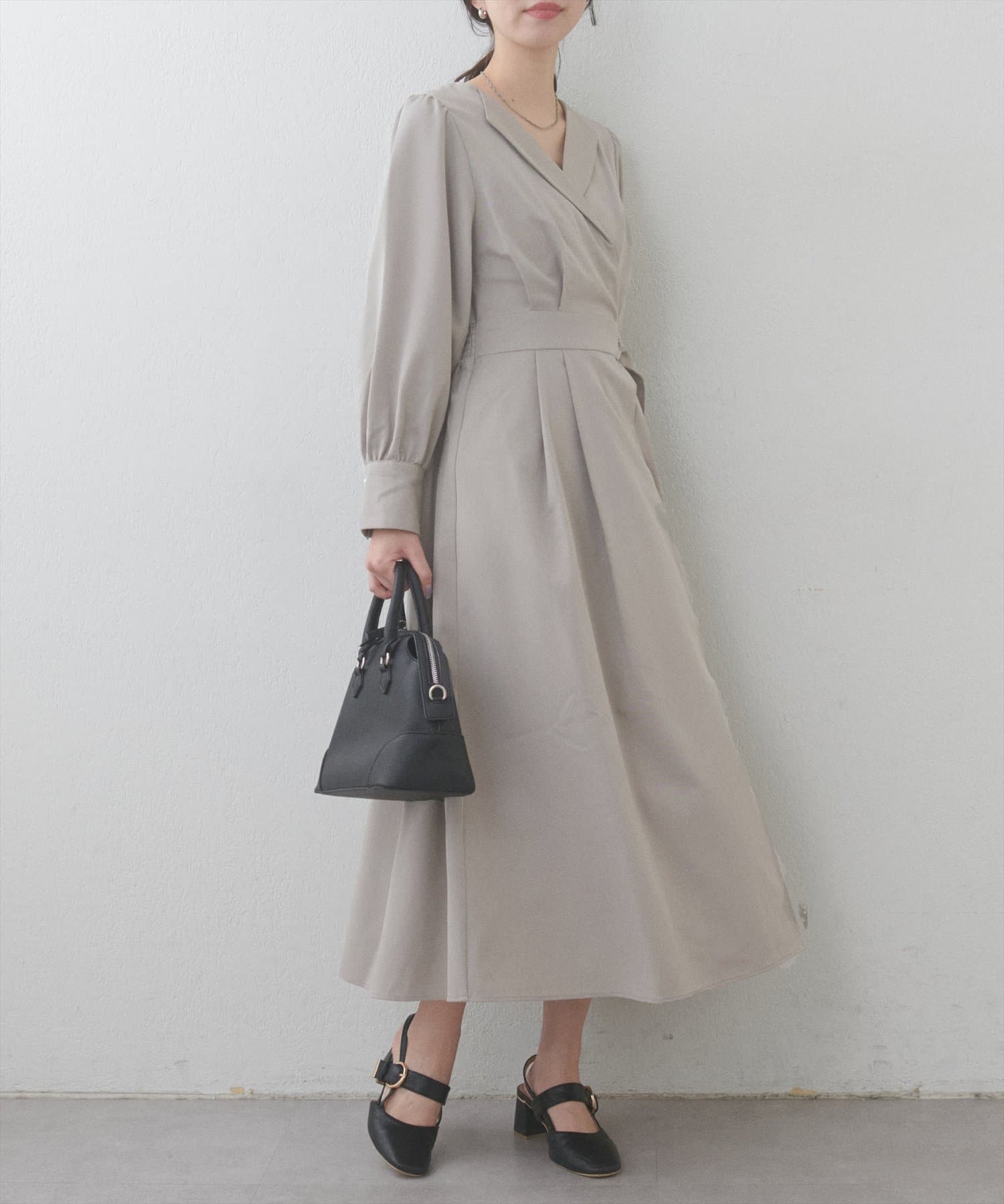 まるでガウンのようなオープンネックが大人の余裕を漂わせるレディワンピース。