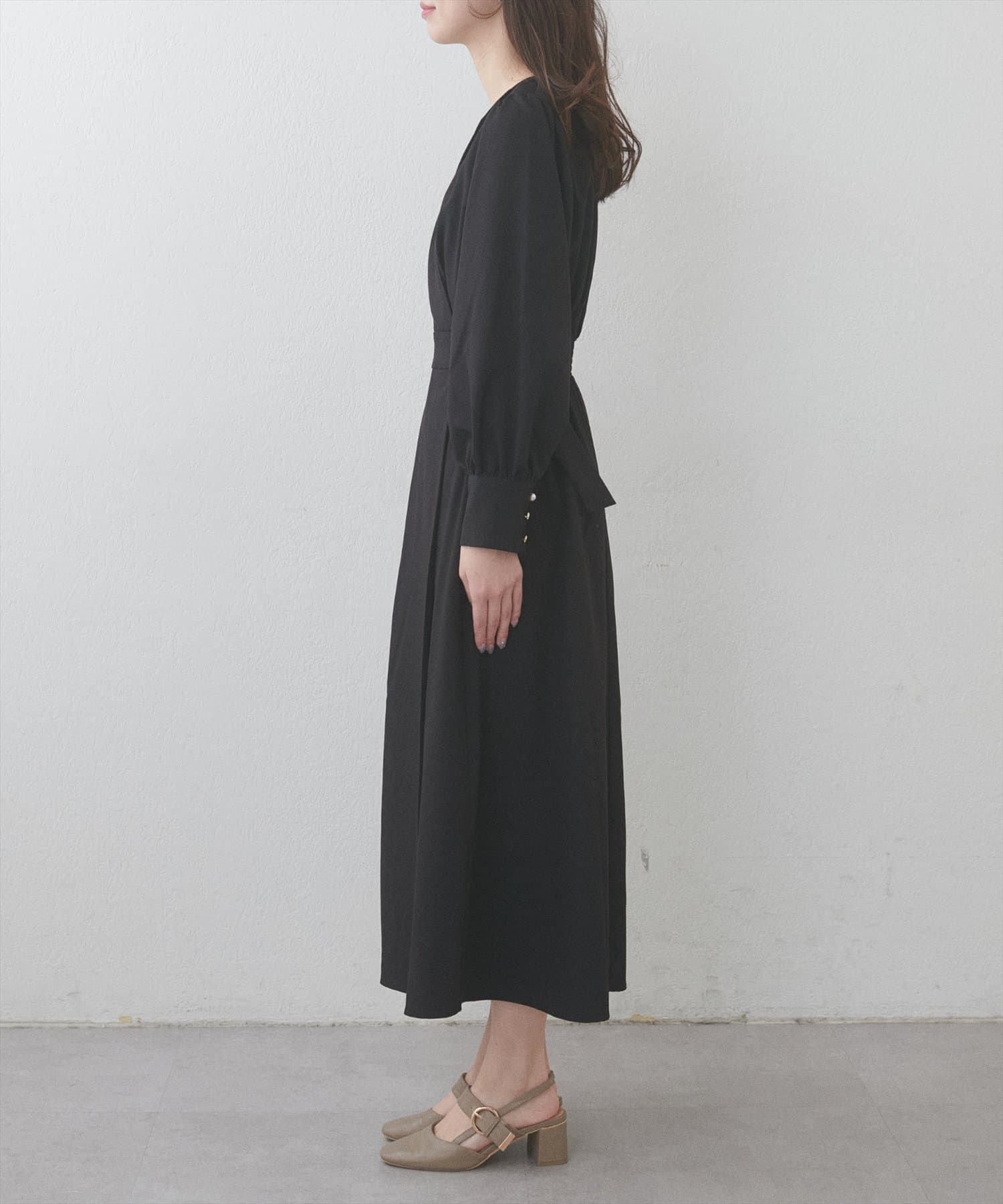 高めのウエストマークと、ウエストに向かって施されたタックでスタイルアップ効果が期待できます。