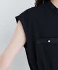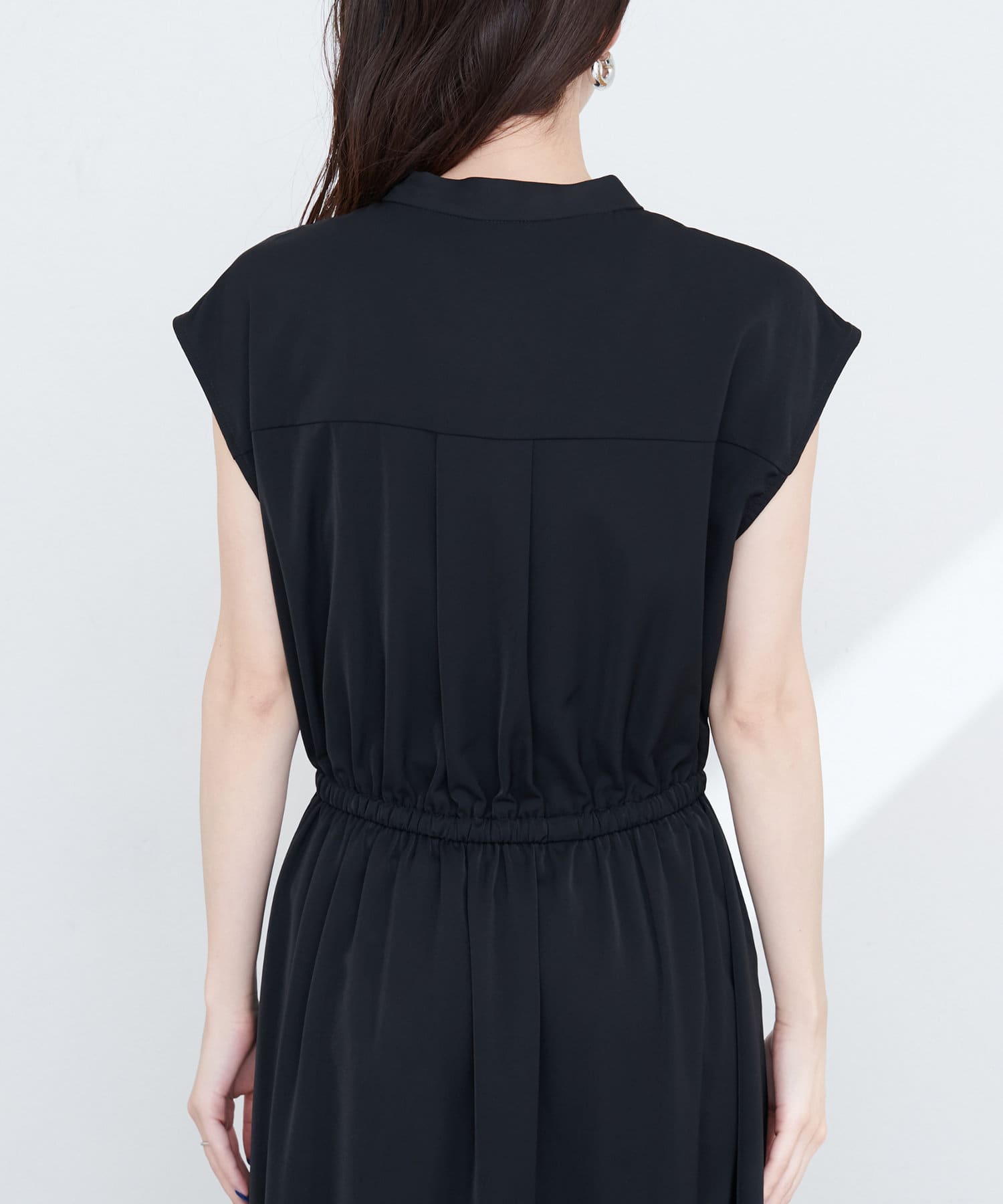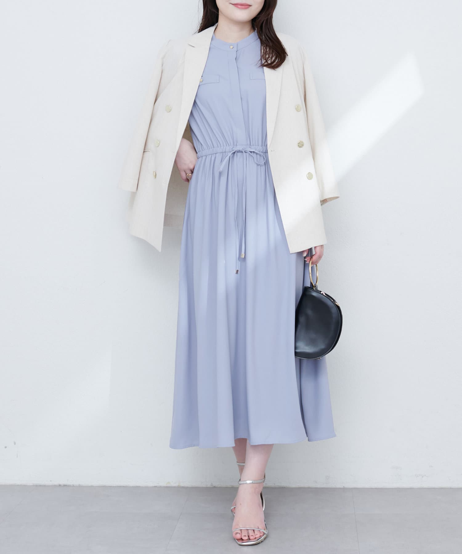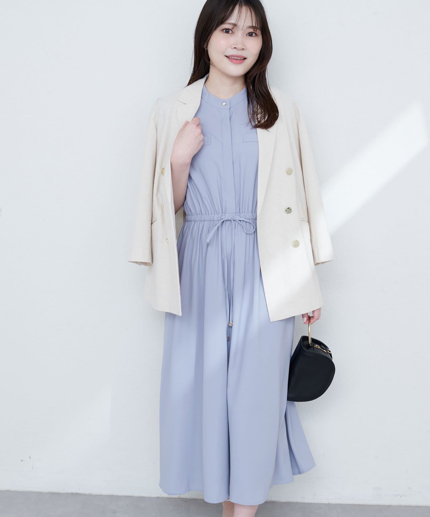 ノーカラーのすっきりとした首元に加え、