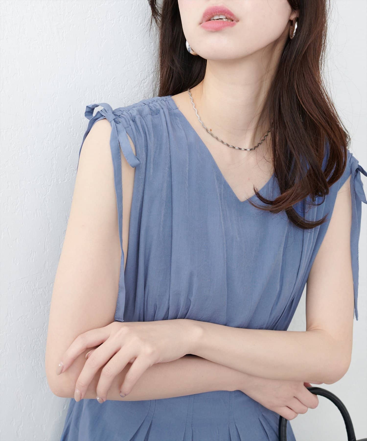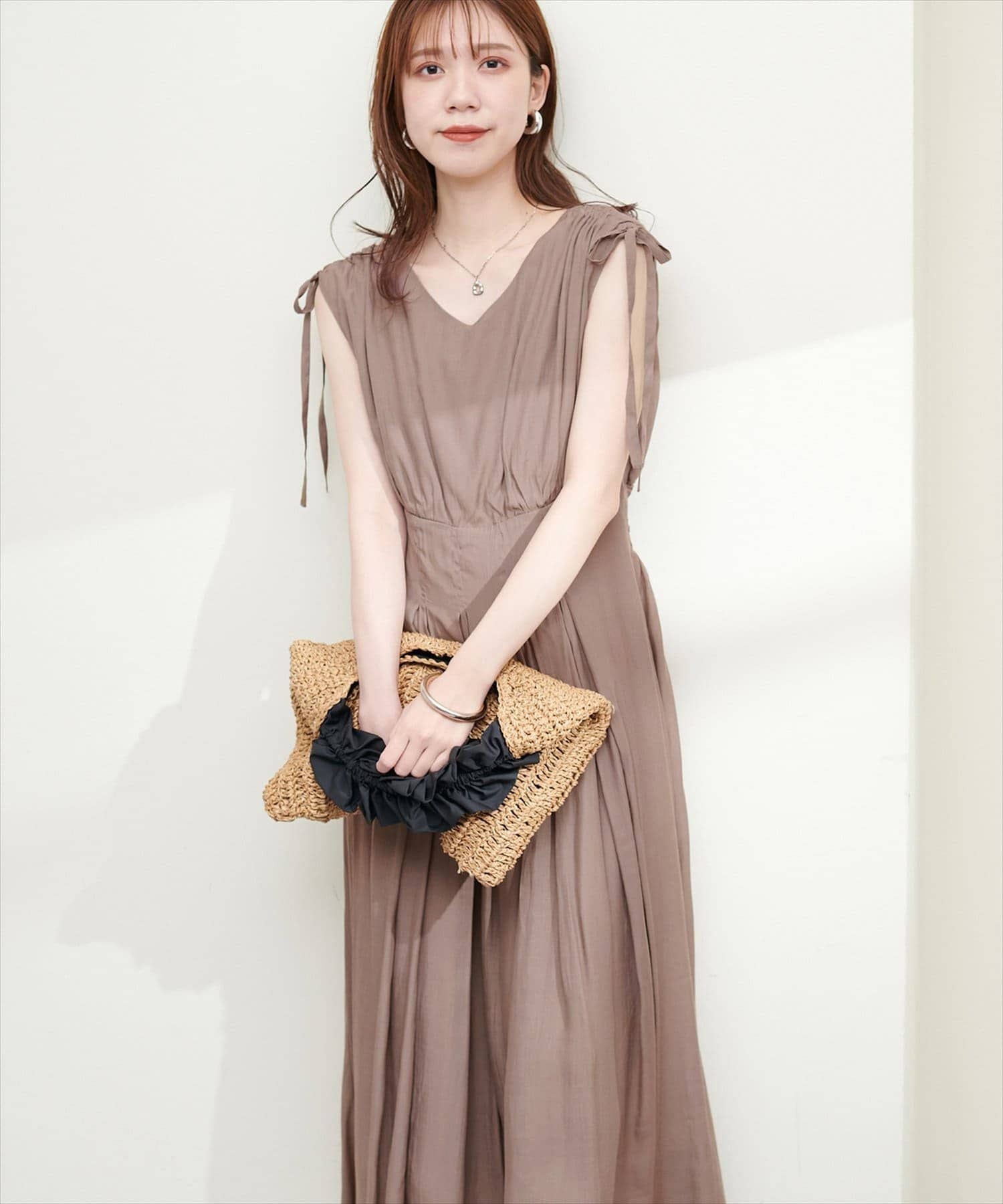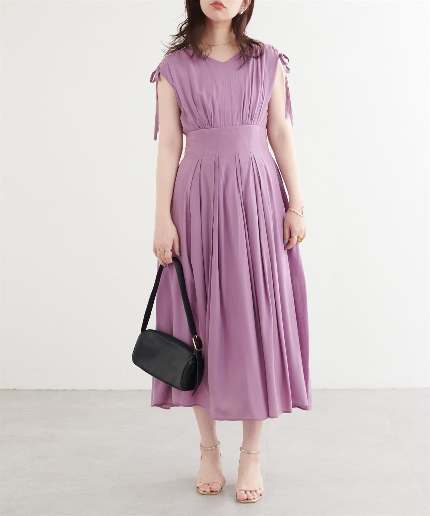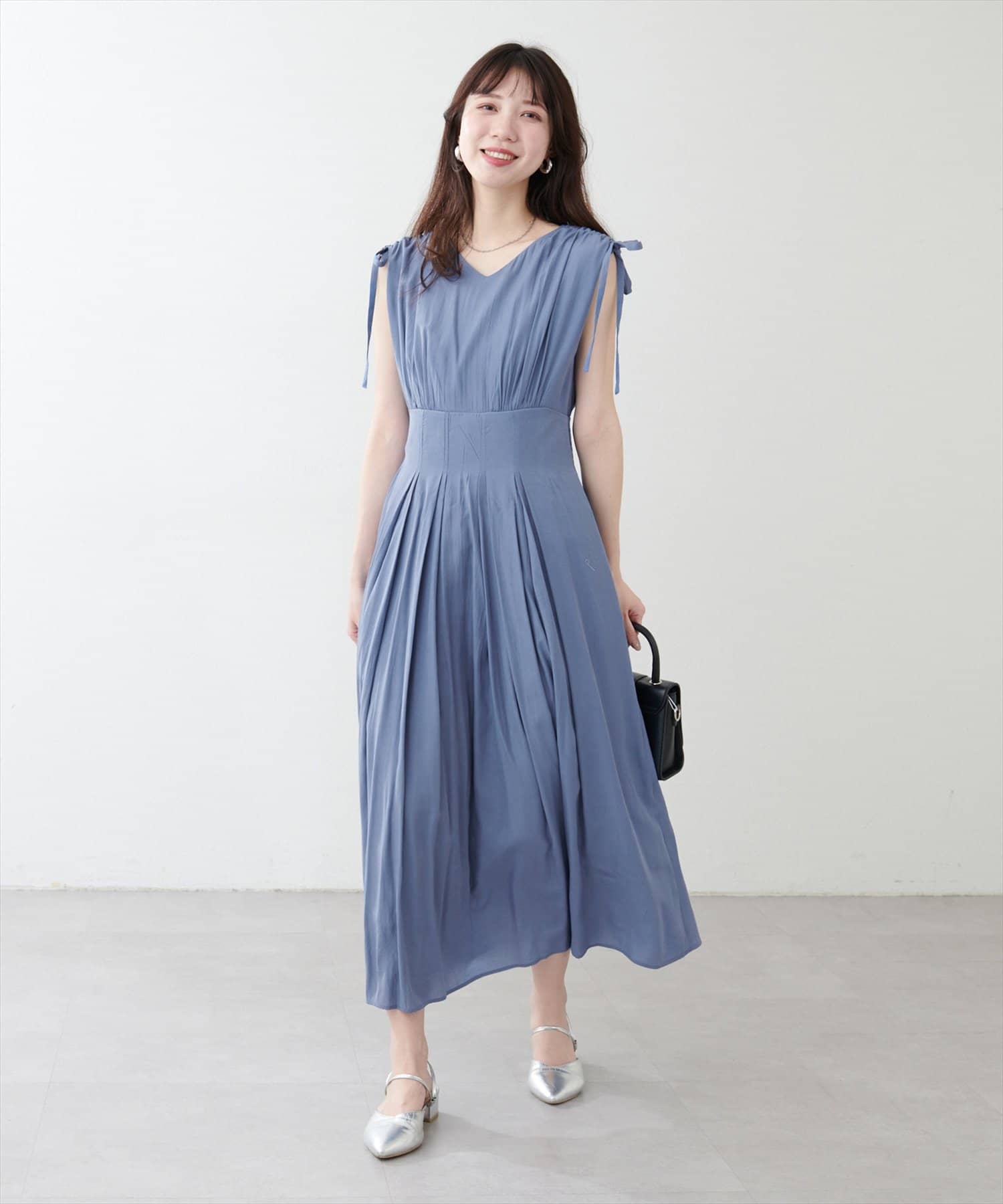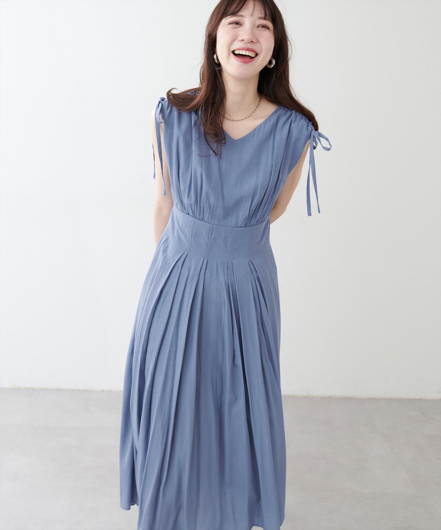 ショルダー部分のドロストリボンで高級感溢れる印象のノースリーブワンピース。