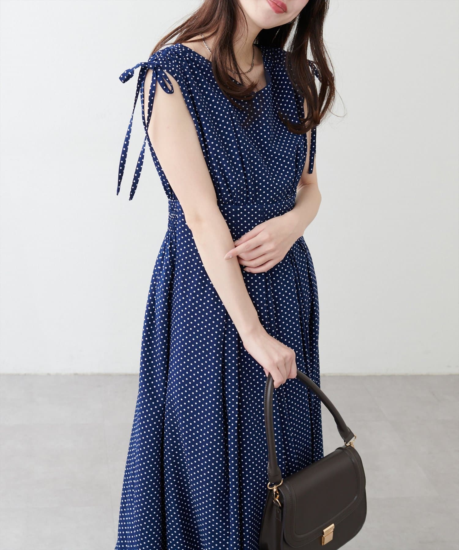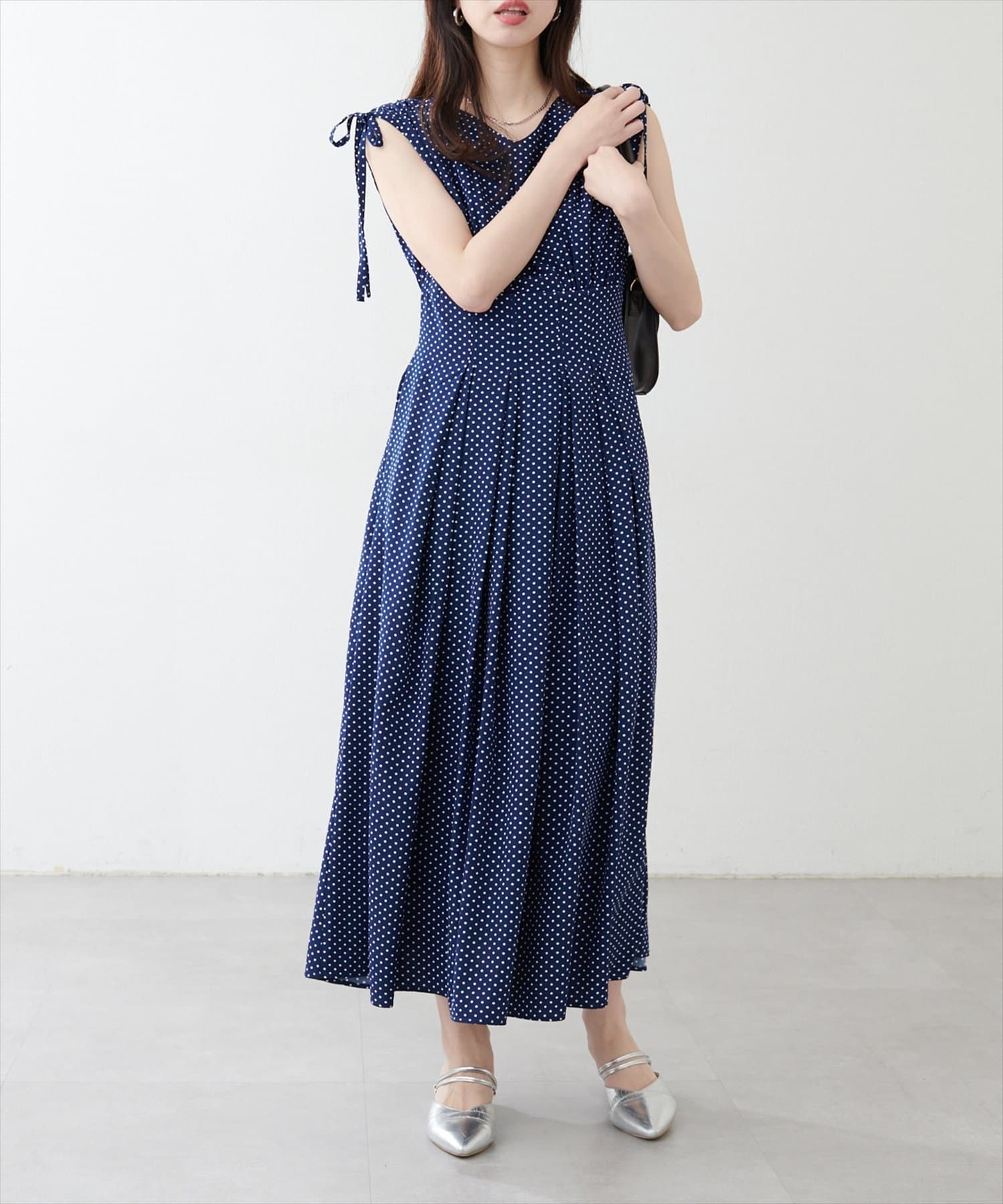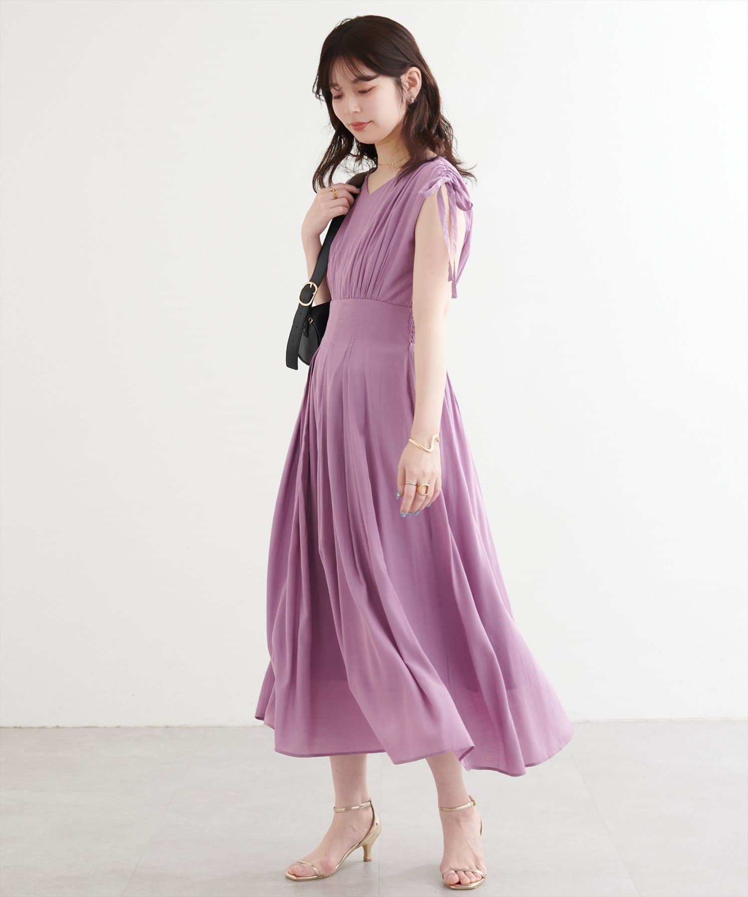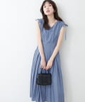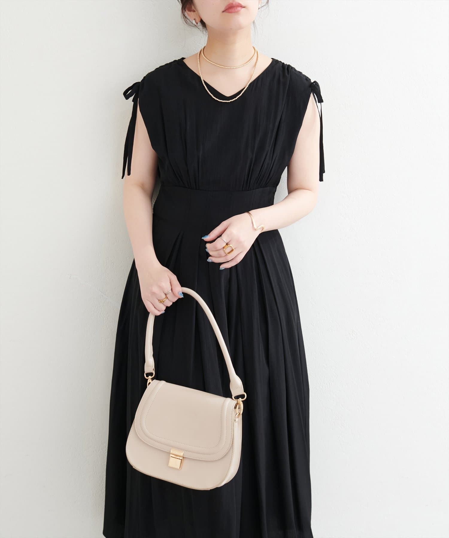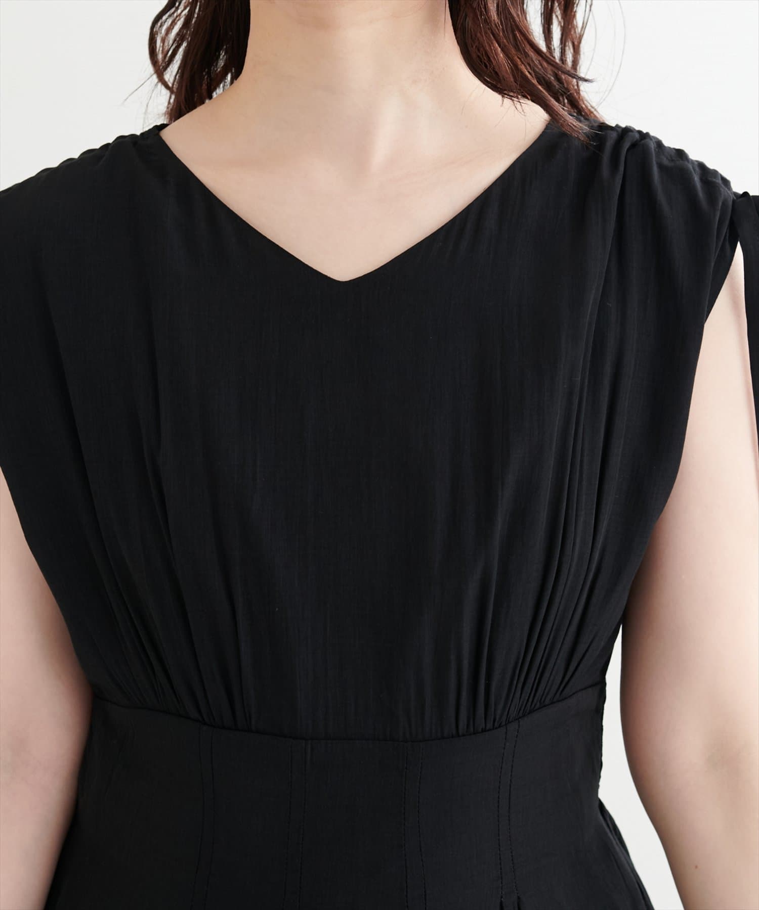 ショルダー部分のドロストリボンで高級感溢れる印象のノースリーブワンピース。