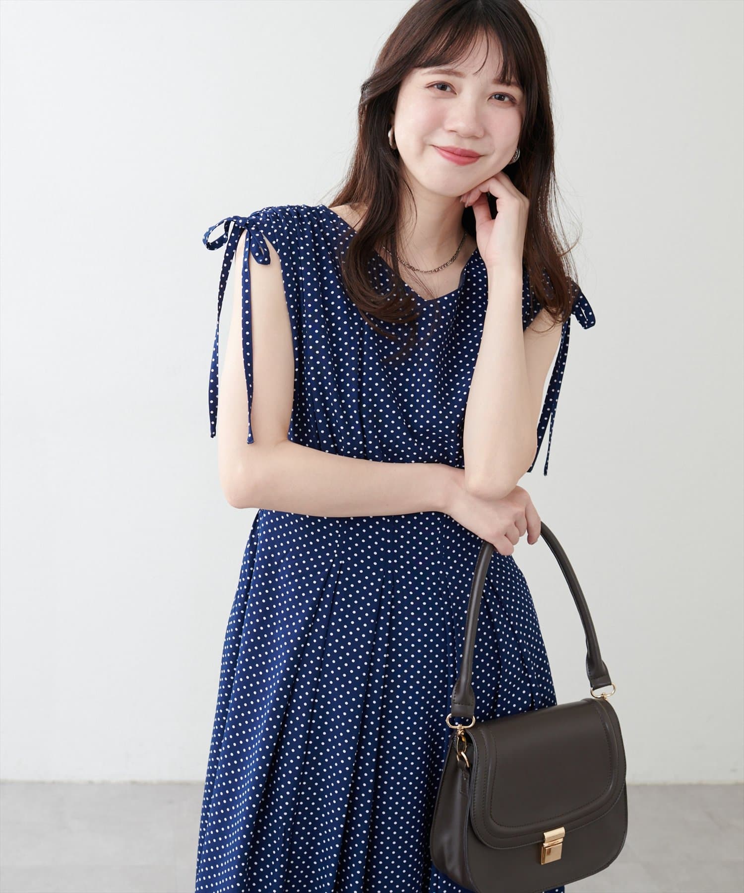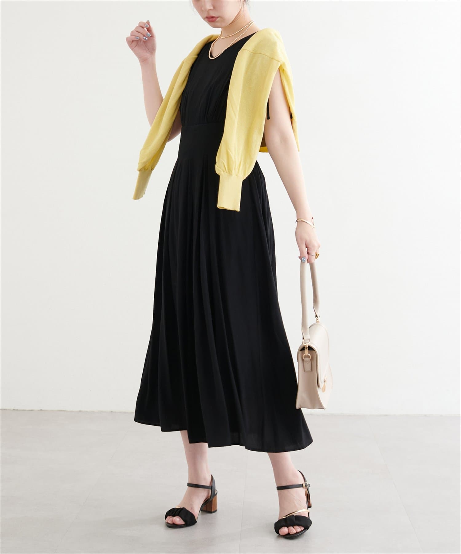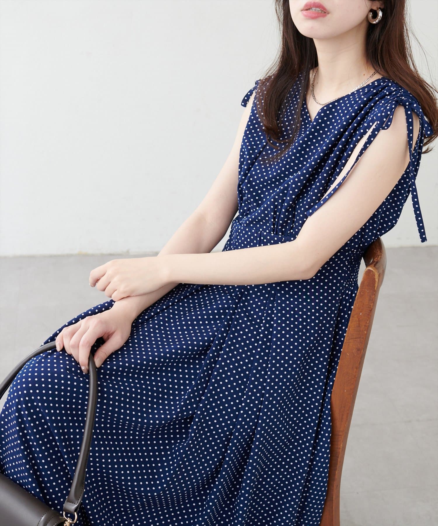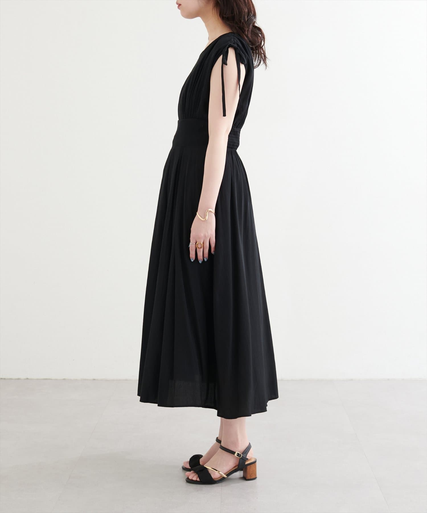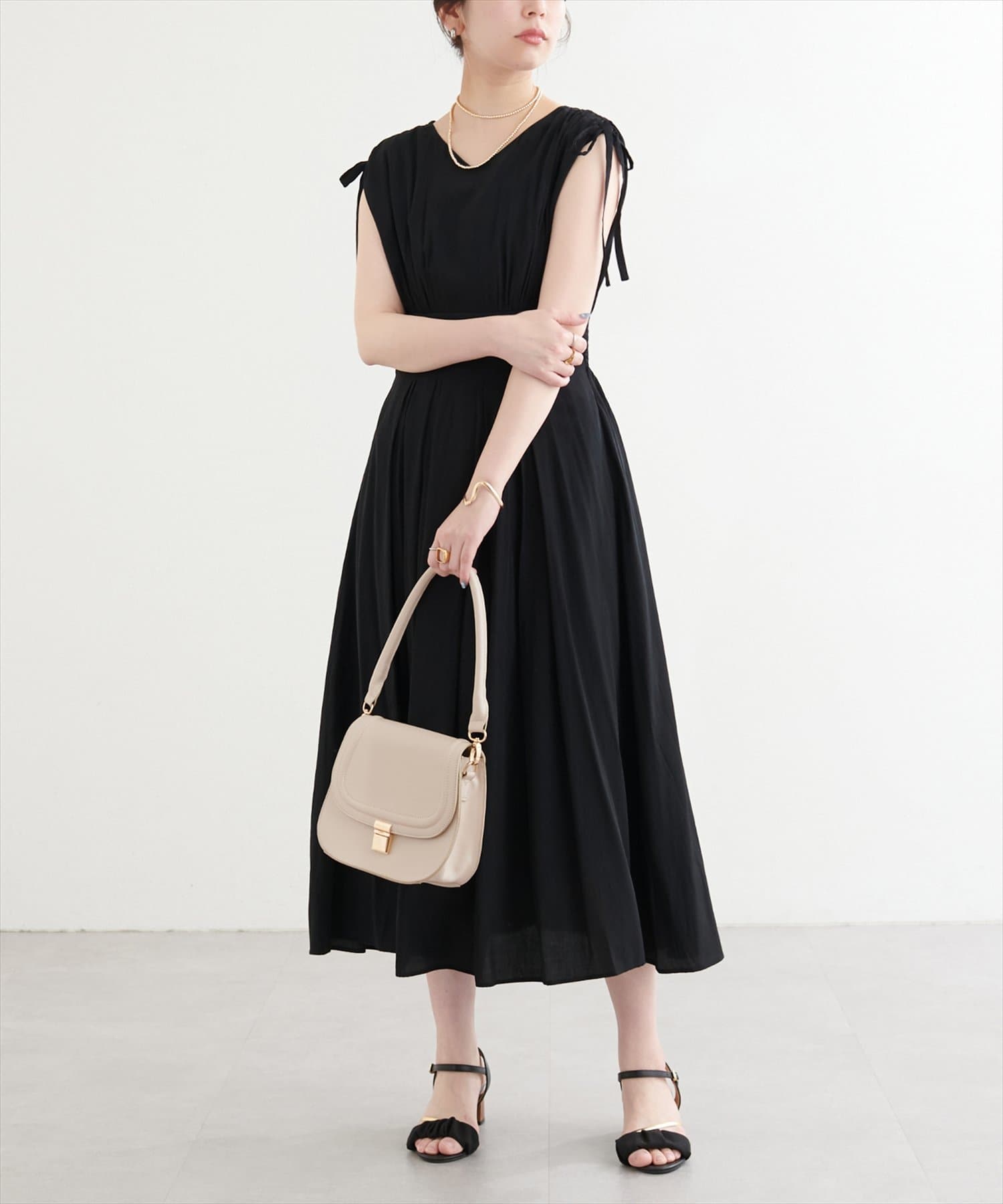 ショルダー部分のドロストリボンで高級感溢れる印象のノースリーブワンピース。