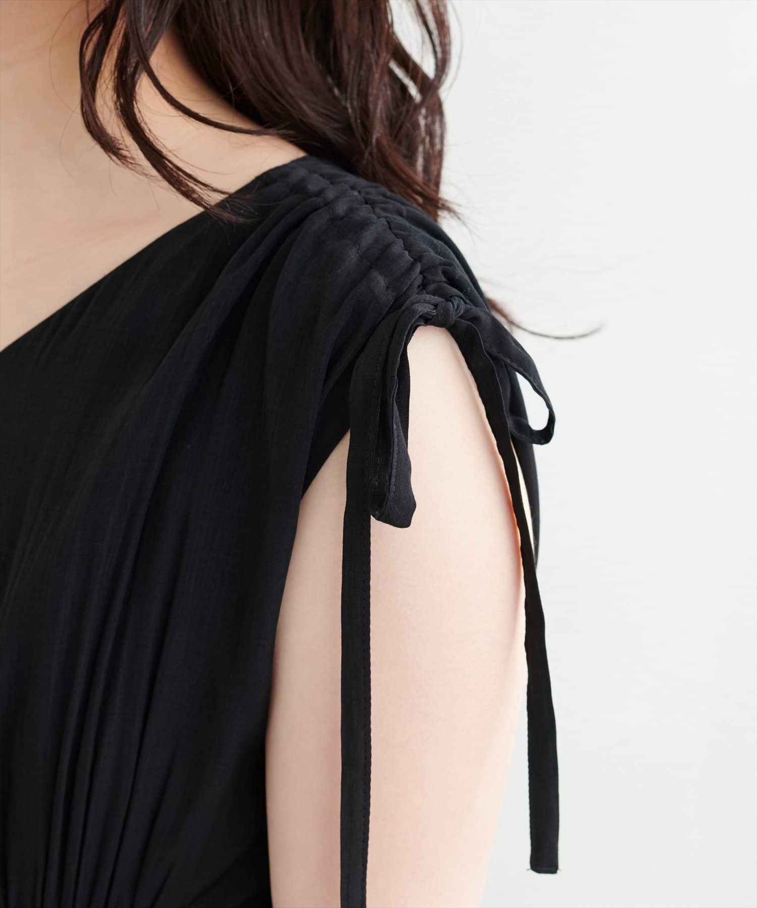 肩のドロストリボンを全て伸ばすとフレンチスリーブデザインが楽しめます。