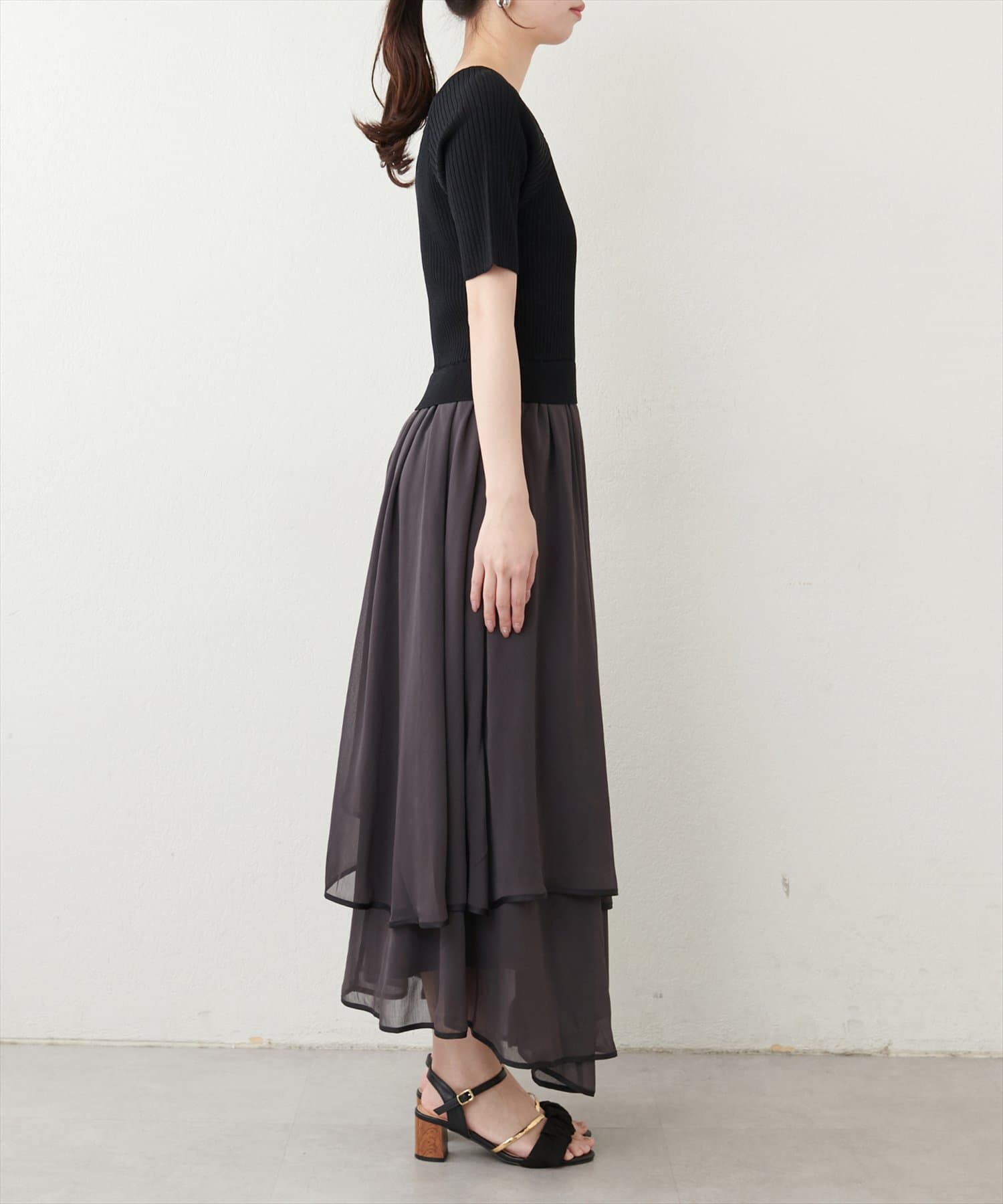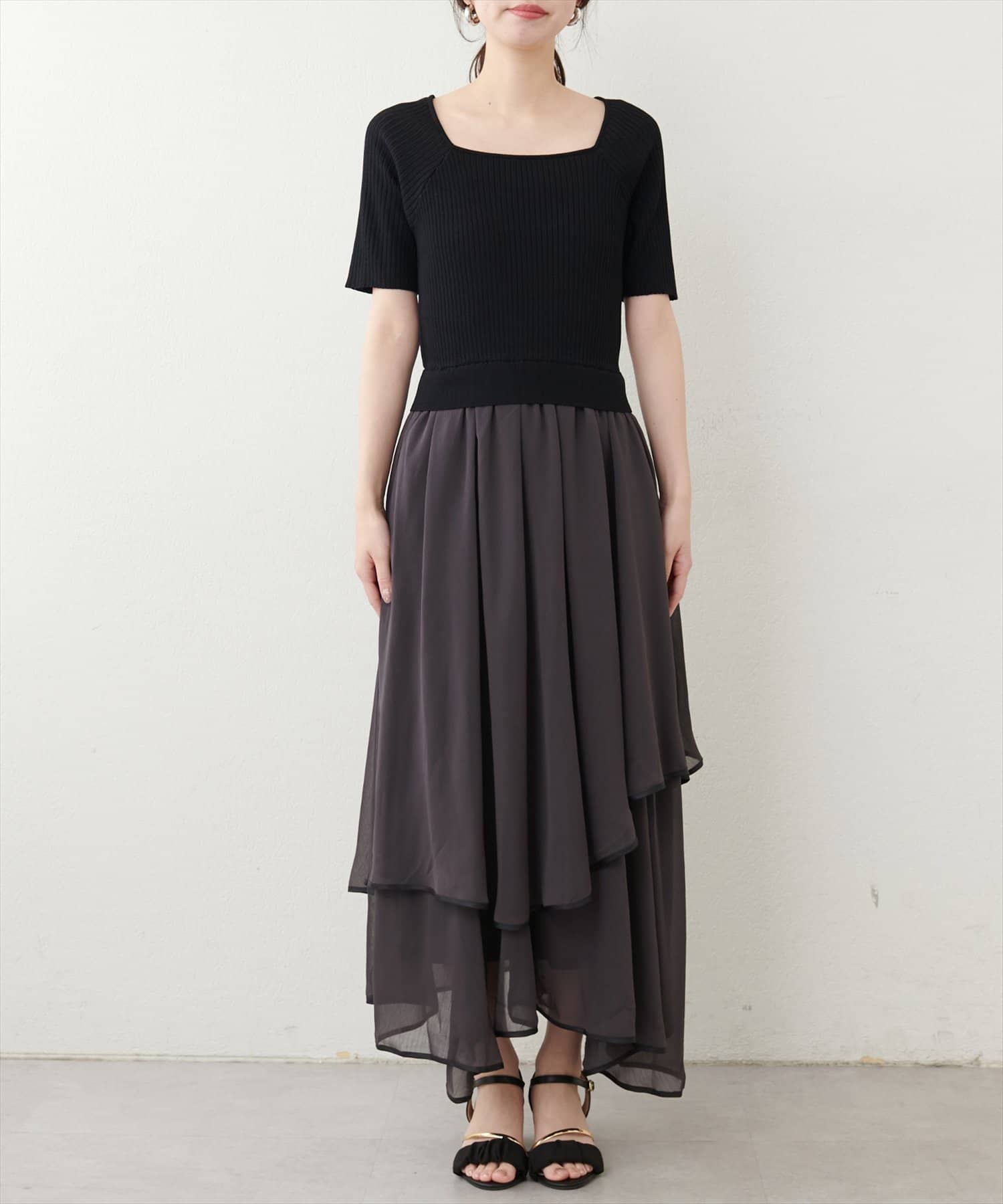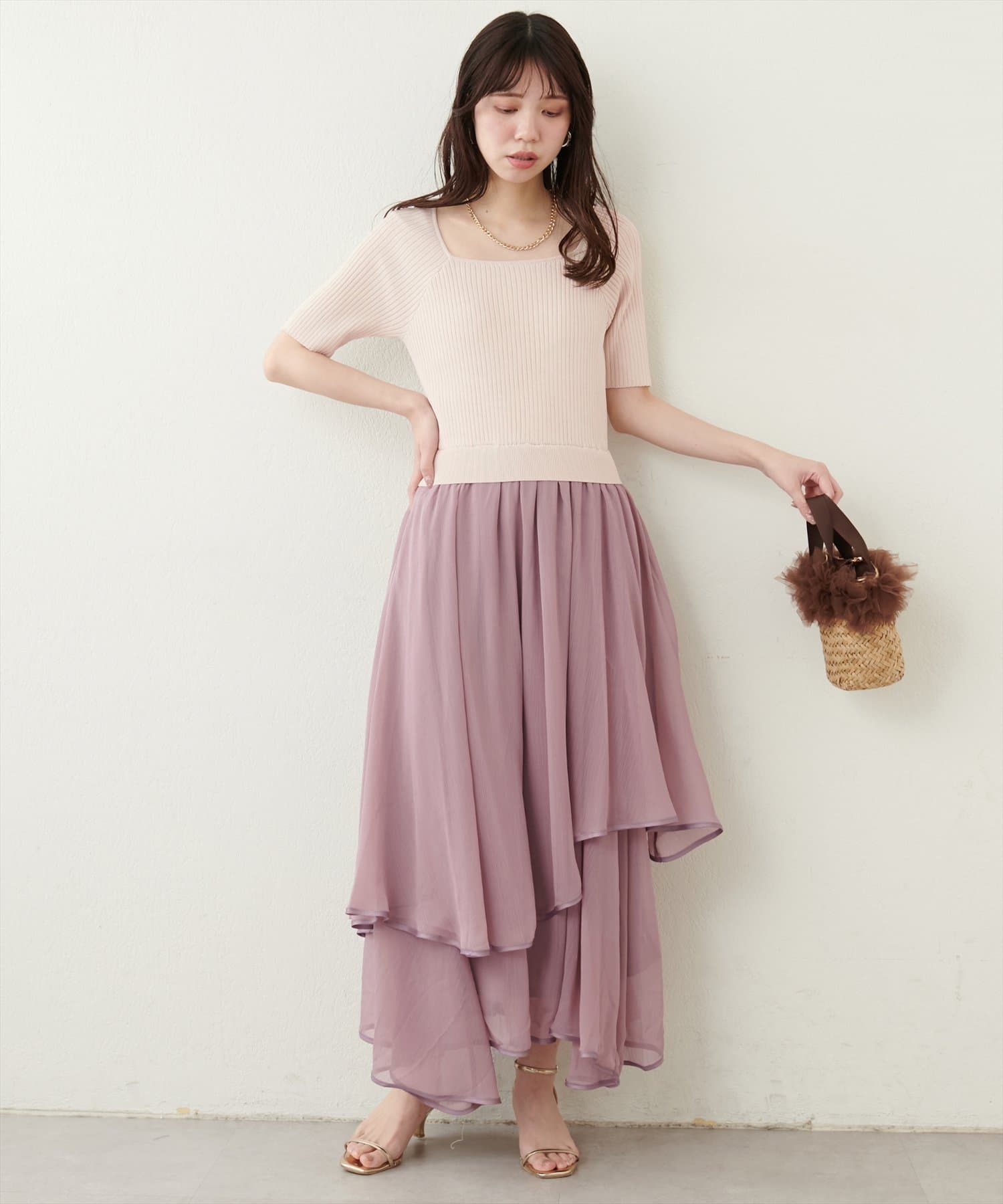 ニットトップスと、ランダムヘムのスカートが一枚になったドッキングワンピース。