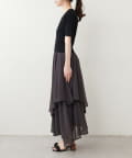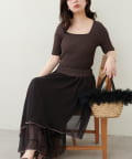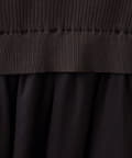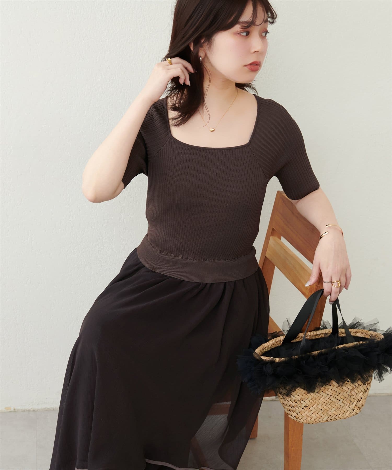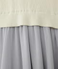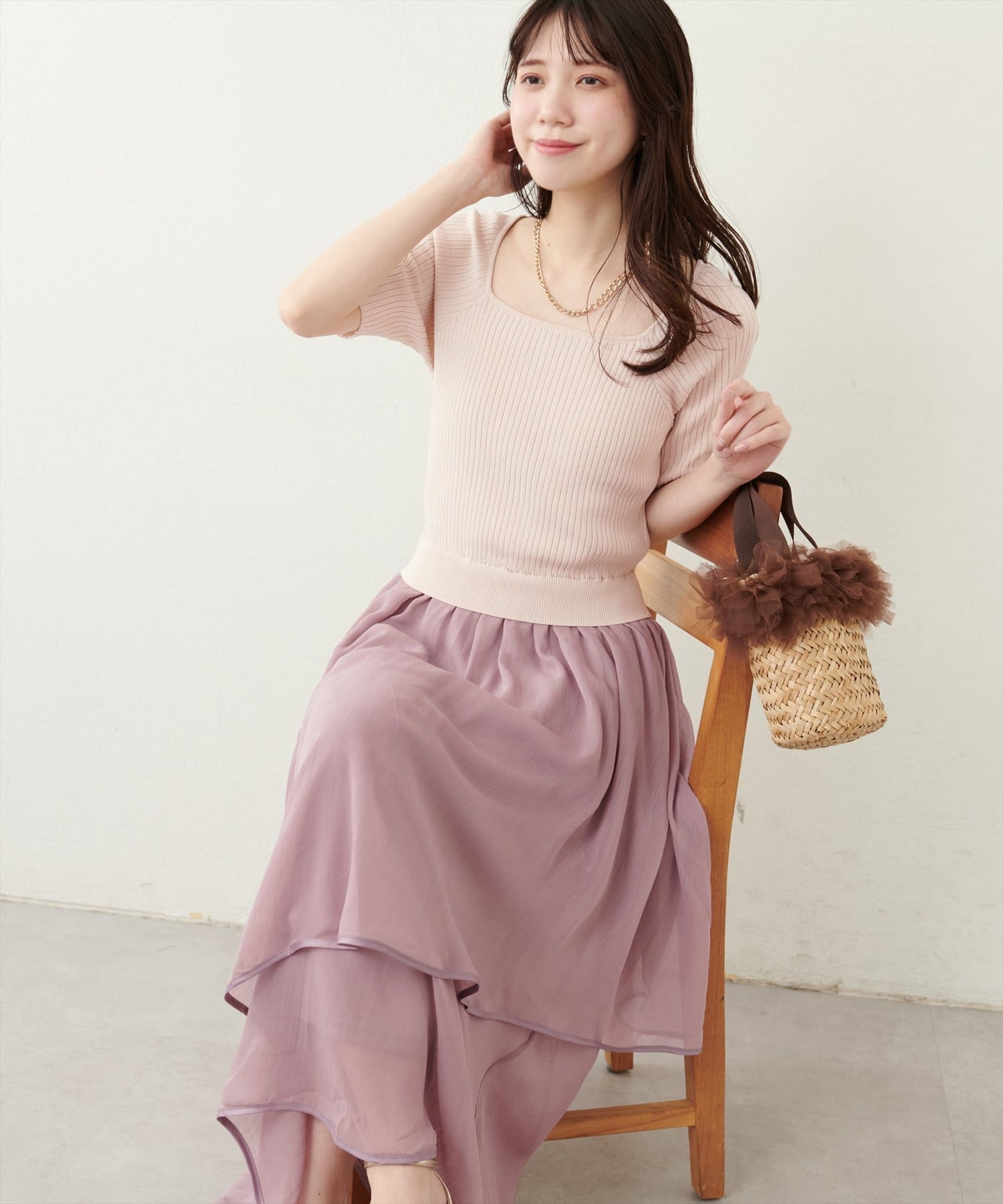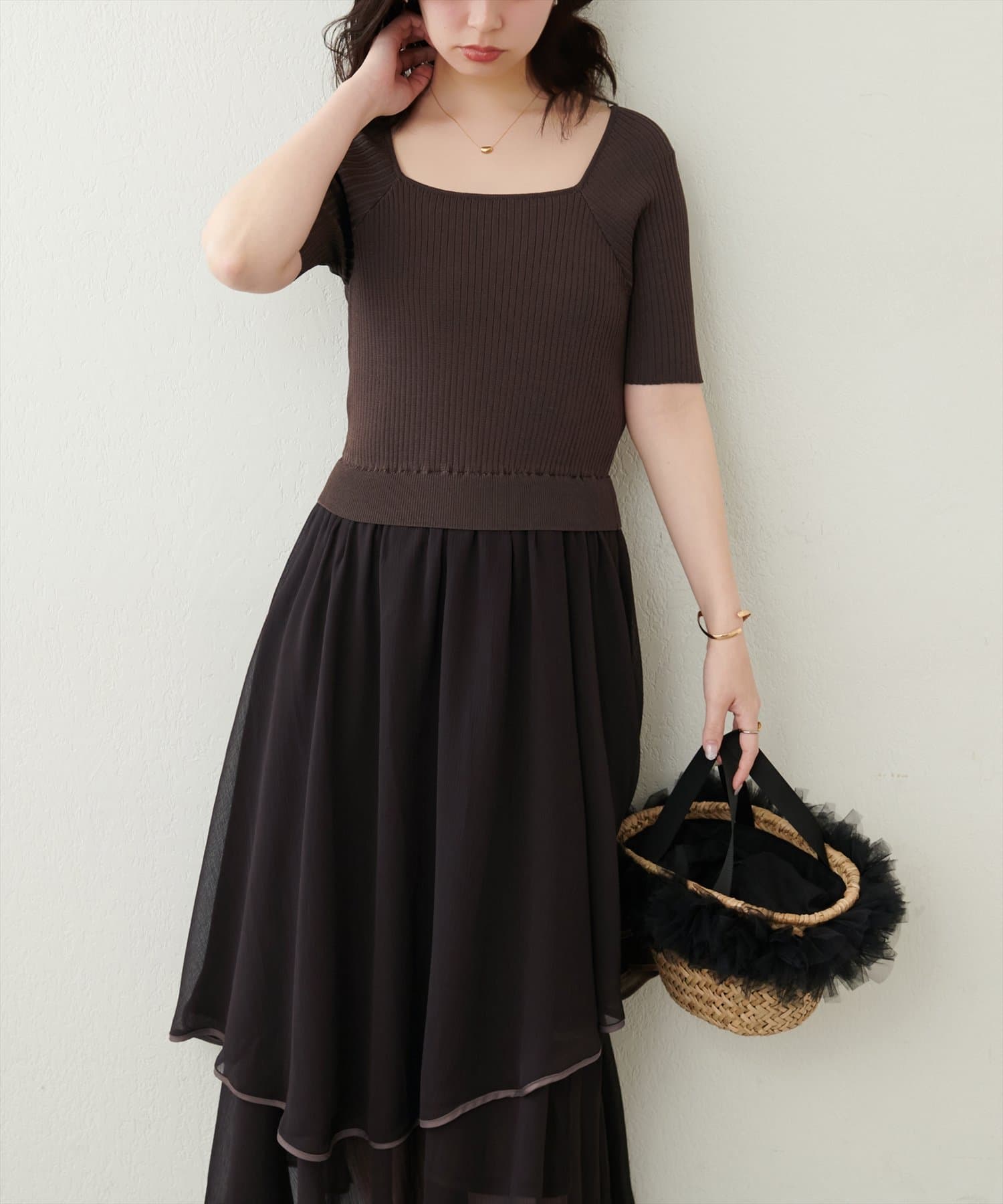 ニットトップスと、ランダムヘムのスカートが一枚になったドッキングワンピース。
