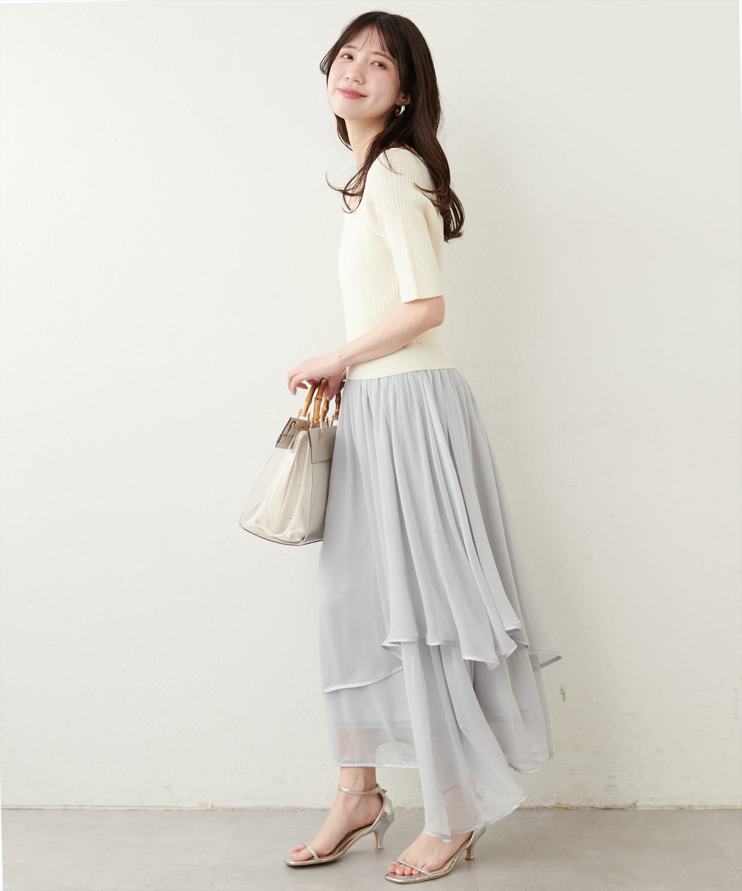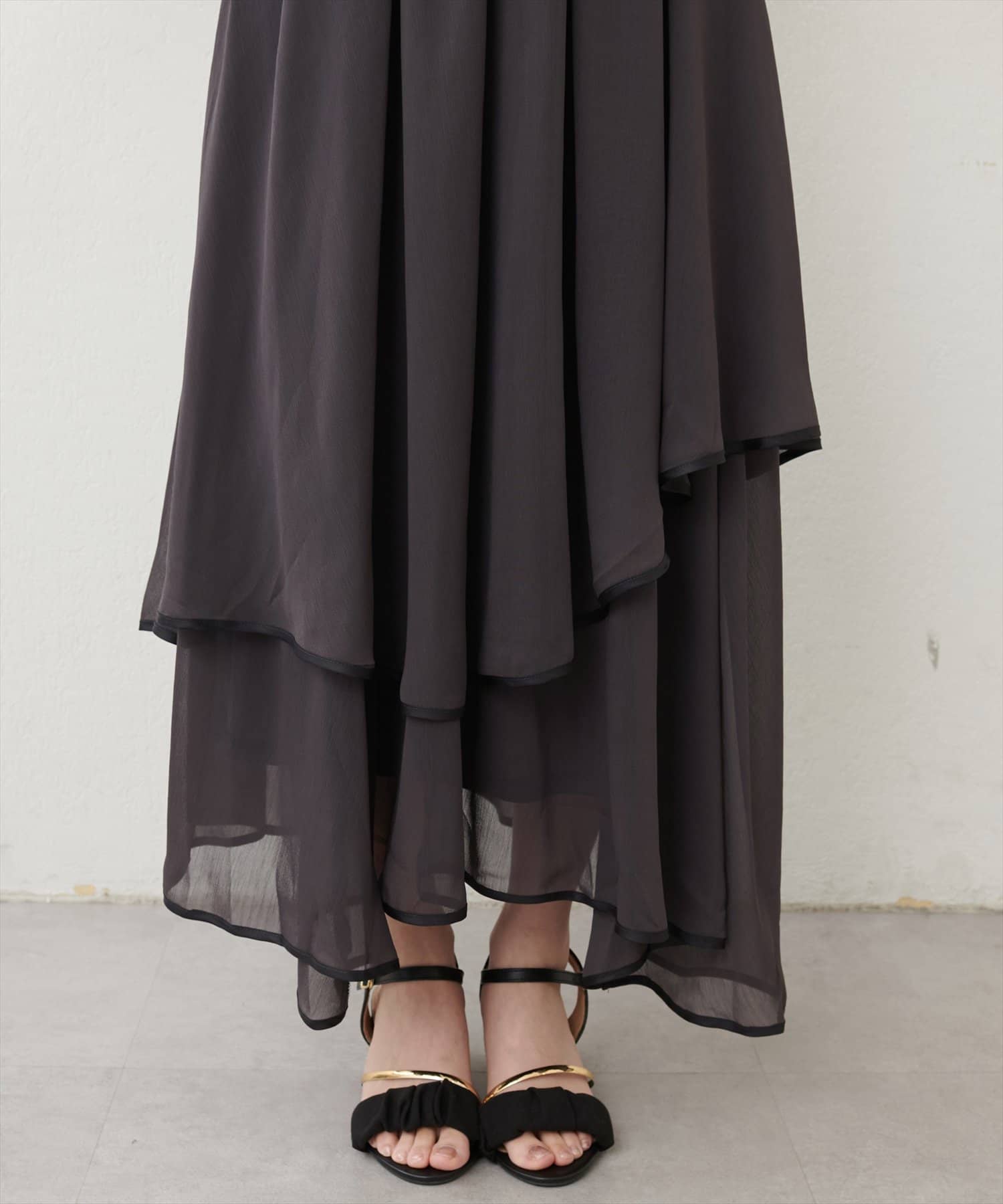 また、スカート部分はヘムを前後でランダムに仕立てたスカートとなっており、