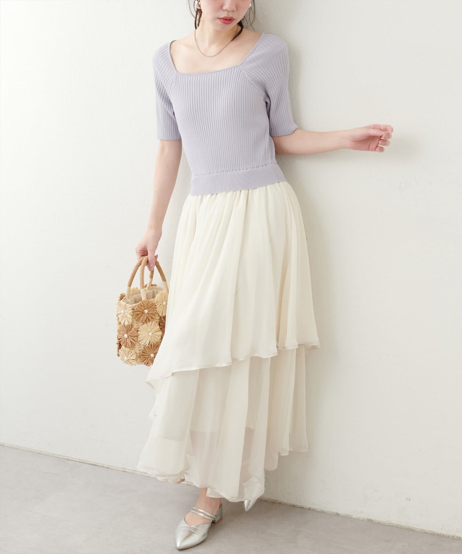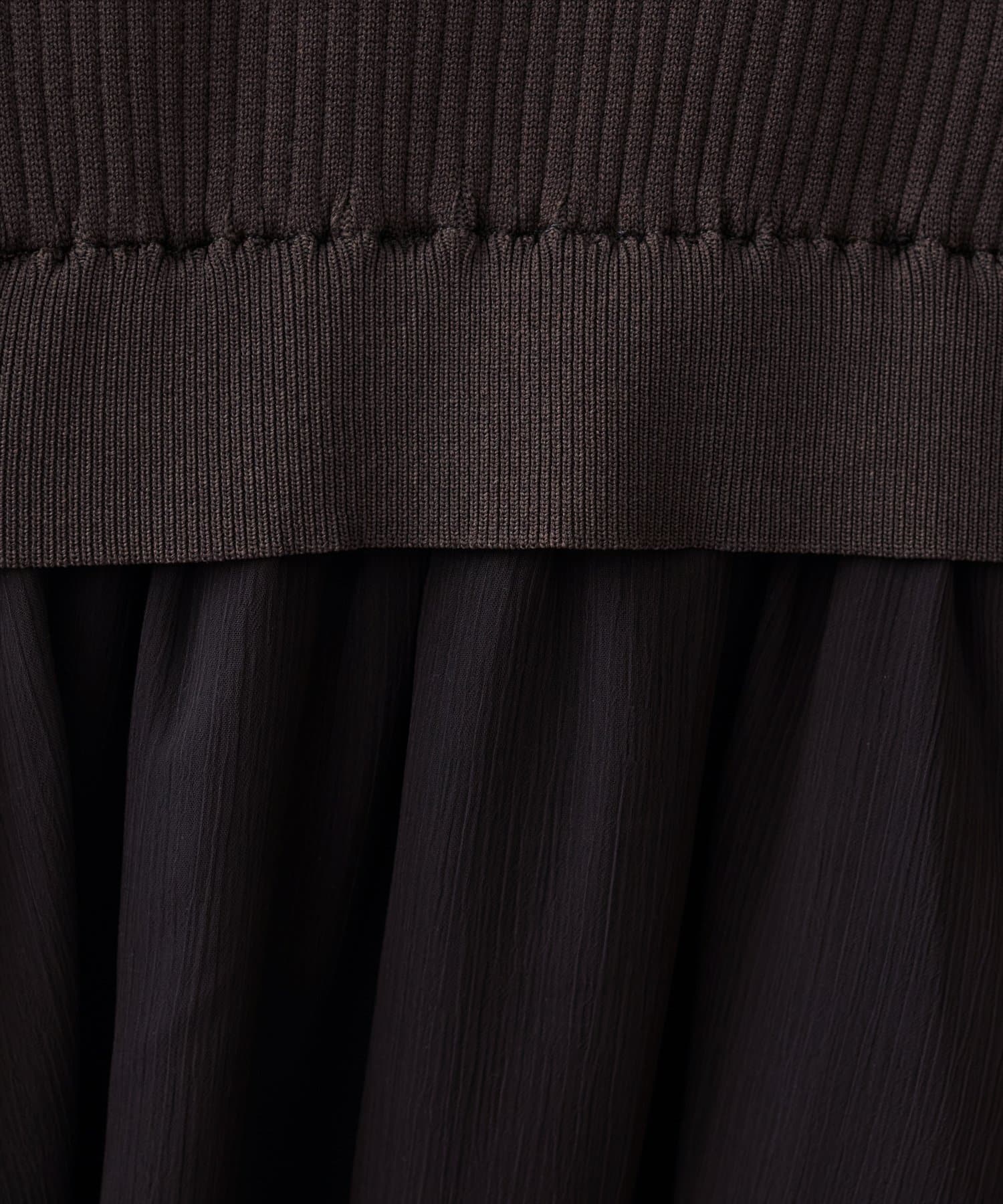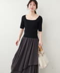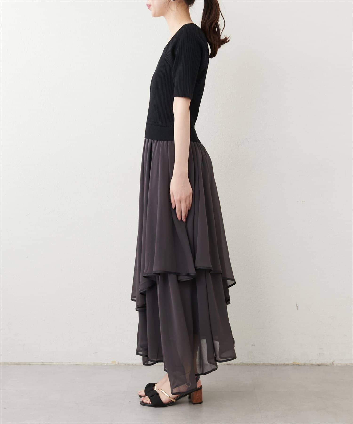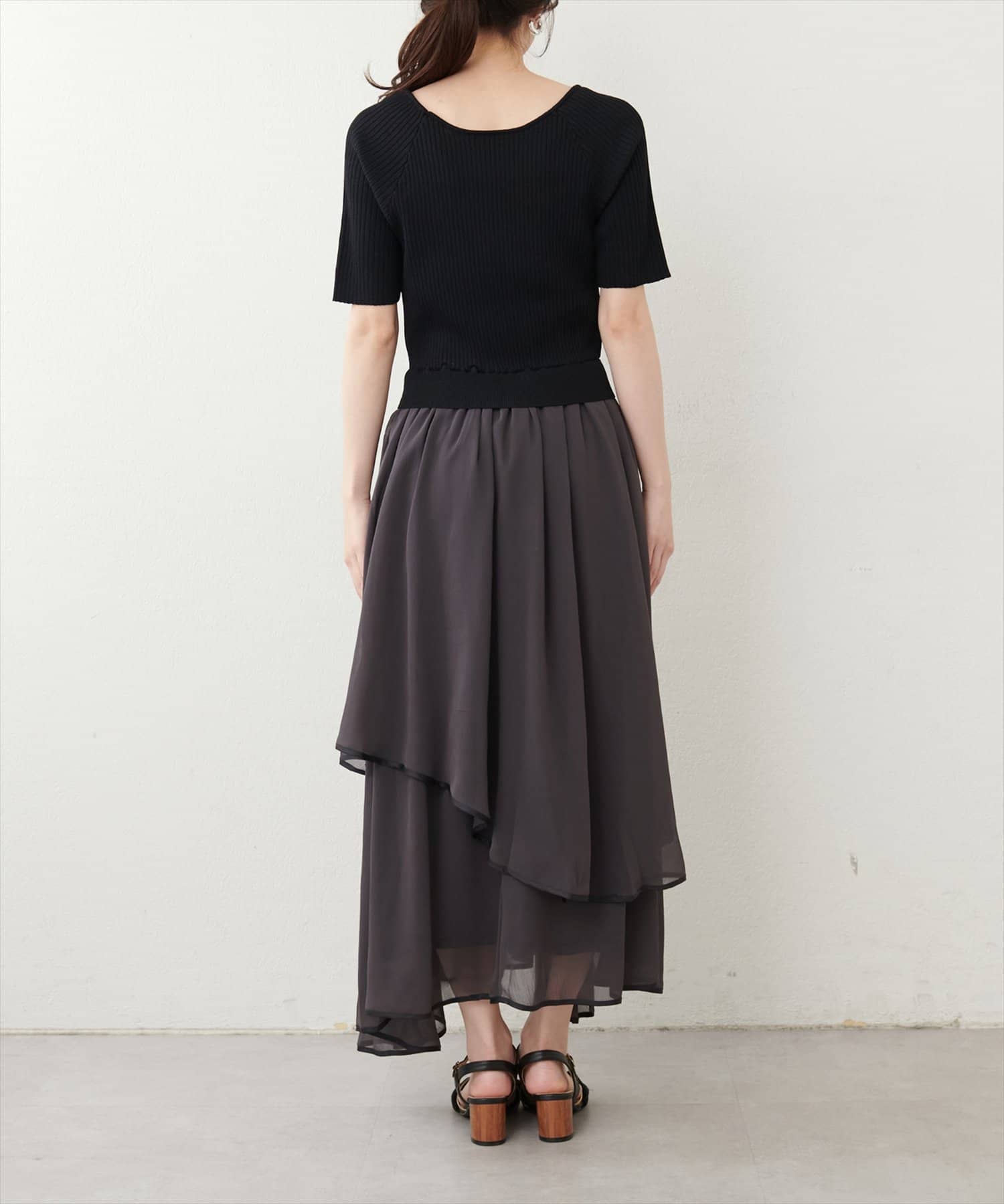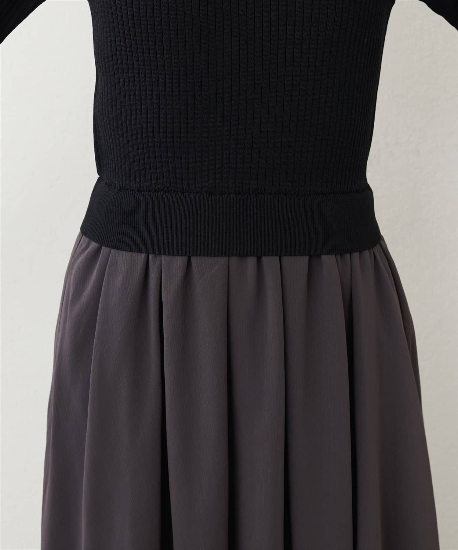 ニットトップスと、ランダムヘムのスカートが一枚になったドッキングワンピース。