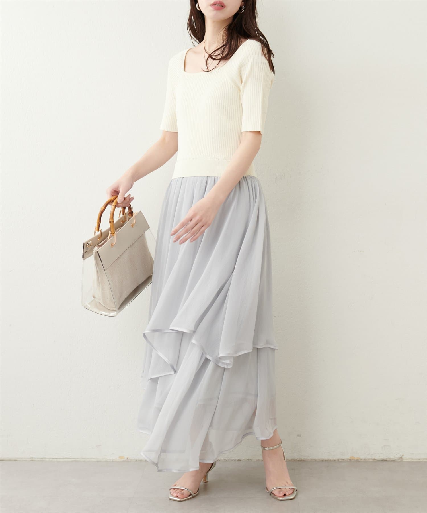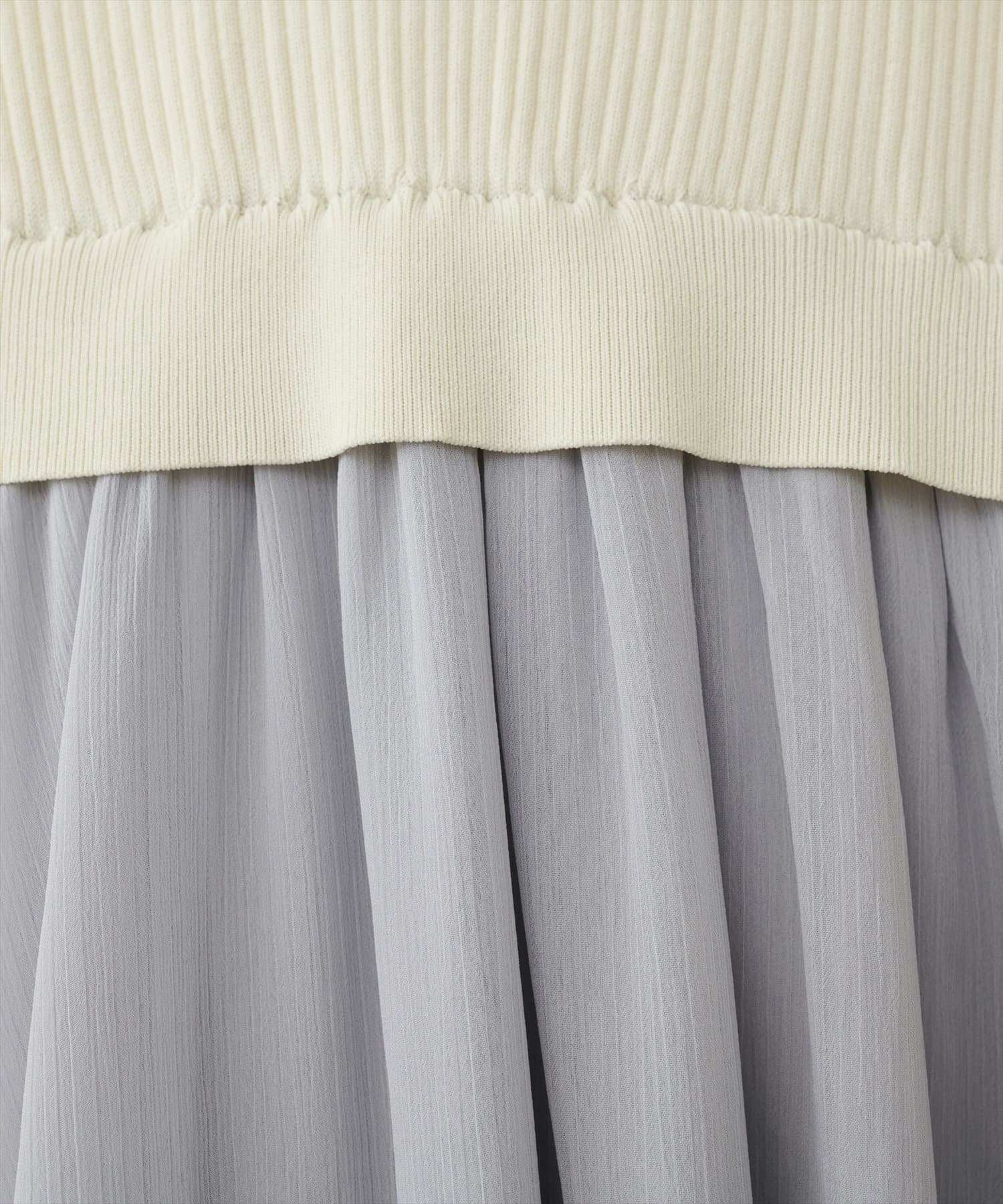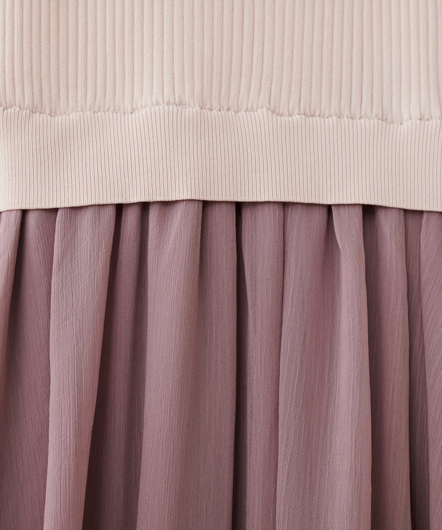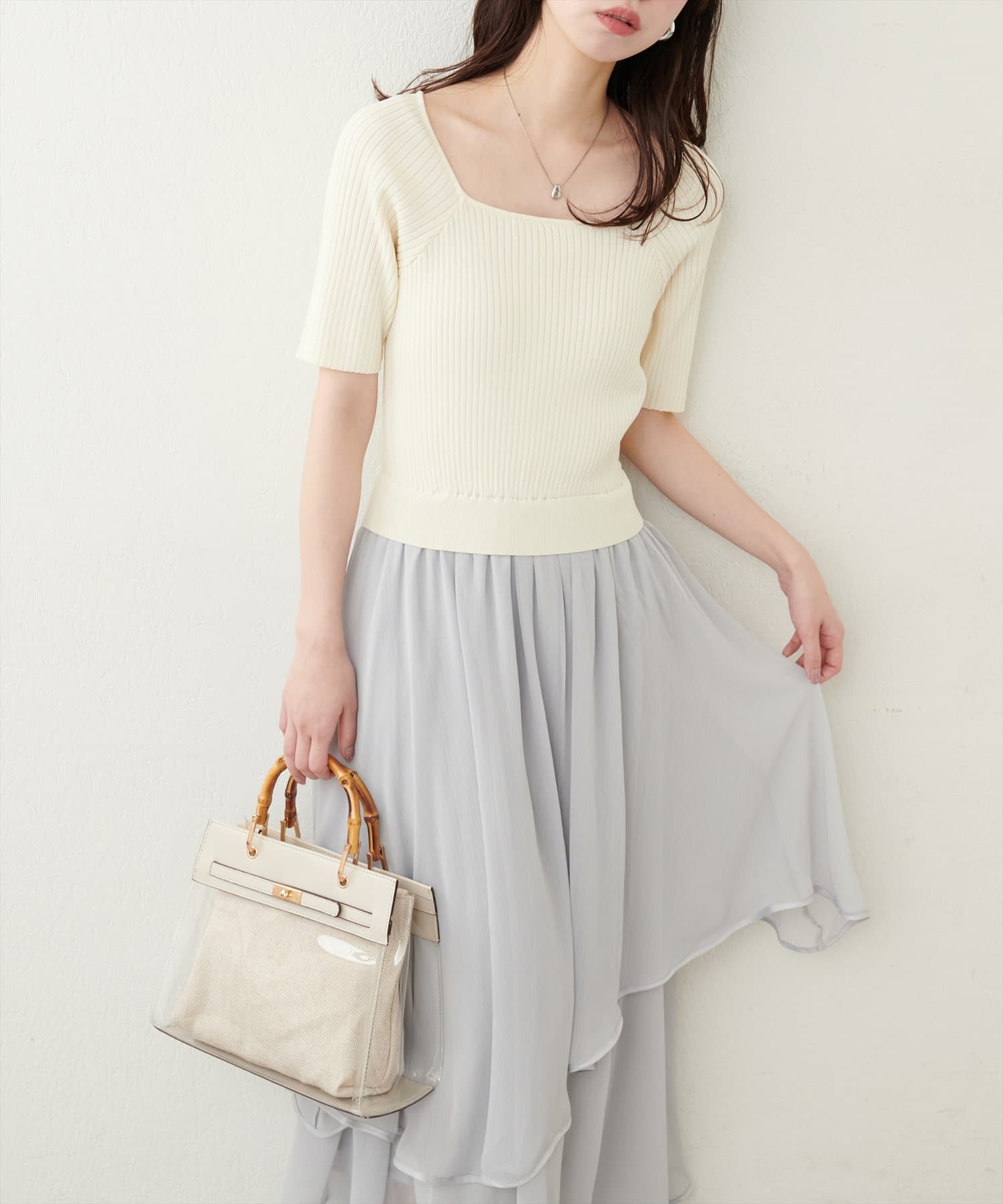 ニットトップスと、ランダムヘムのスカートが一枚になったドッキングワンピース。