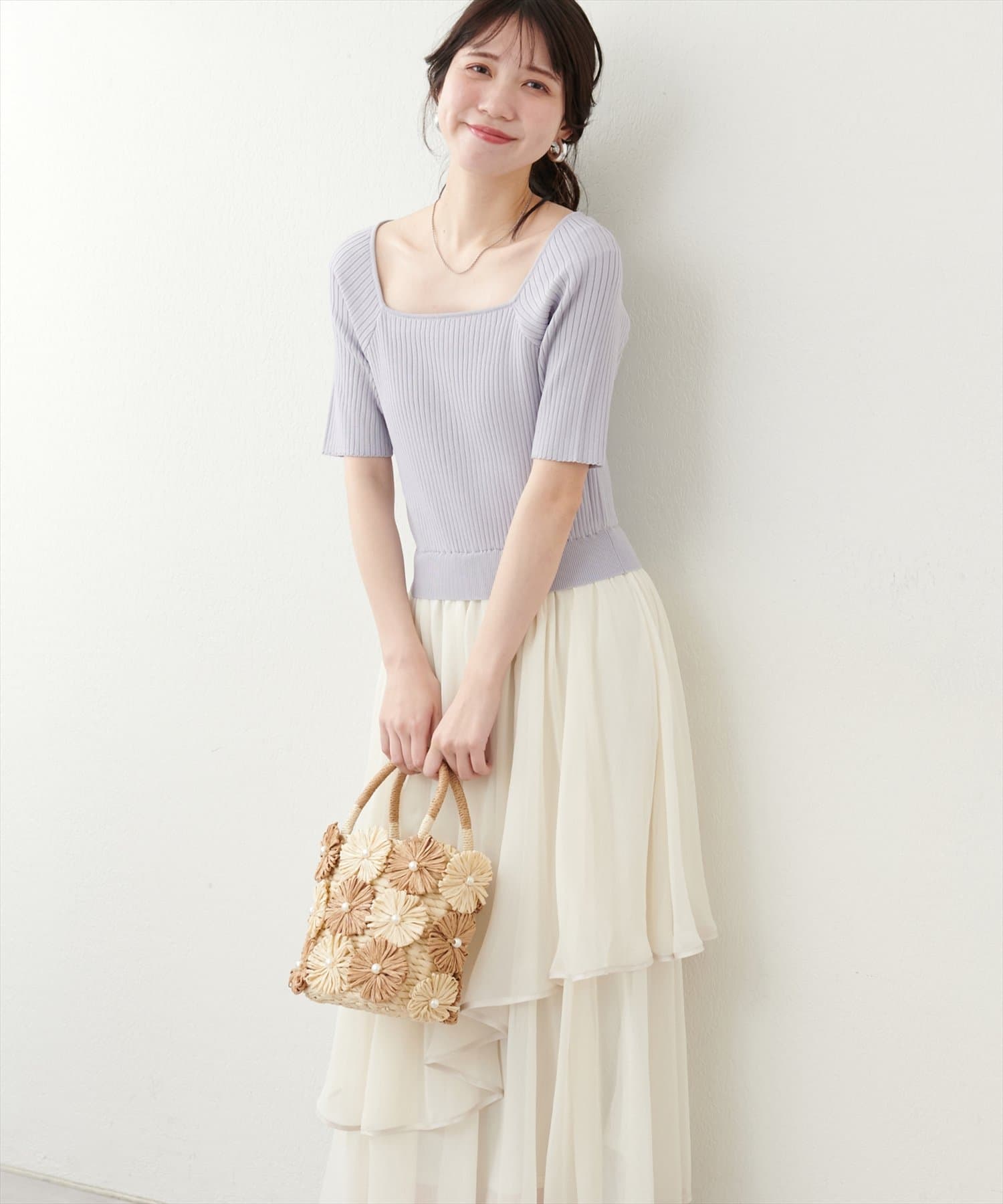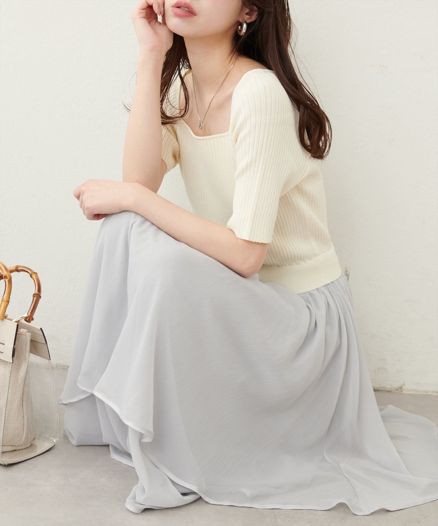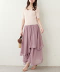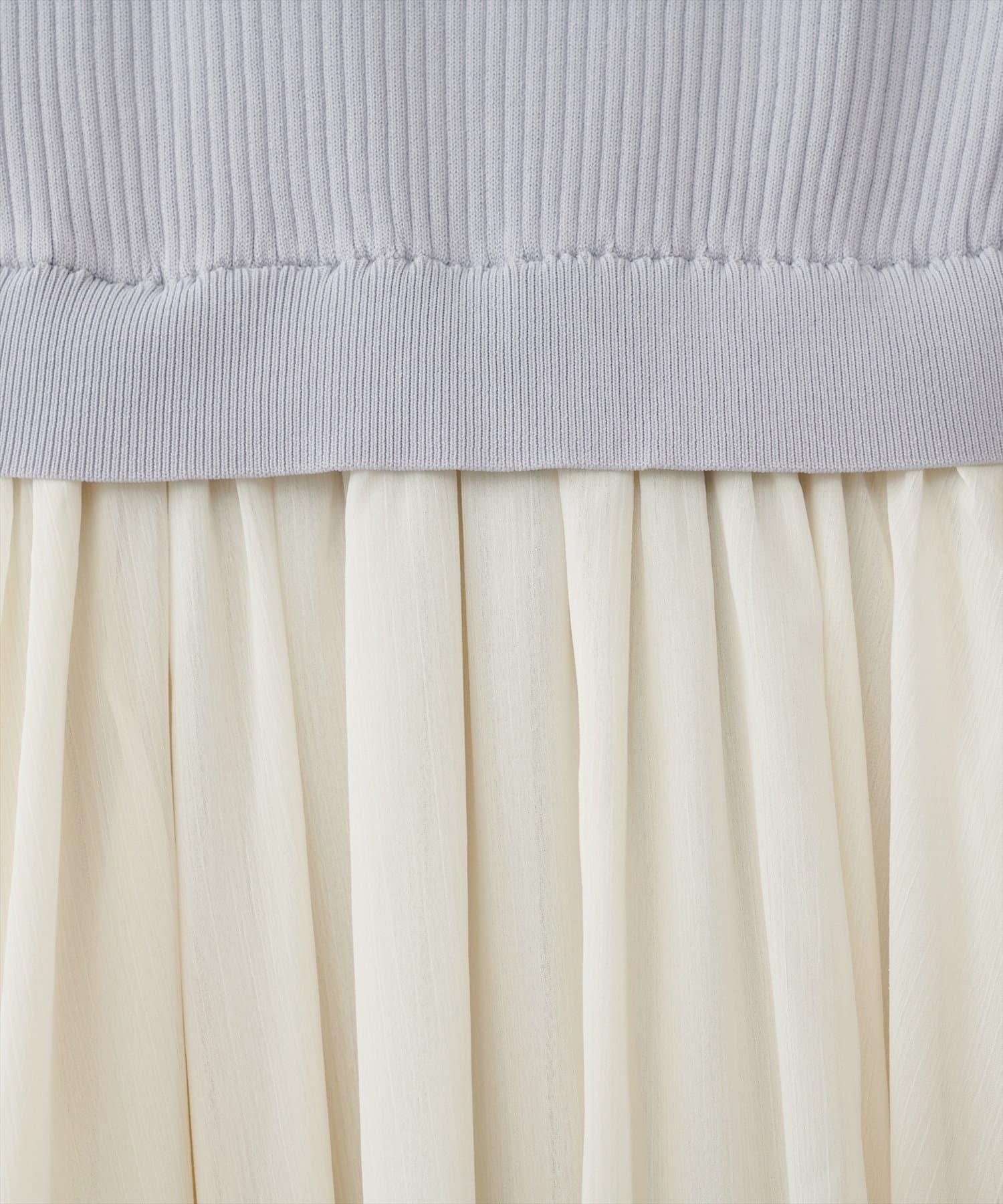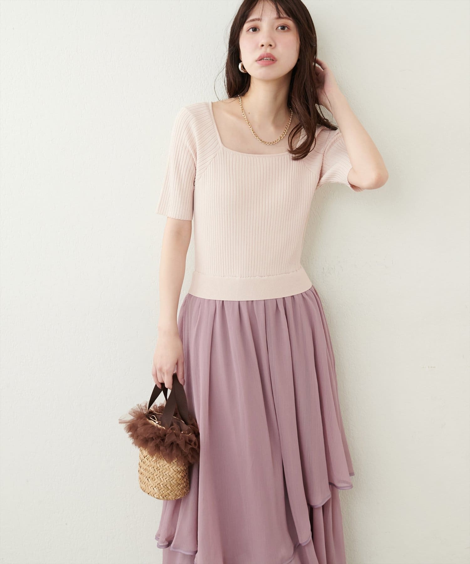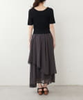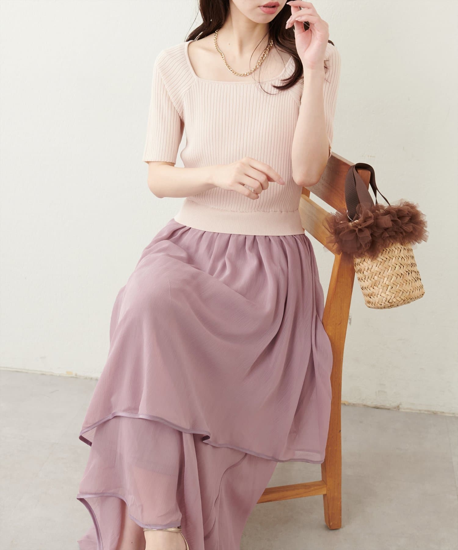 ニットトップスと、ランダムヘムのスカートが一枚になったドッキングワンピース。