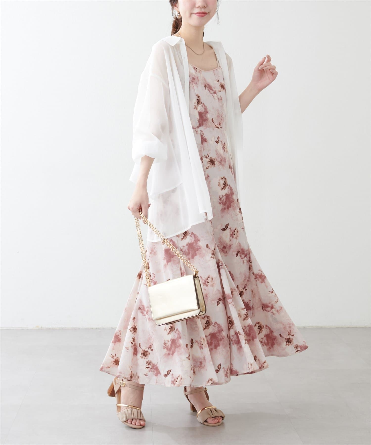 1枚でそのまま着ても華やかな柄が映えるコーデになります。