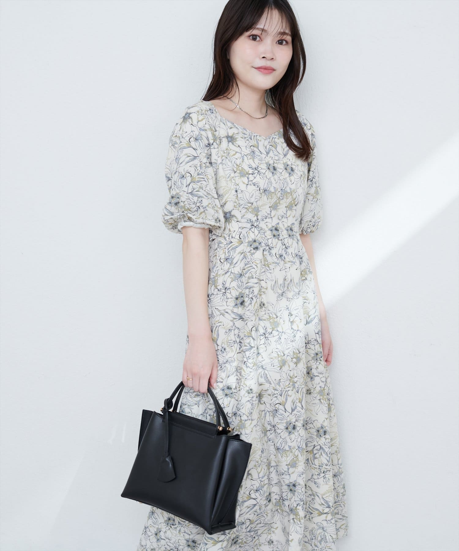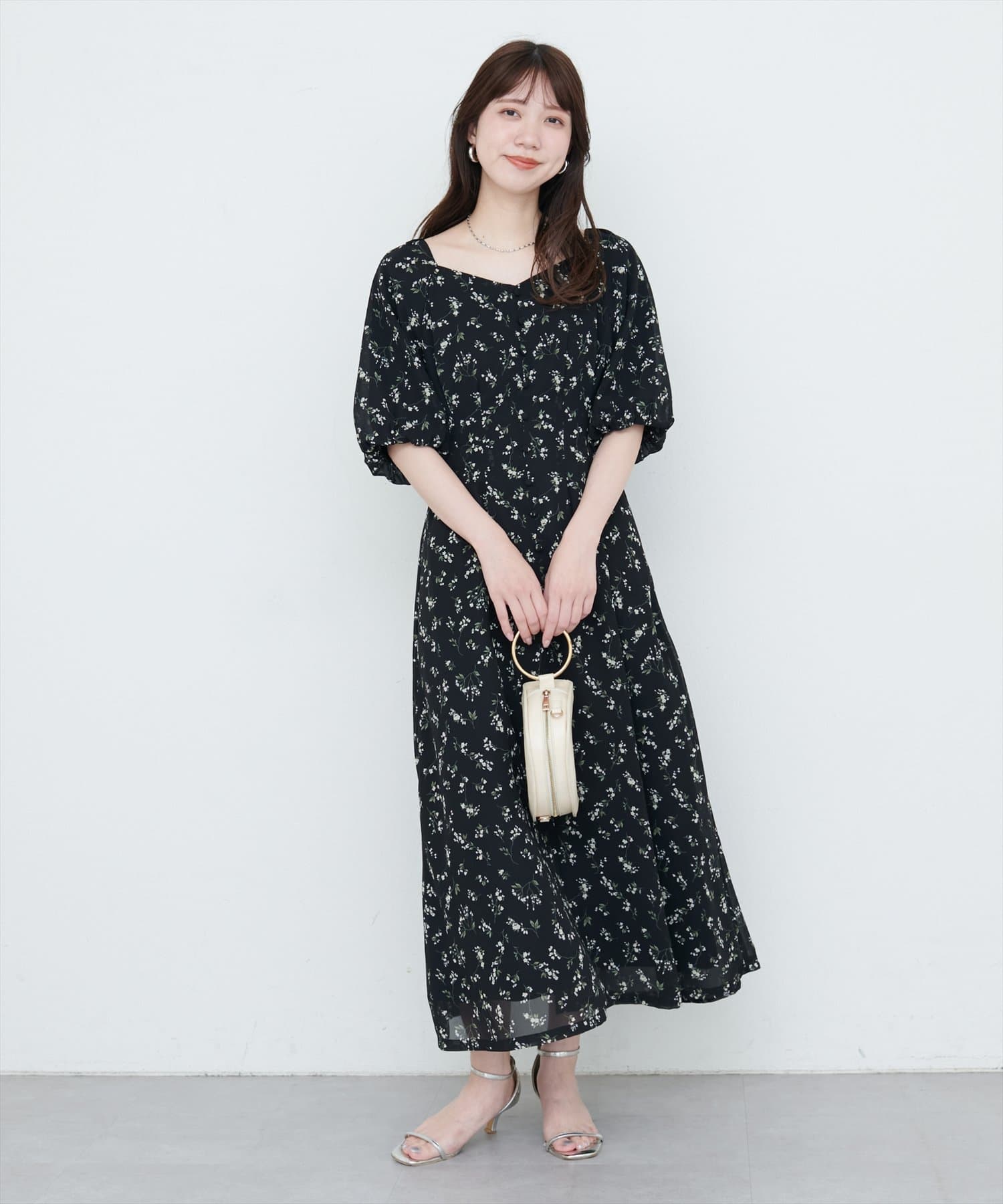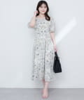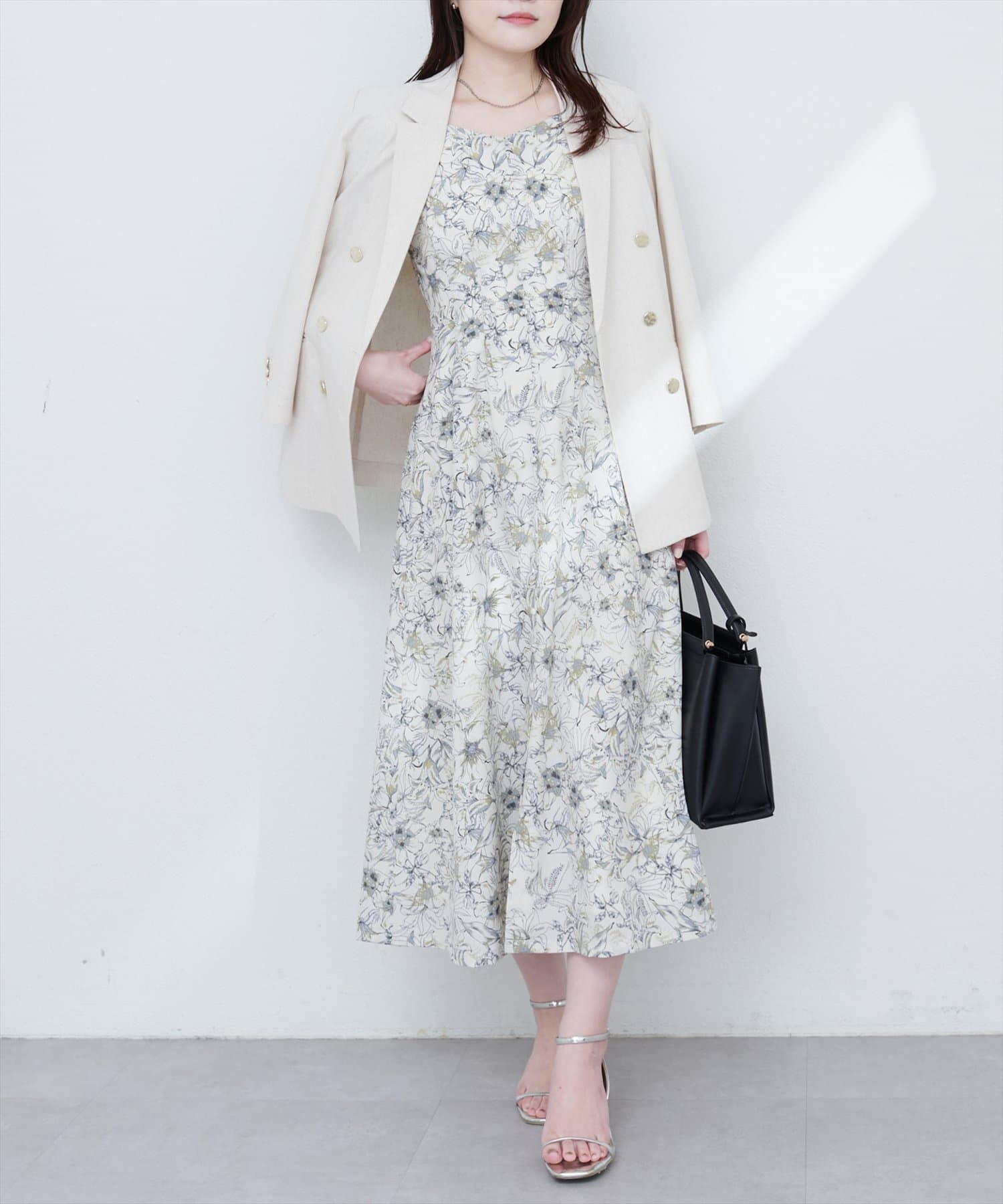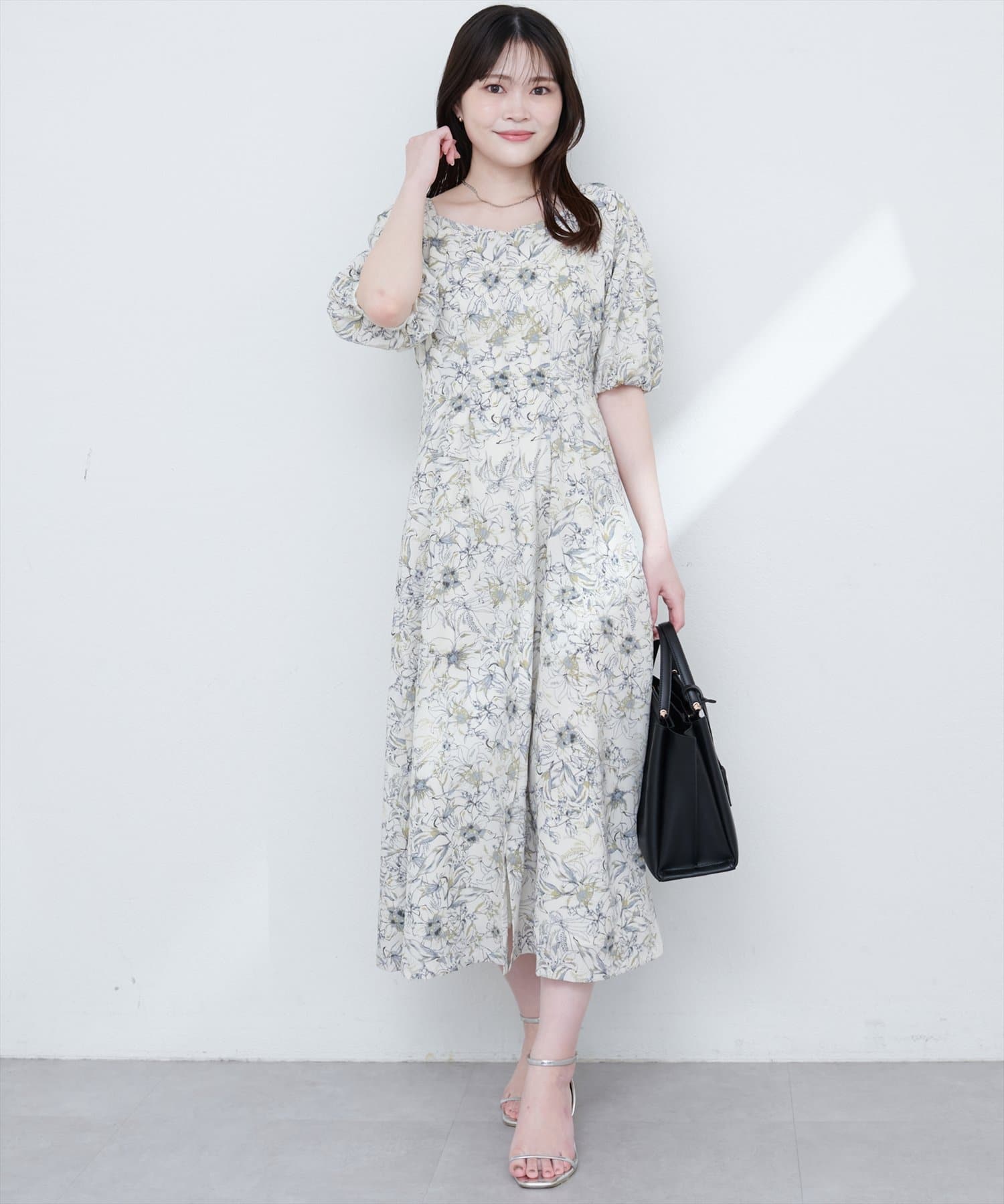 鮮やかな色合いのフラワープリントが目を引く、上品なワンピース。