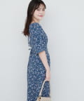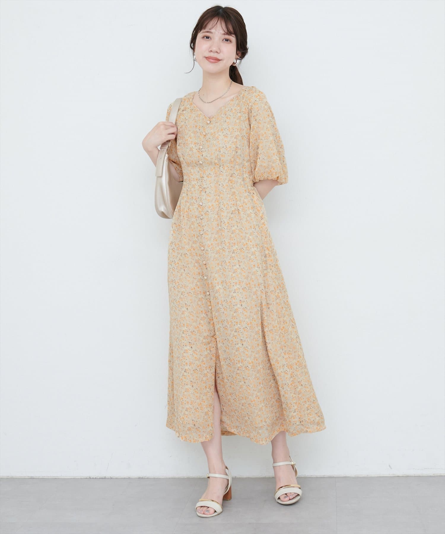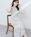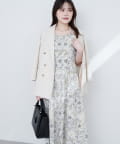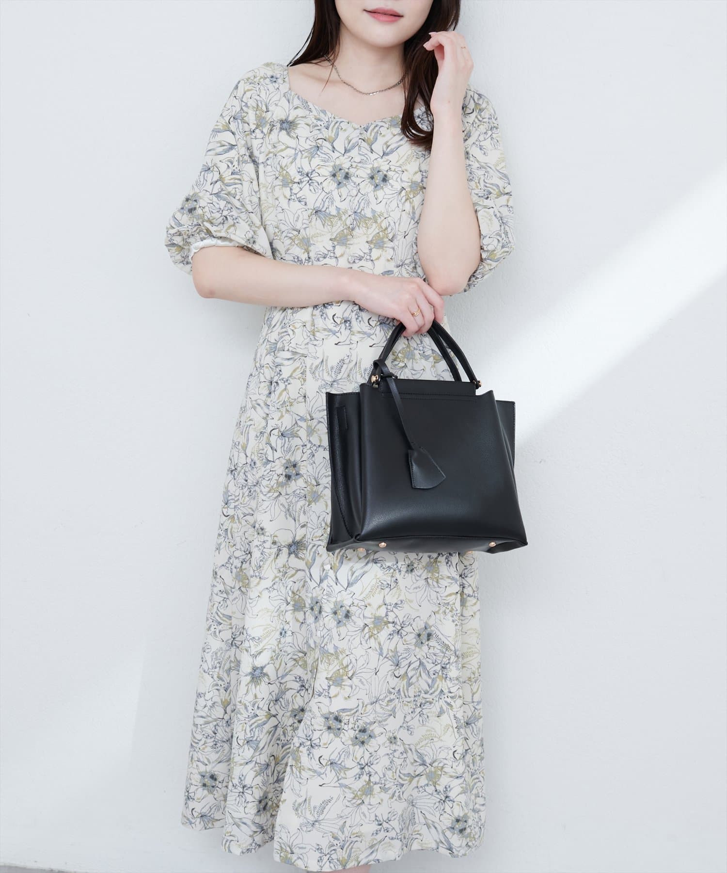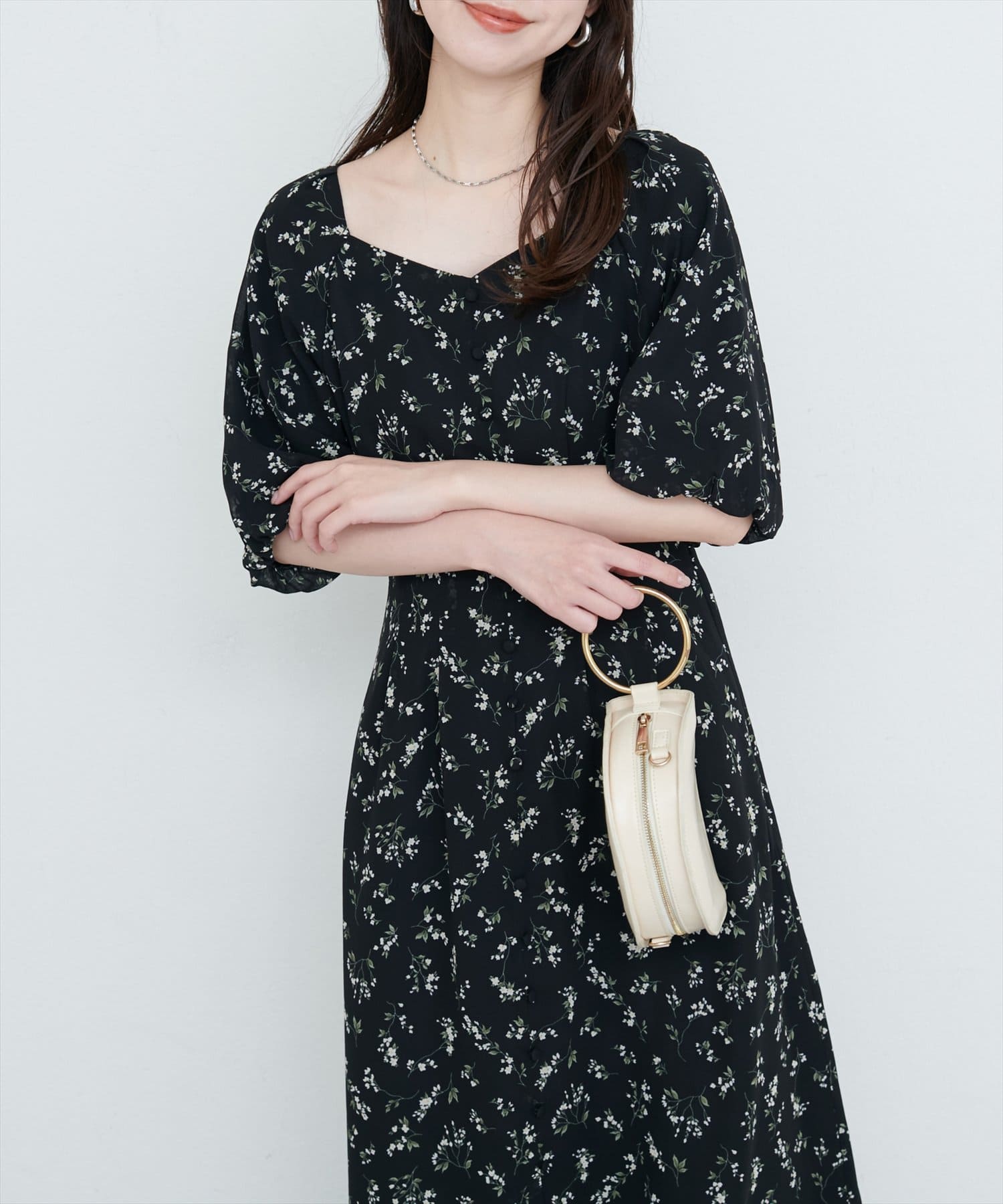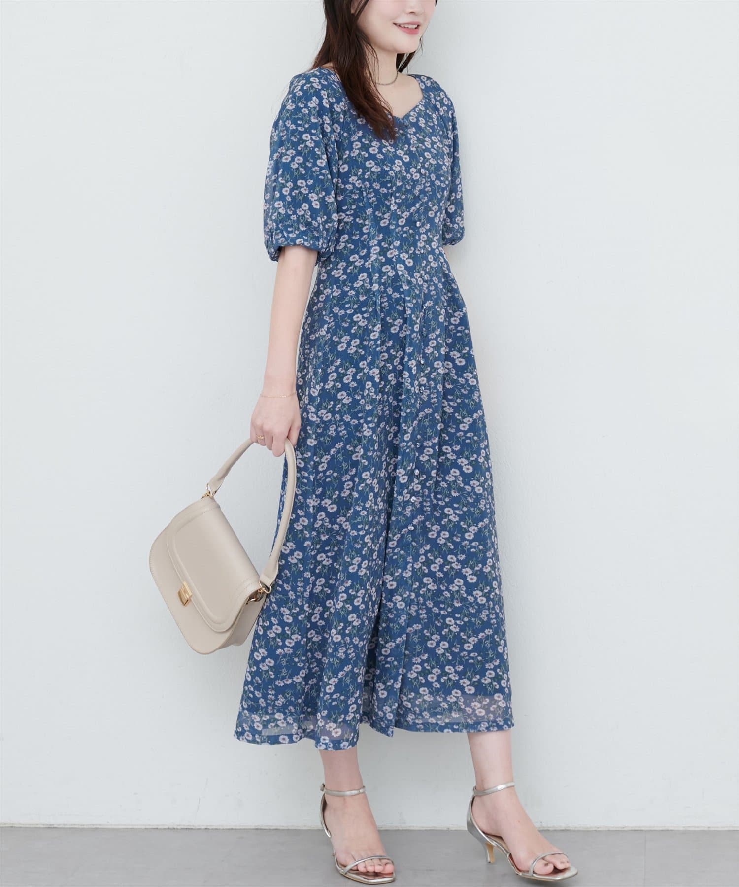 鮮やかな色合いのフラワープリントが目を引く、上品なワンピース。