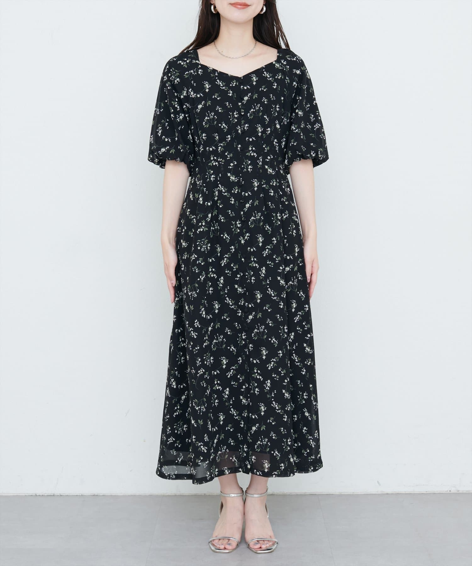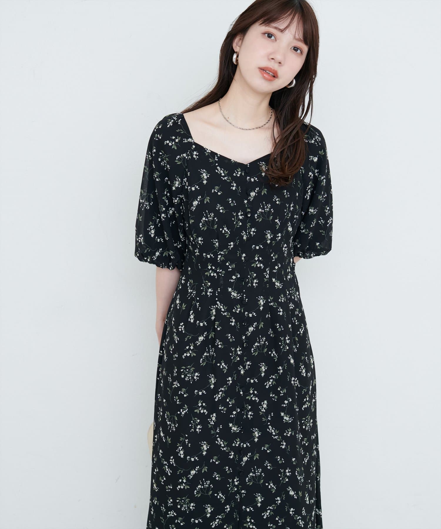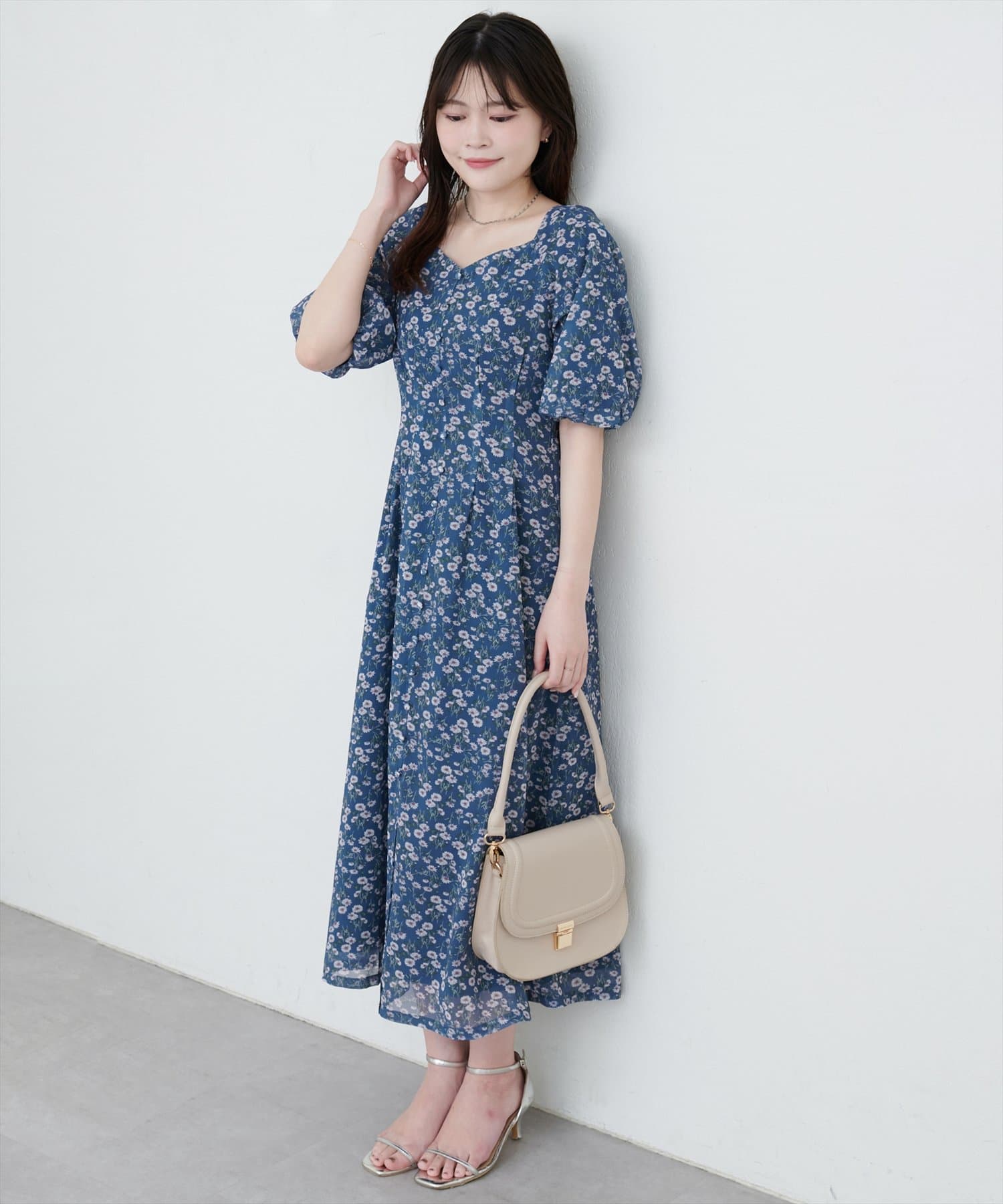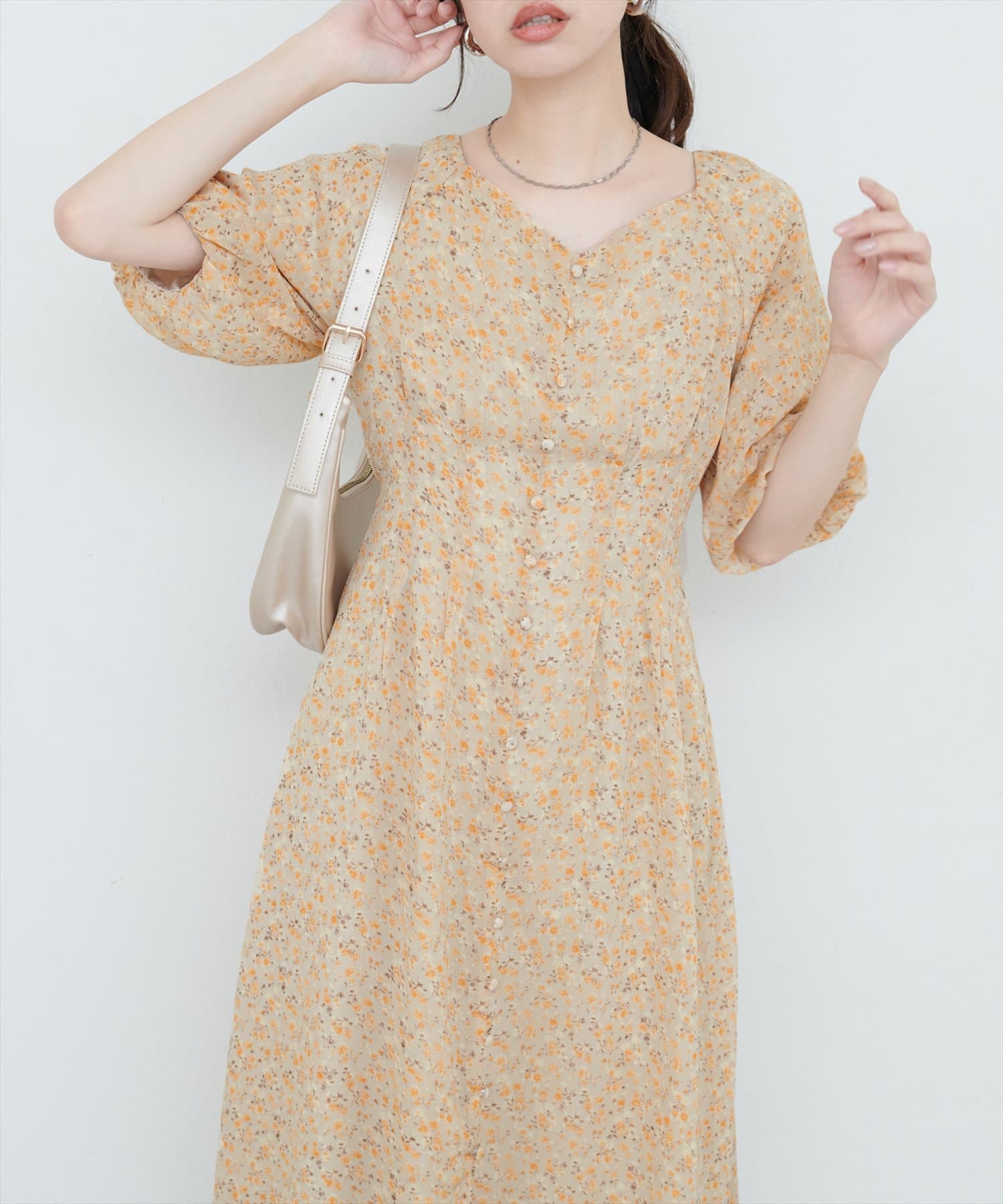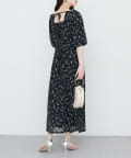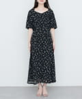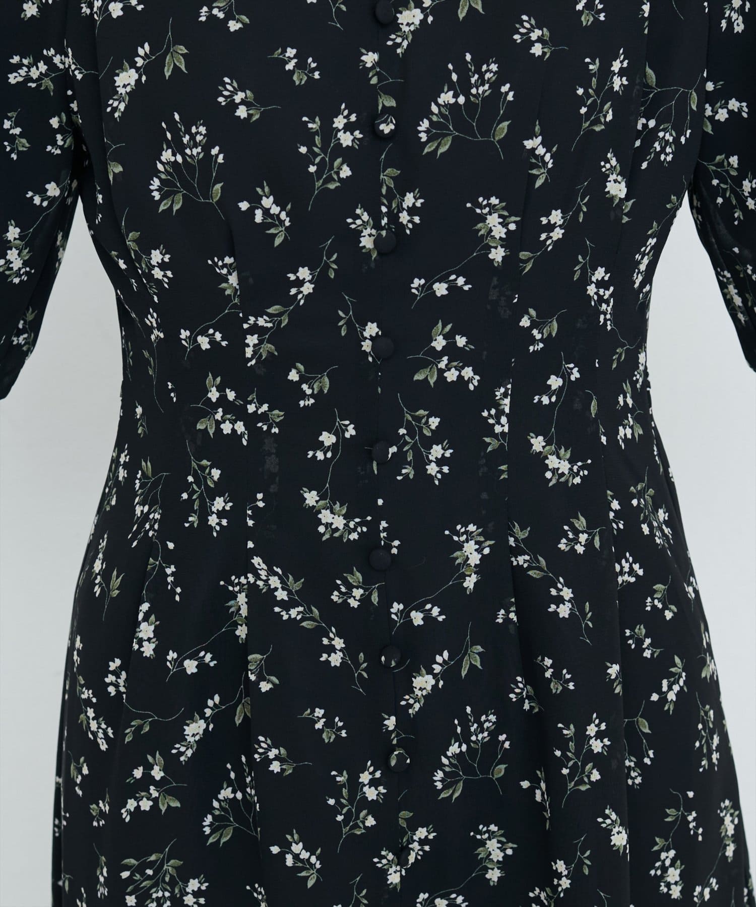 鮮やかな色合いのフラワープリントが目を引く、上品なワンピース。