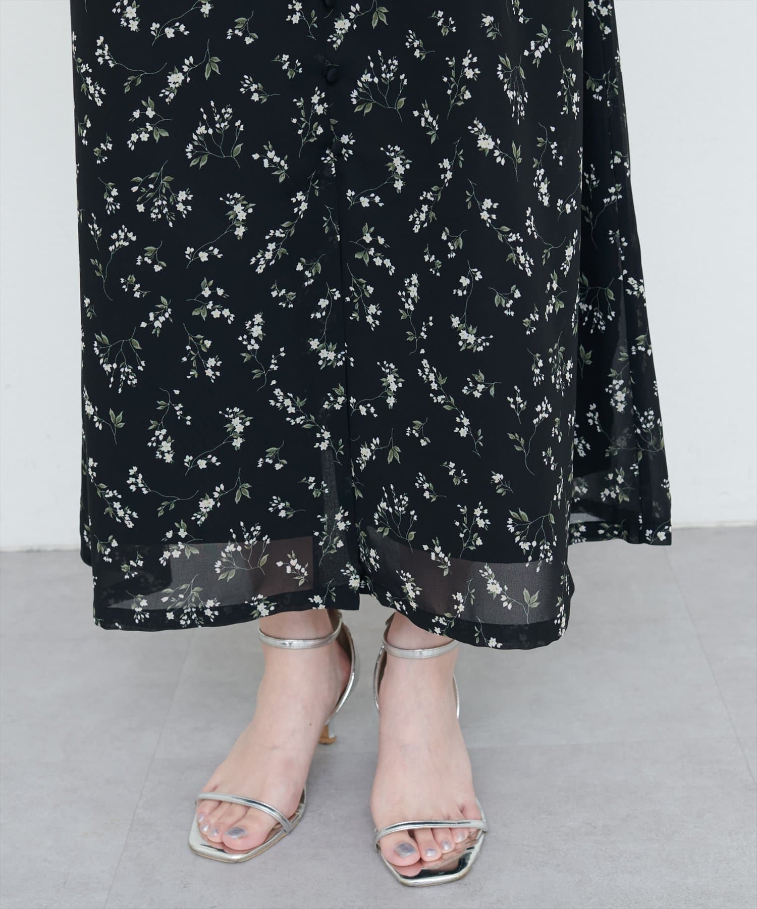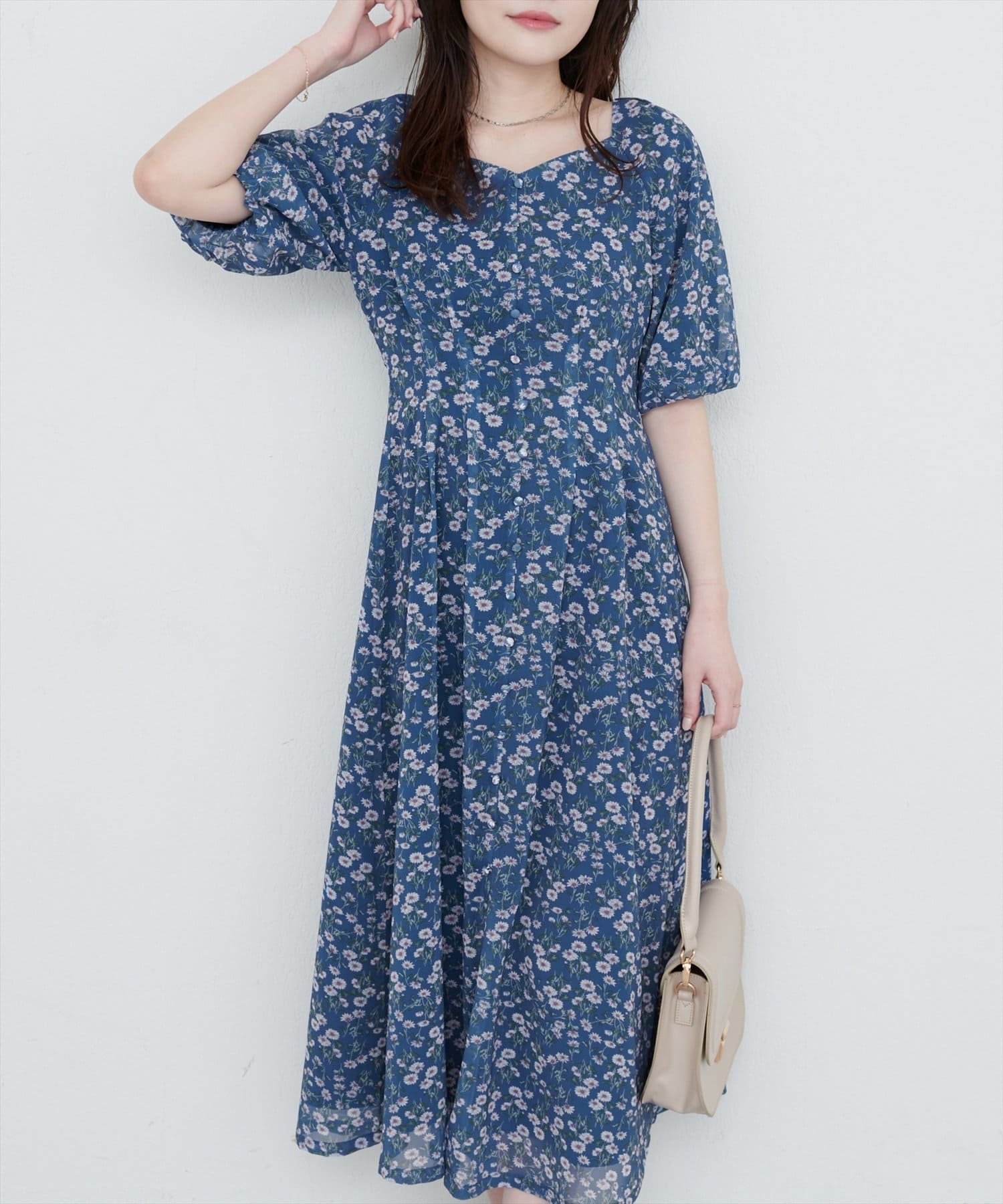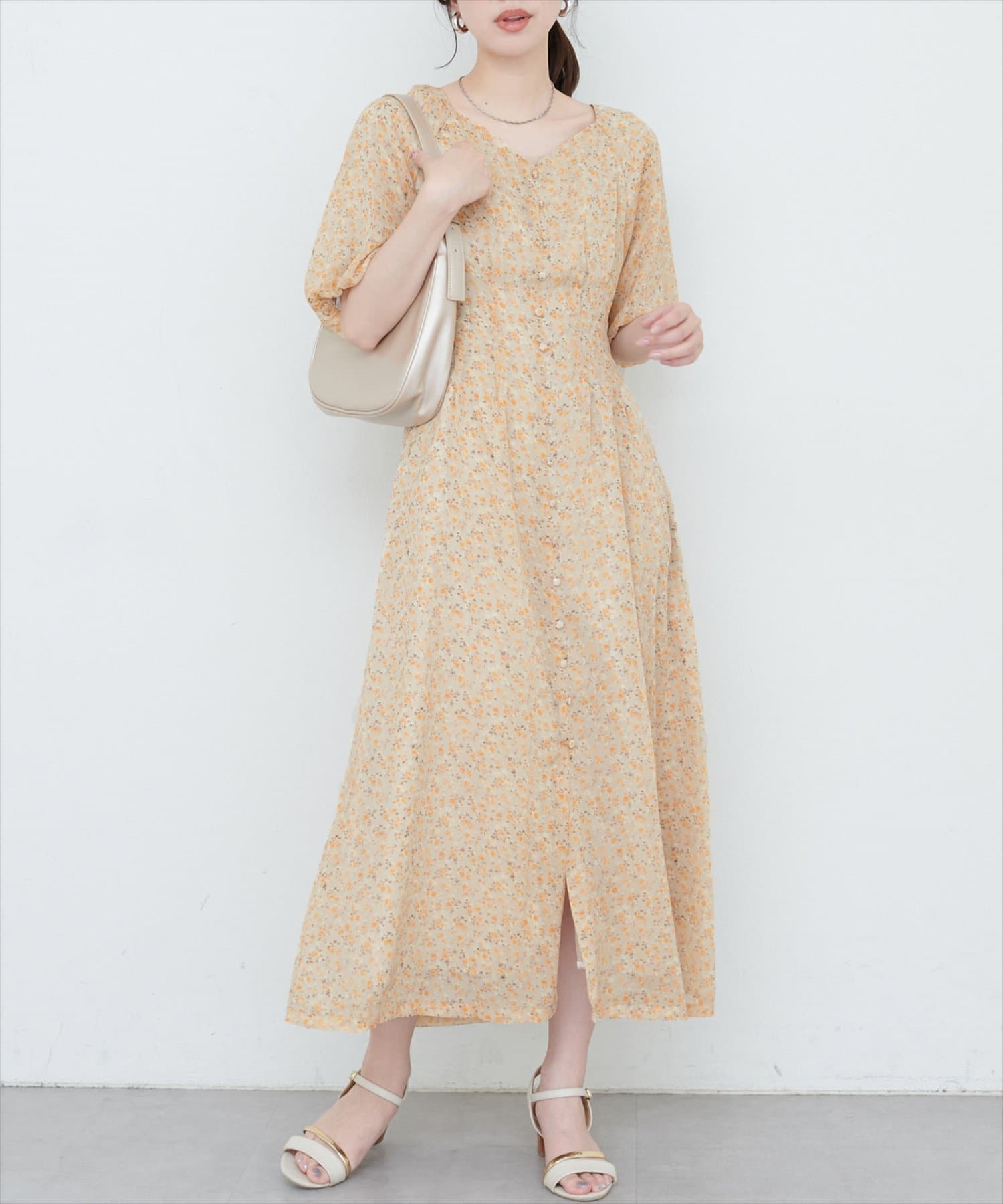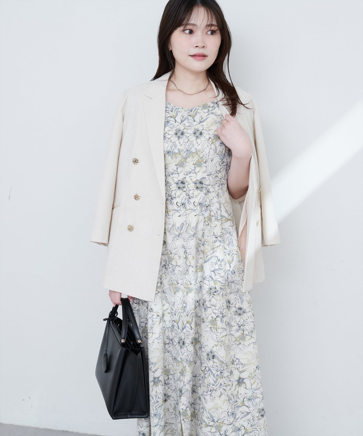鮮やかな色合いのフラワープリントが目を引く、上品なワンピース。