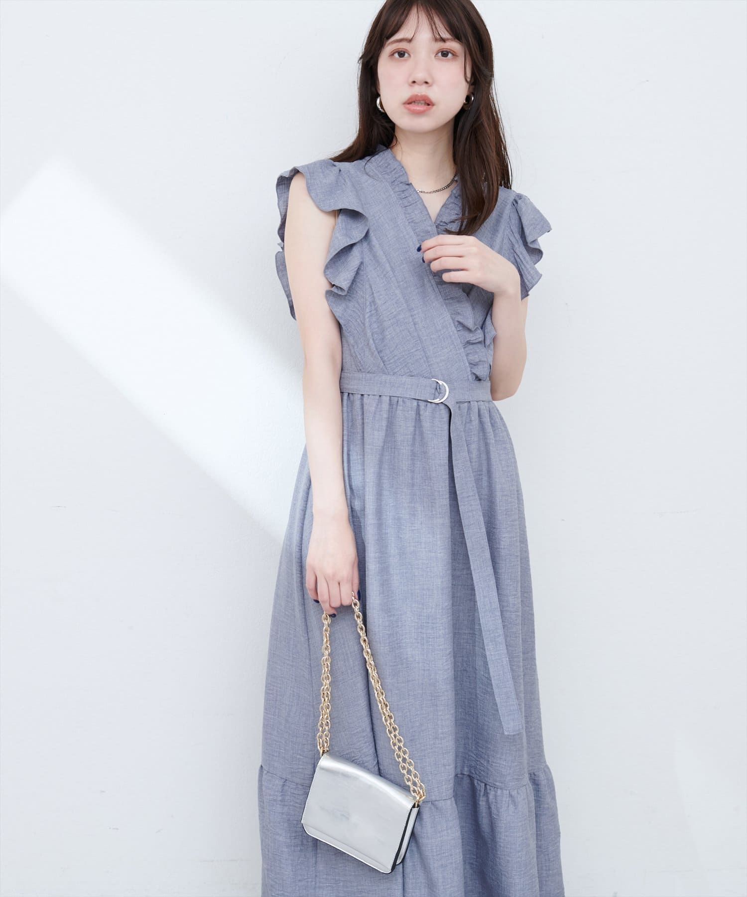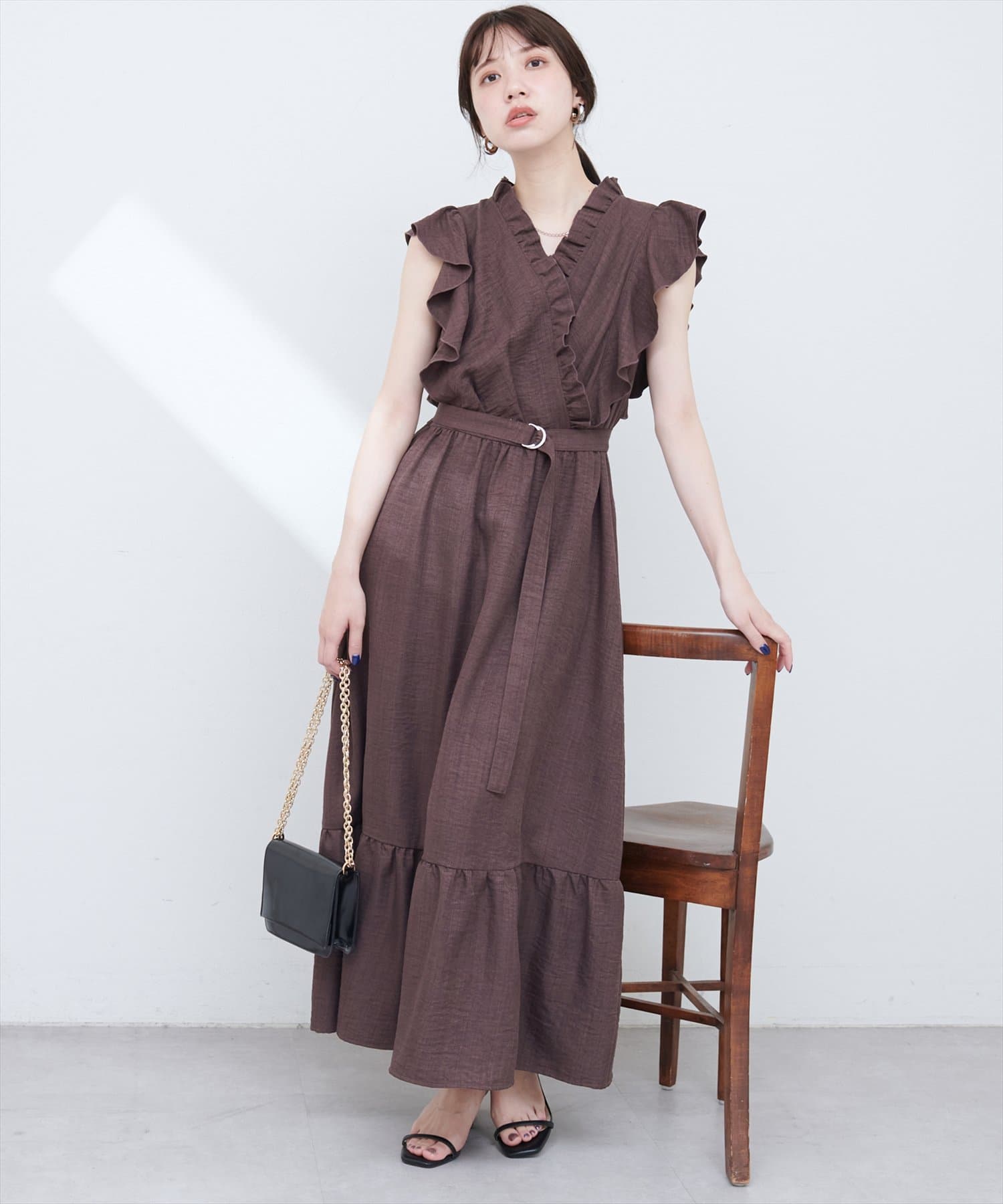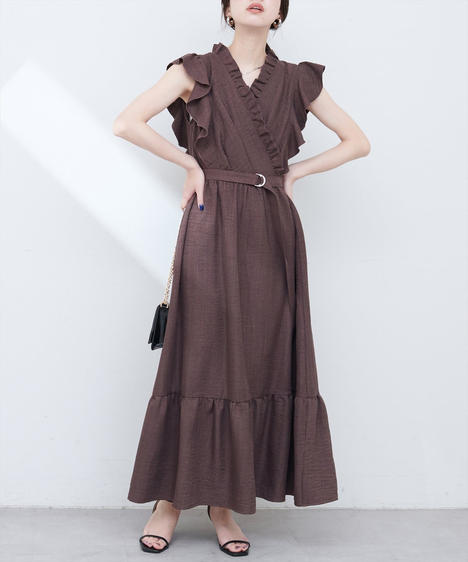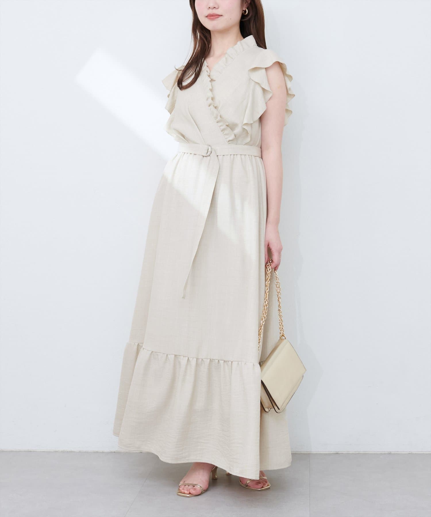 ふんわりと揺れるフリルが、女性らしさを引き立てるカシュクールワンピース。