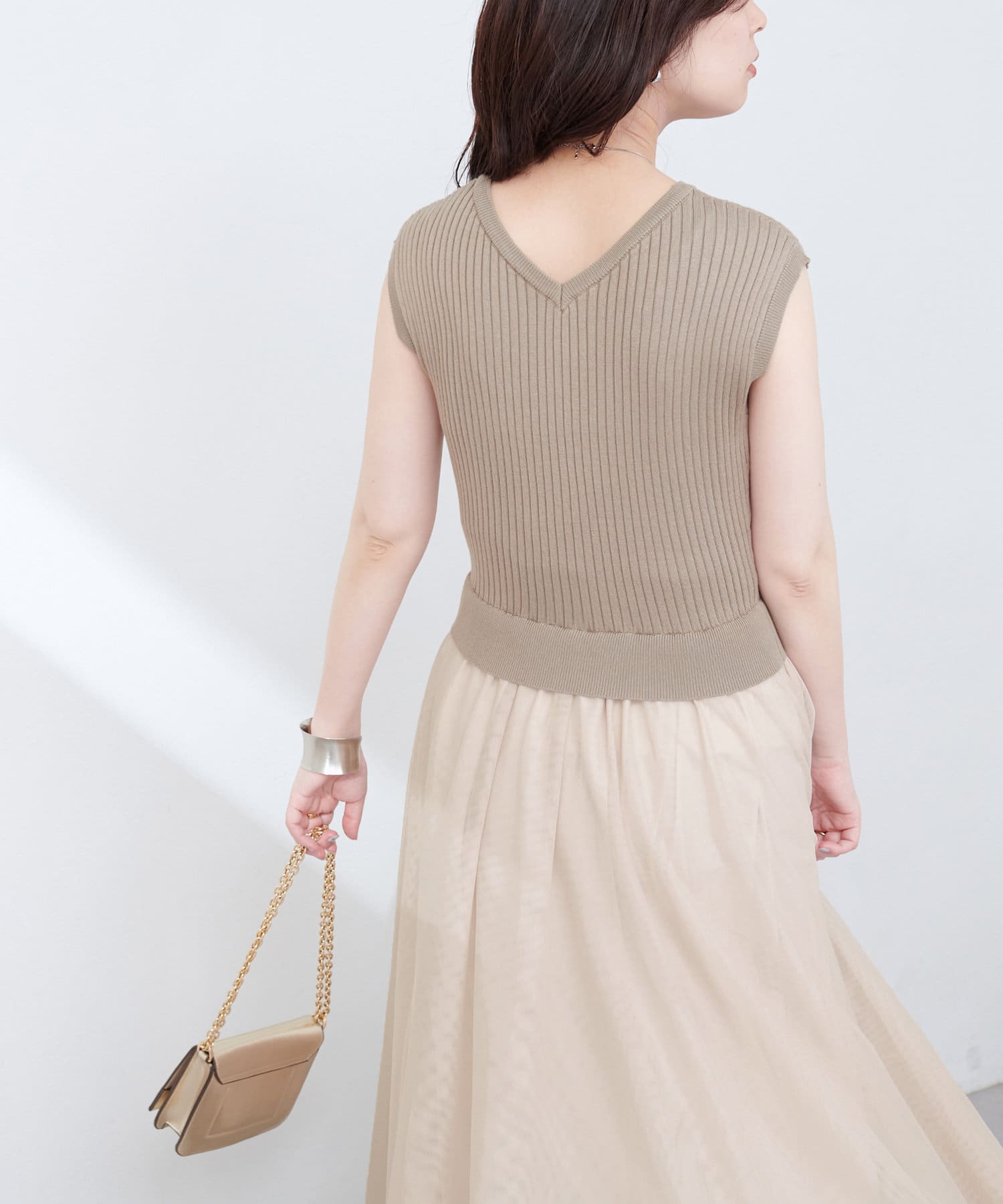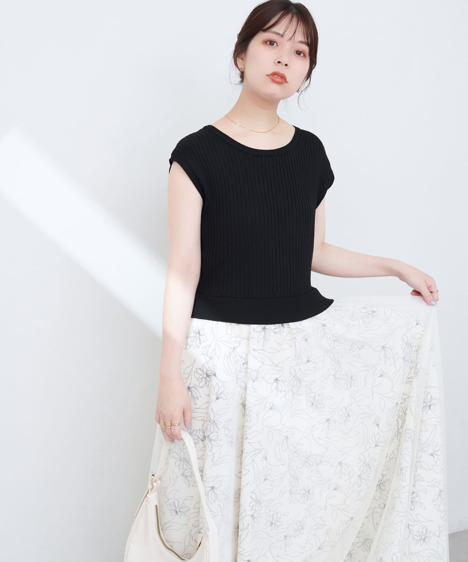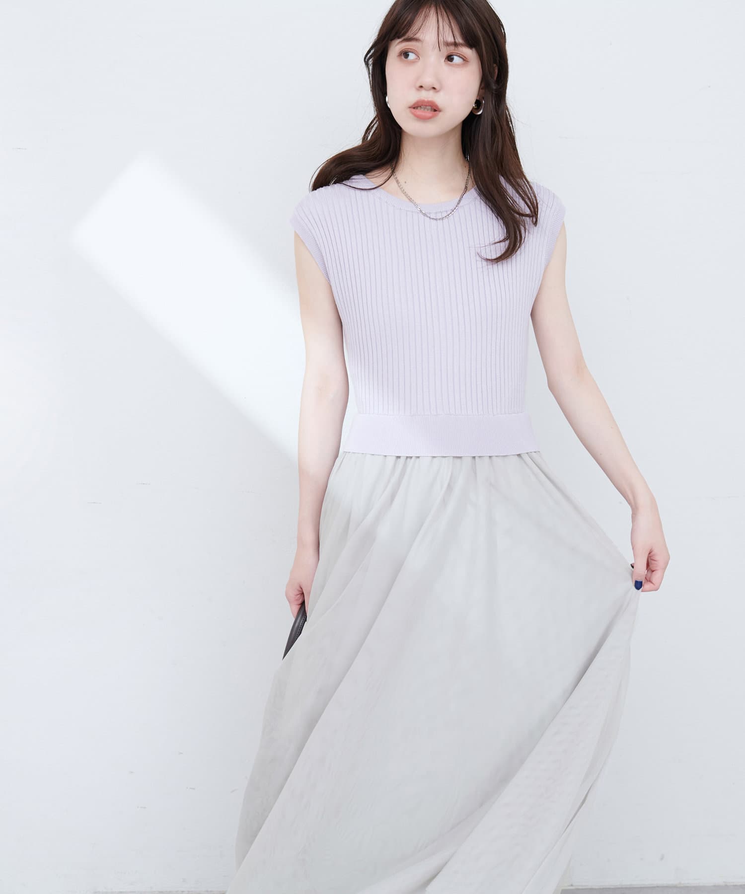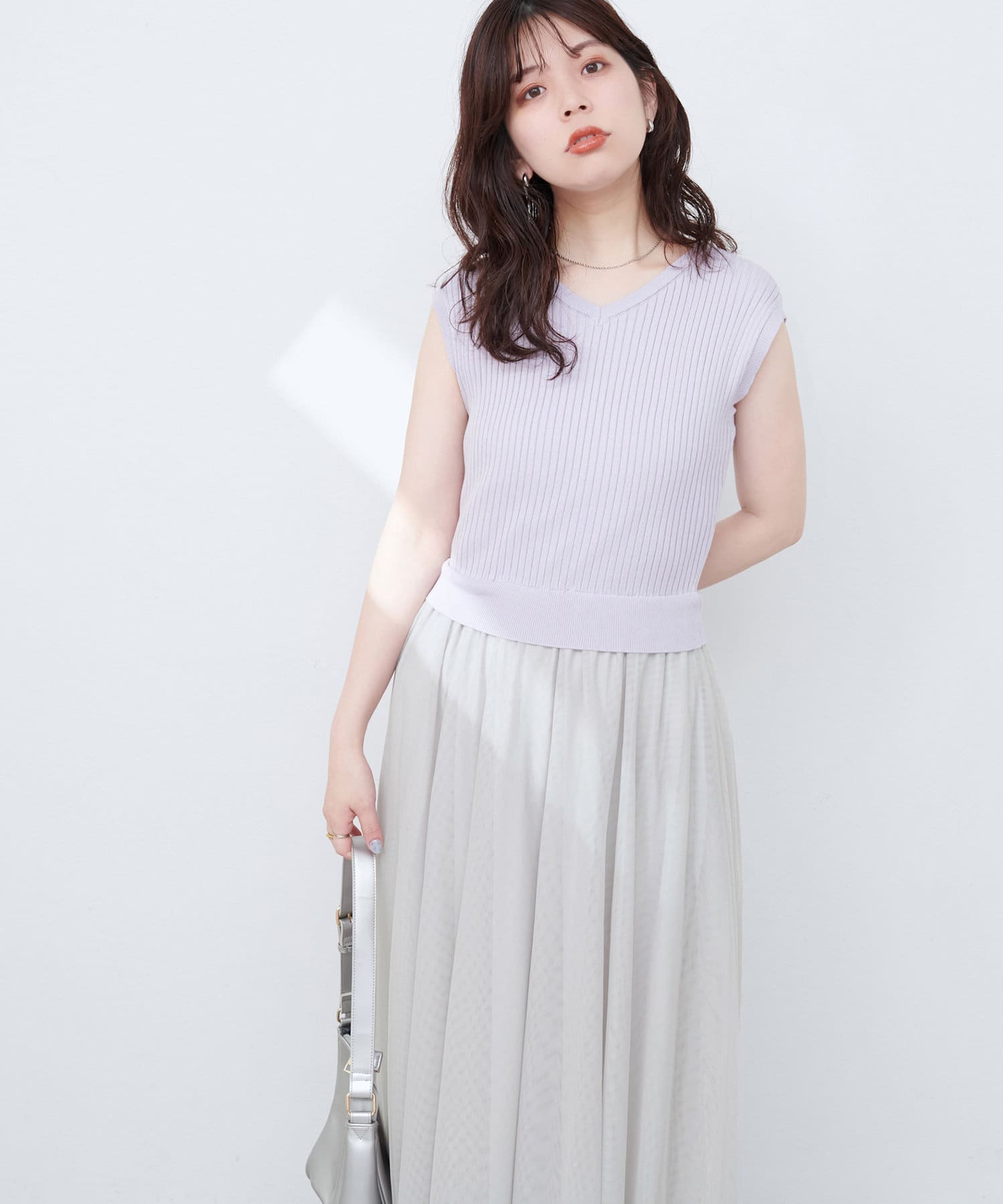 トップス部分はリブニット素材を使用しており、程よいフィット感でスタイルアップ効果も期待できます。