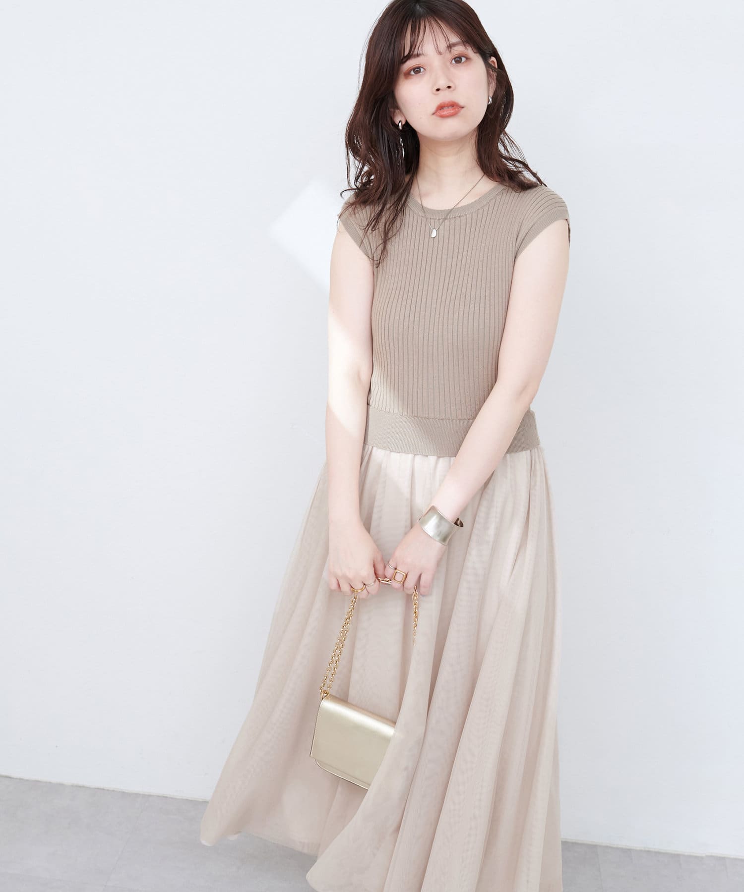 スカート部分は軽やかなチュール素材で、歩くたびにふわりと揺れるシルエットが女性らしさを演出。