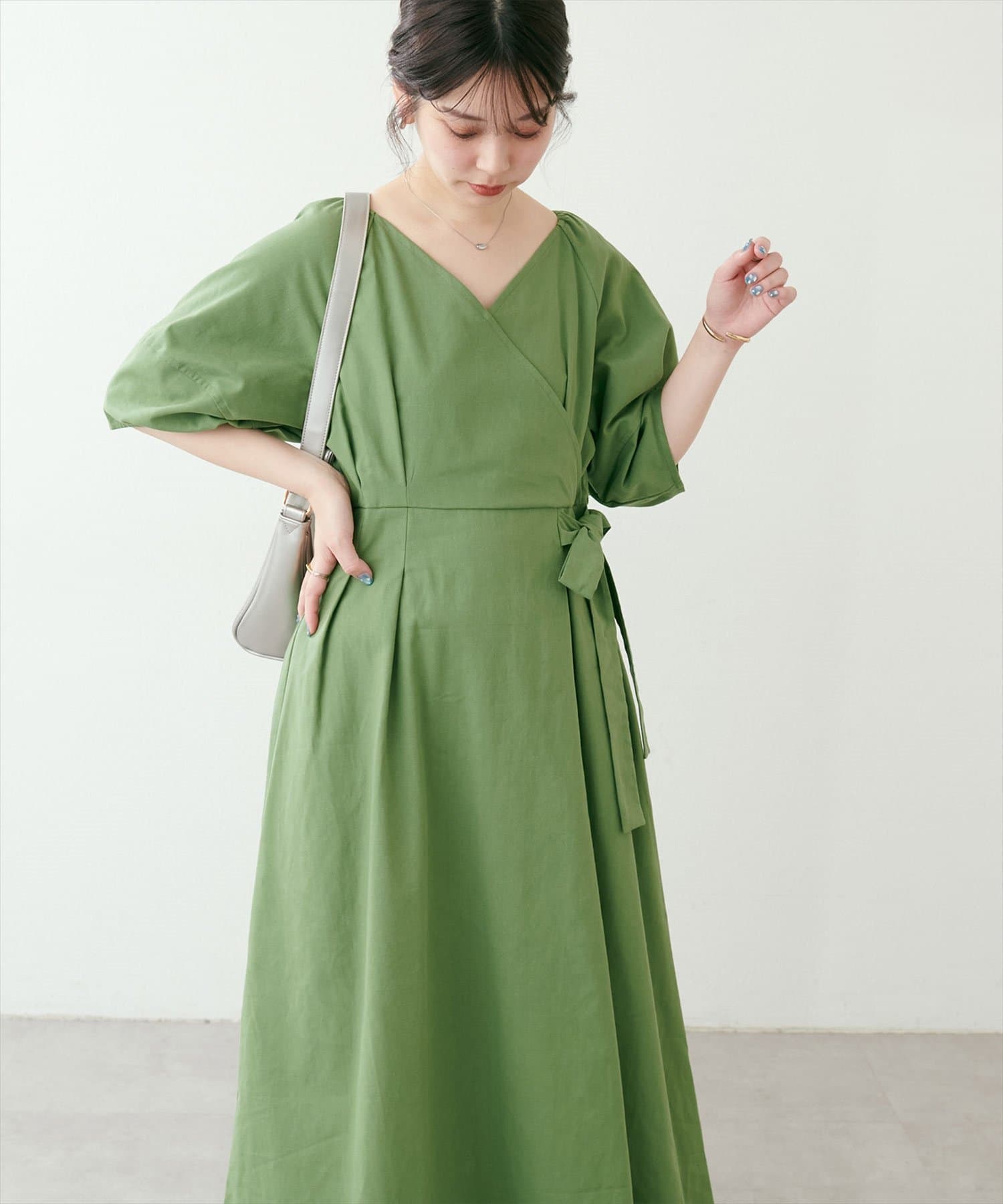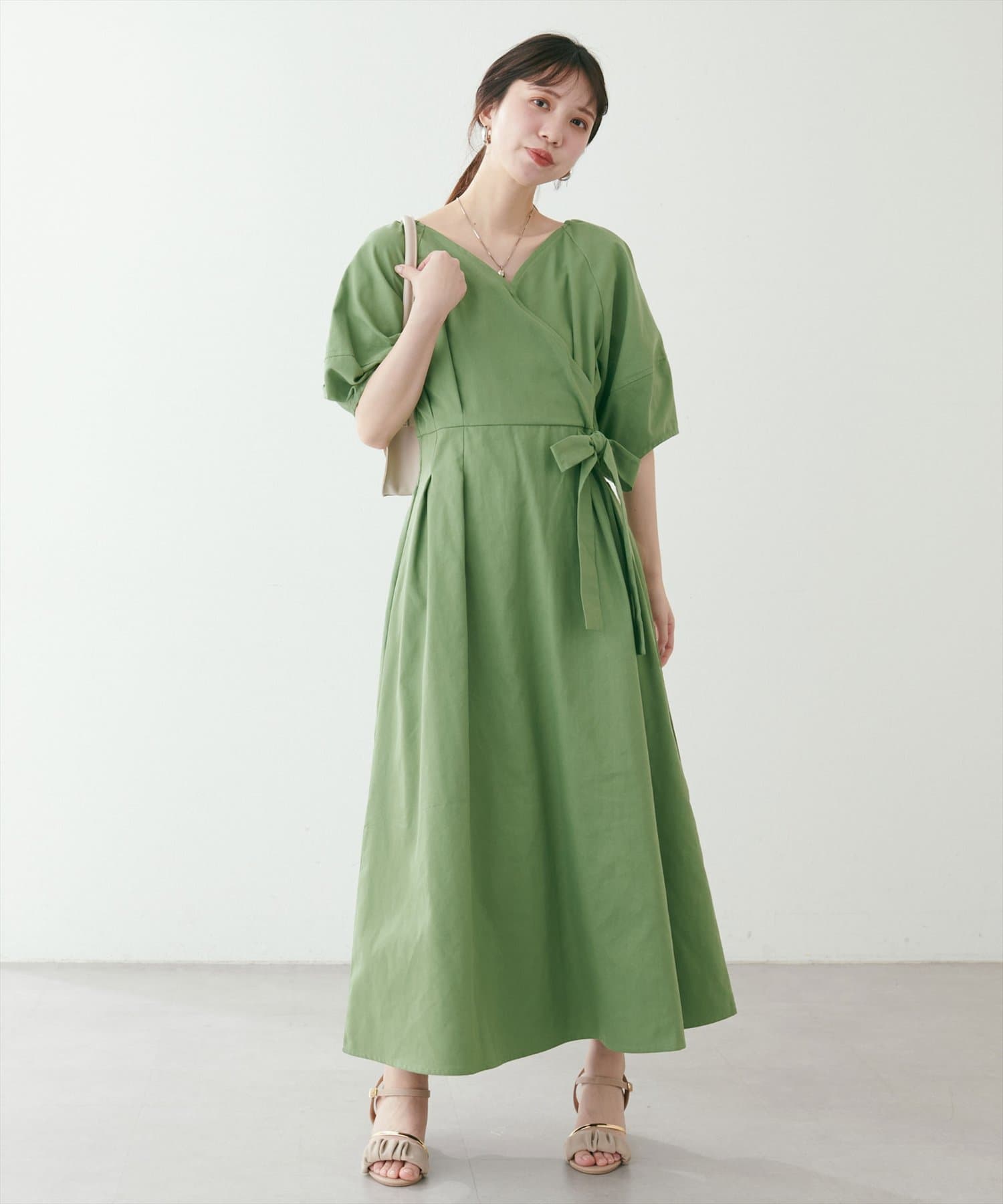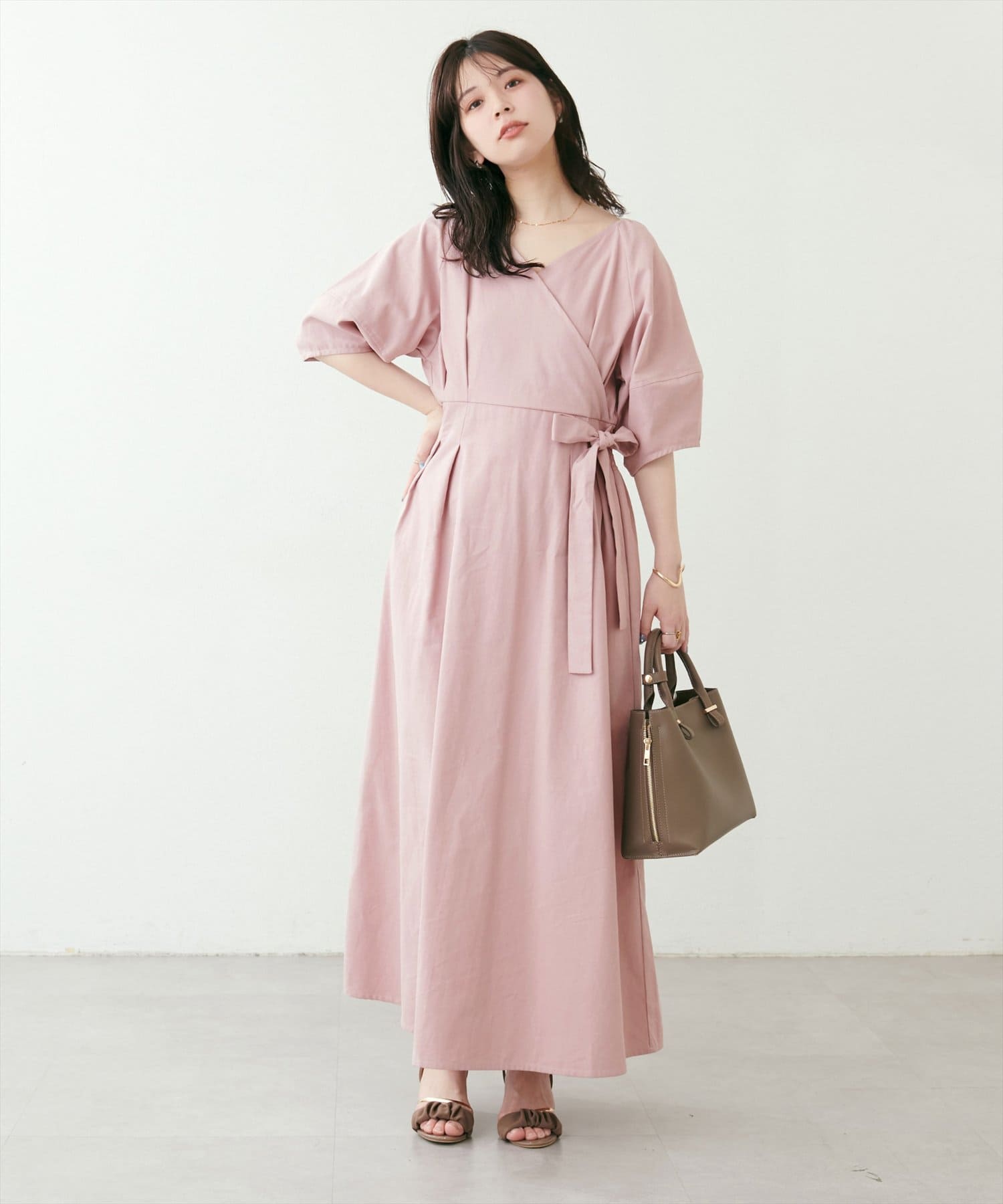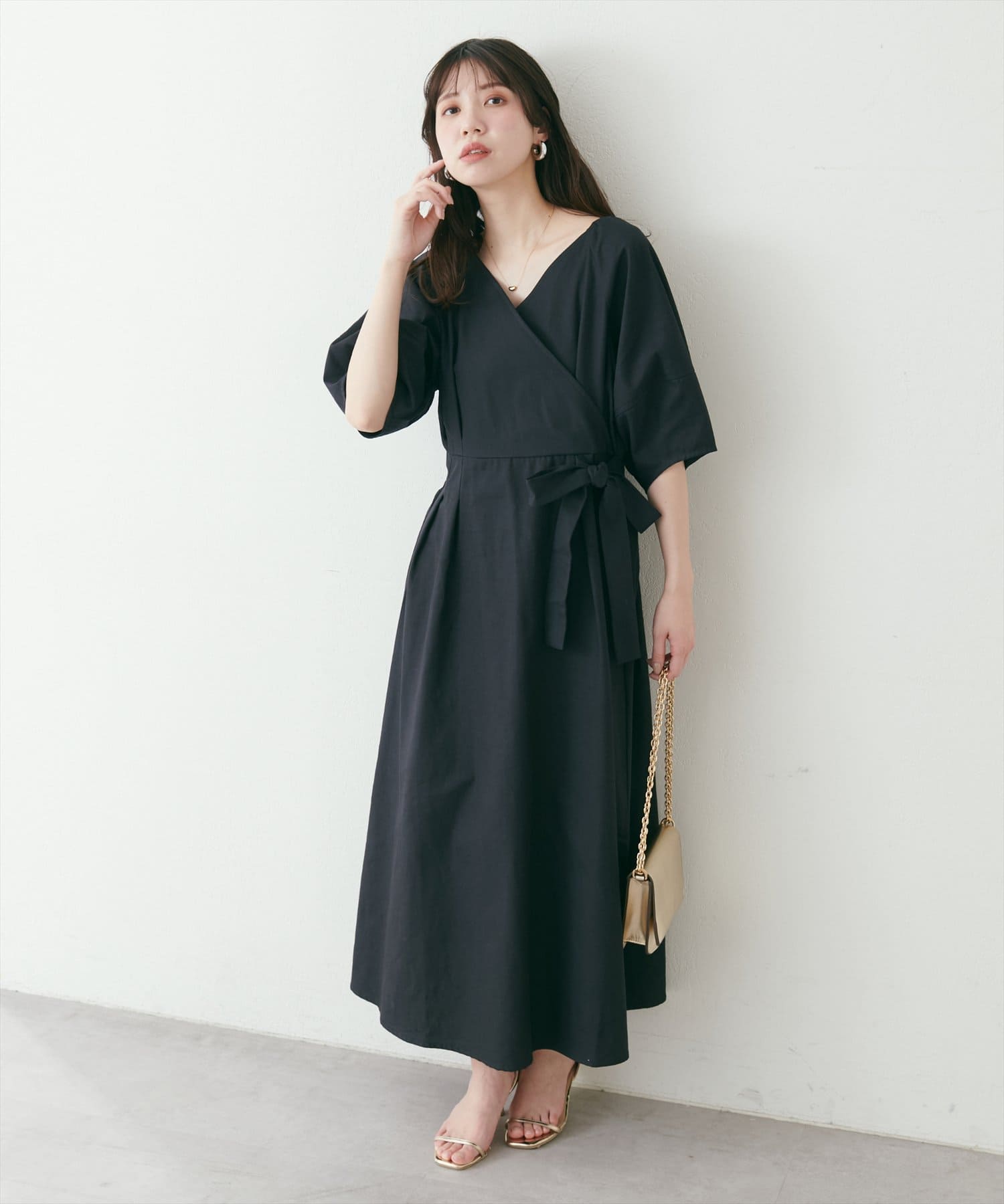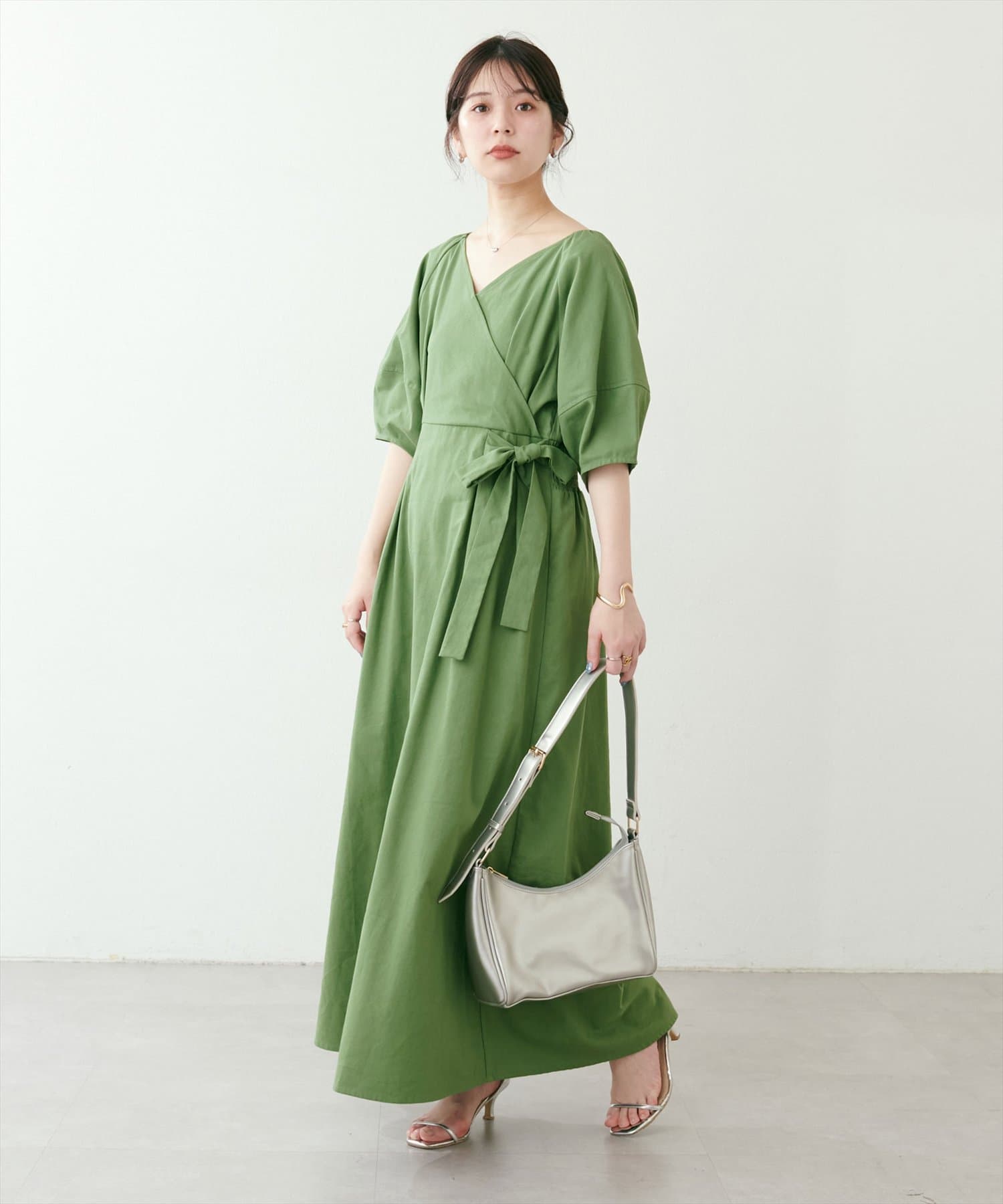 カシュクールデザインは、ウエストラインを自然とシェイプし、スタイルアップ効果も抜群。