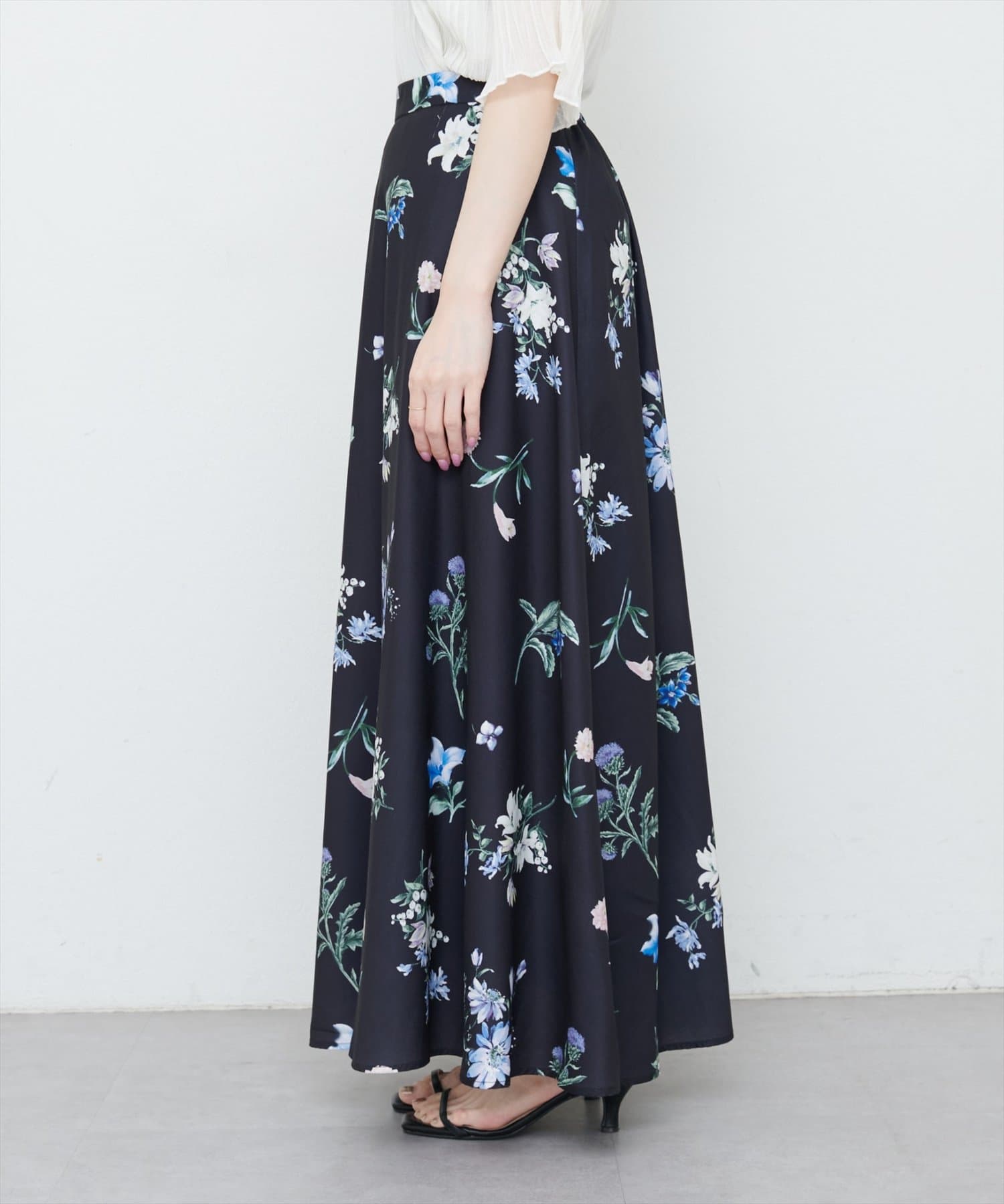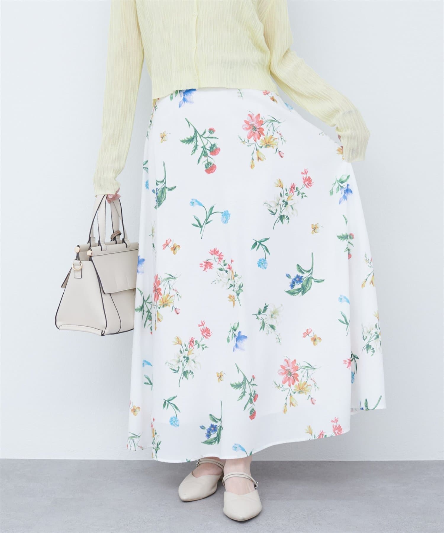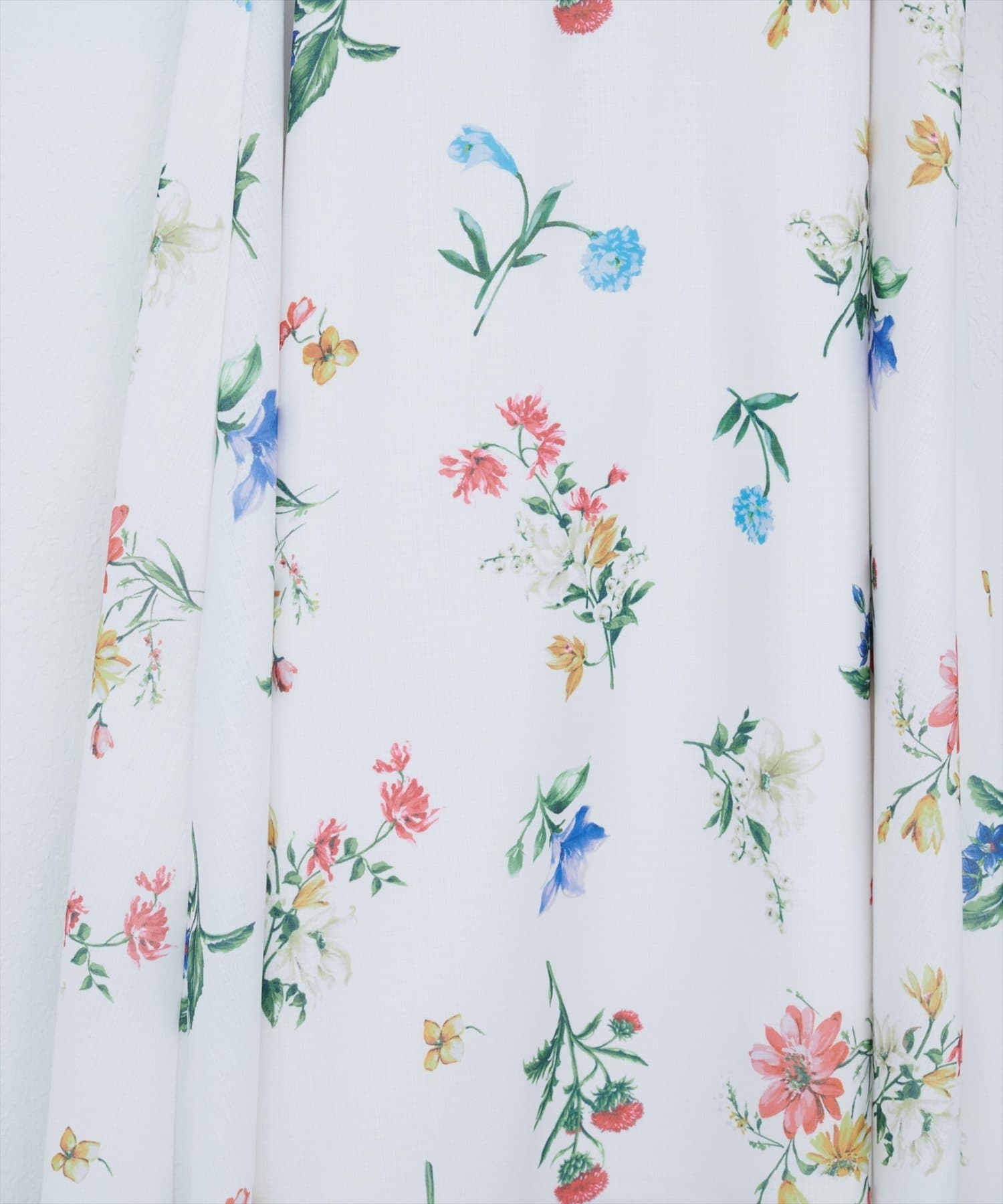 オリジナルの花柄素材をたっぷり使い、一面に咲き誇る繊細な花柄が美しいスカート。