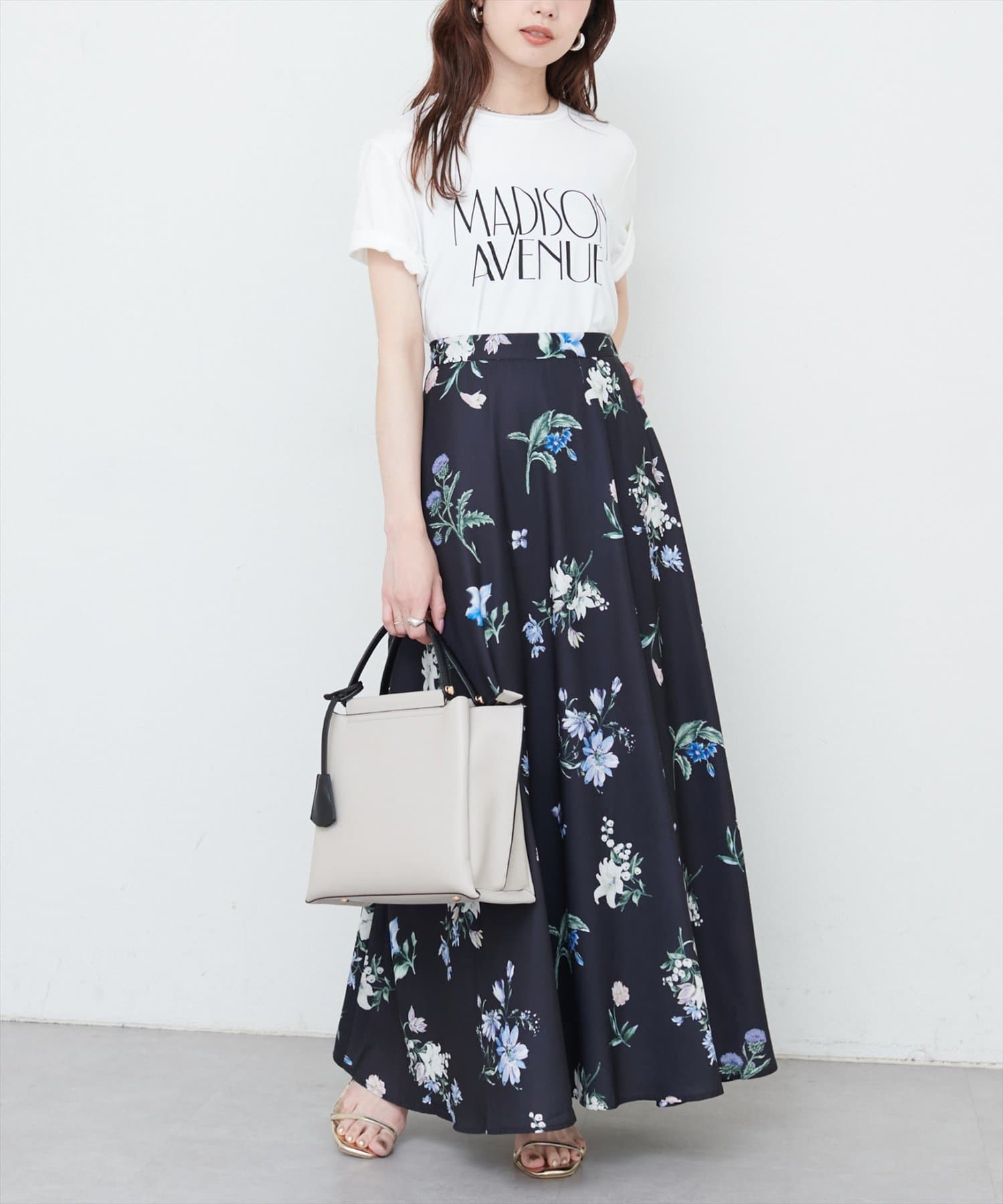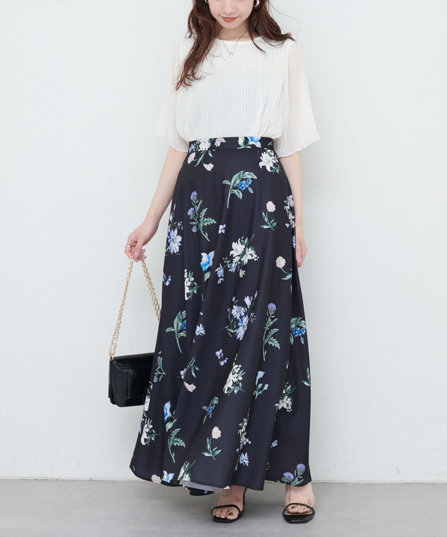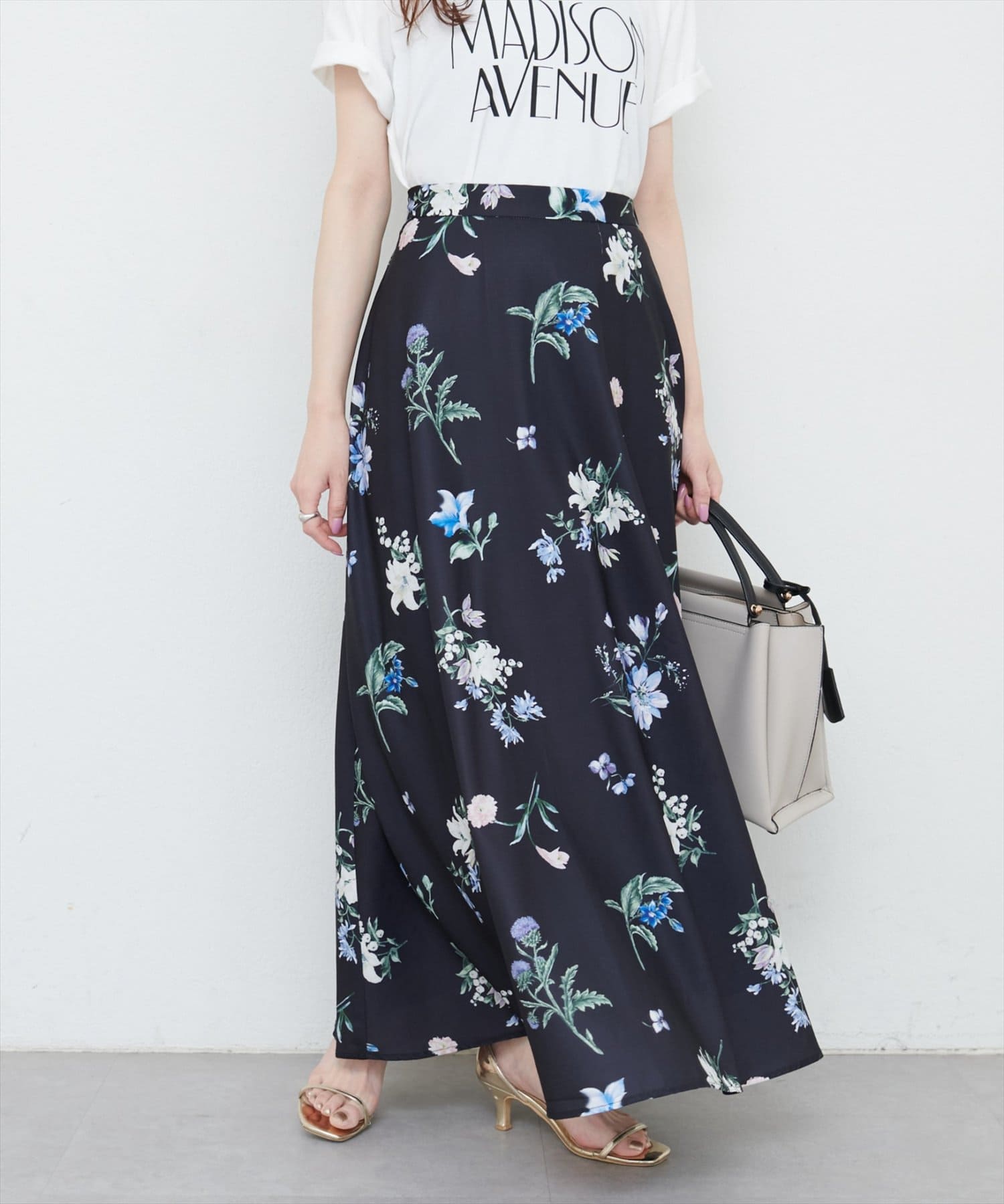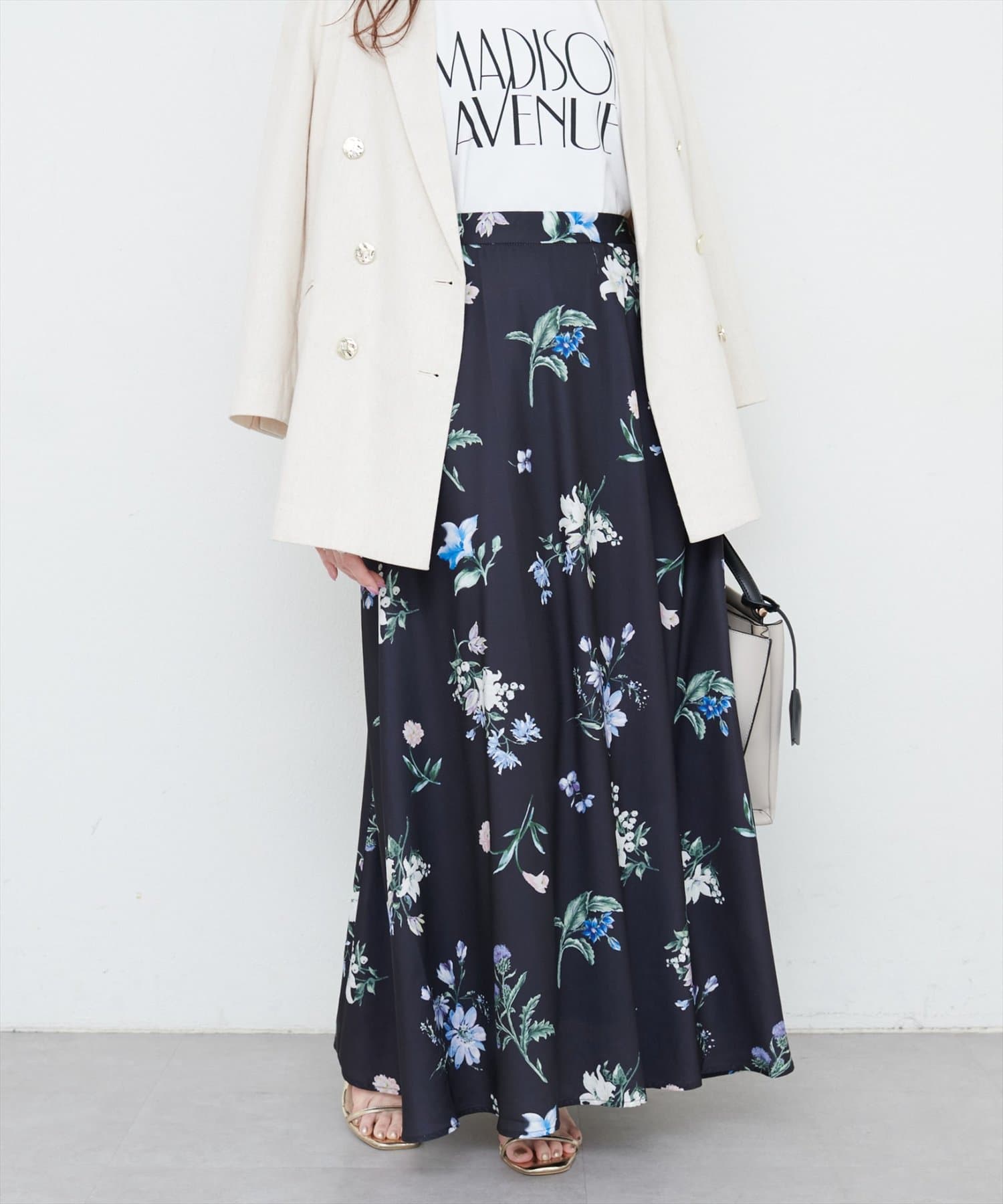 オリジナルの花柄素材をたっぷり使い、一面に咲き誇る繊細な花柄が美しいスカート。