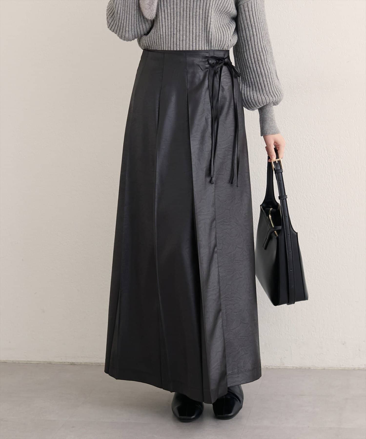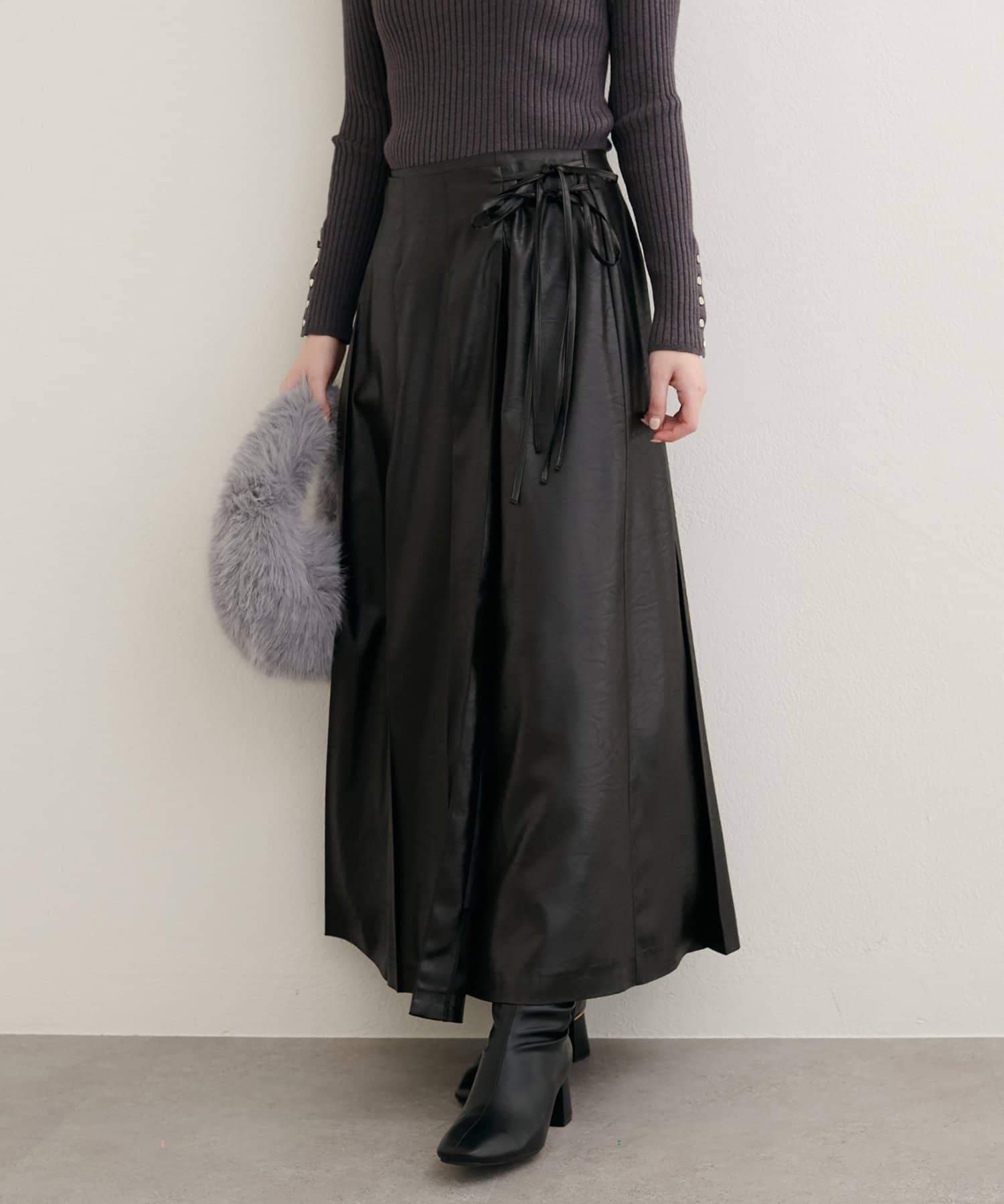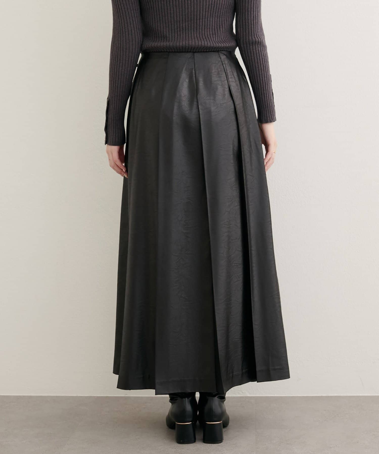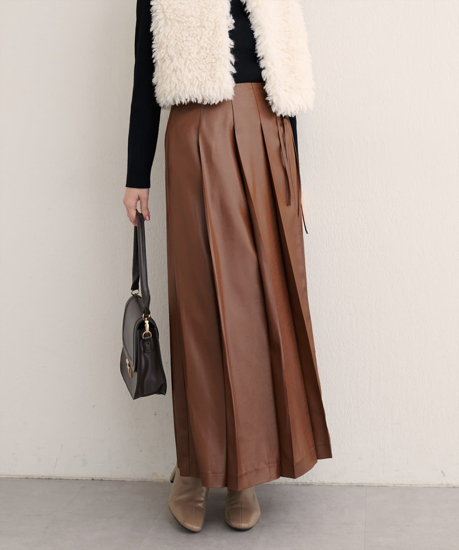 まるで本革のような上品さが魅力の、レザータッチプリーツラップスカート。