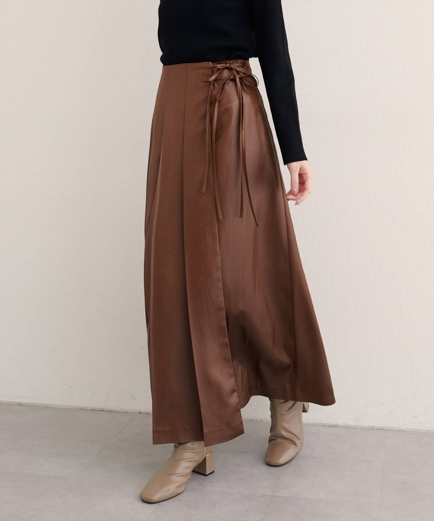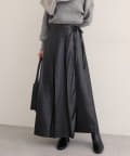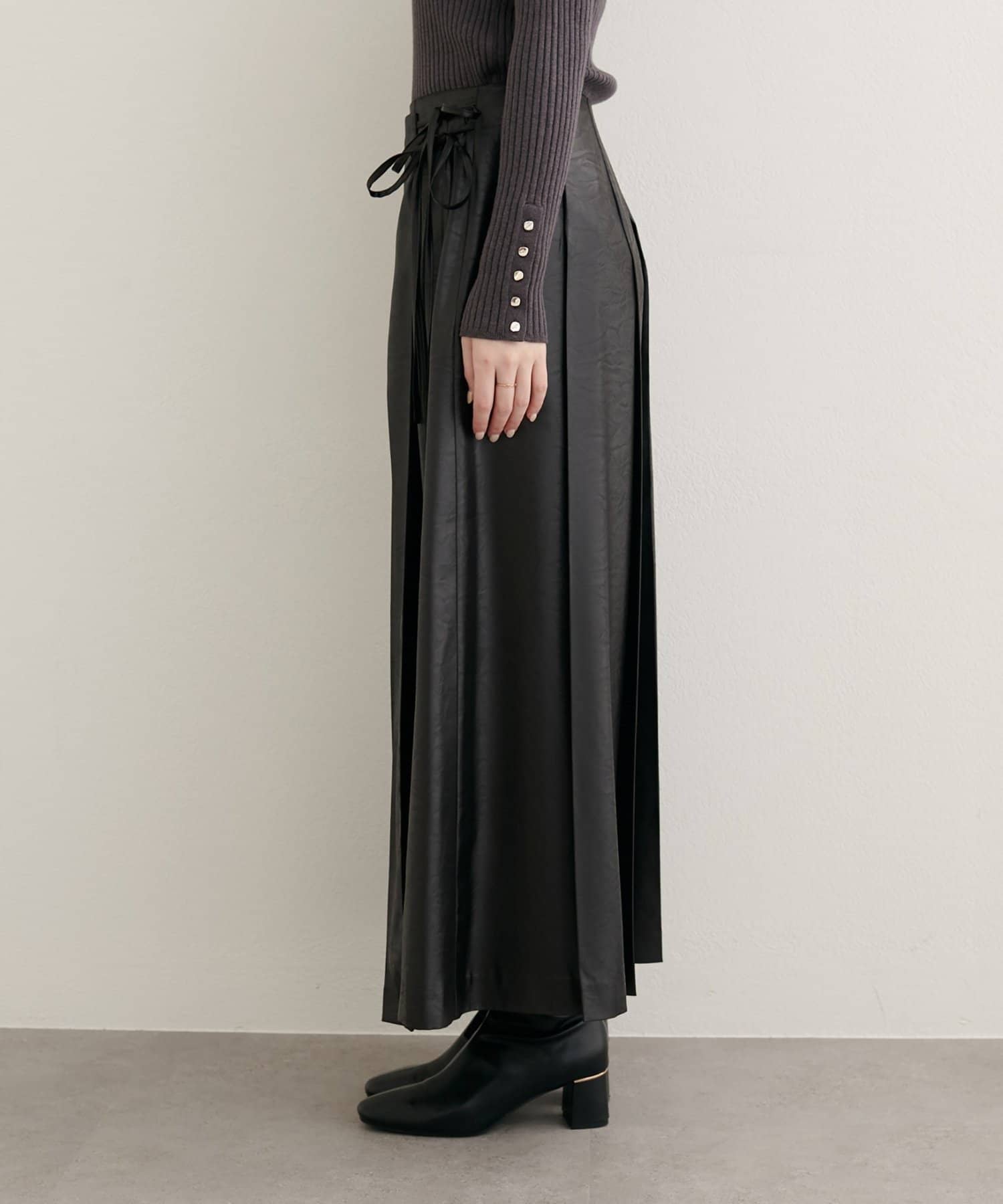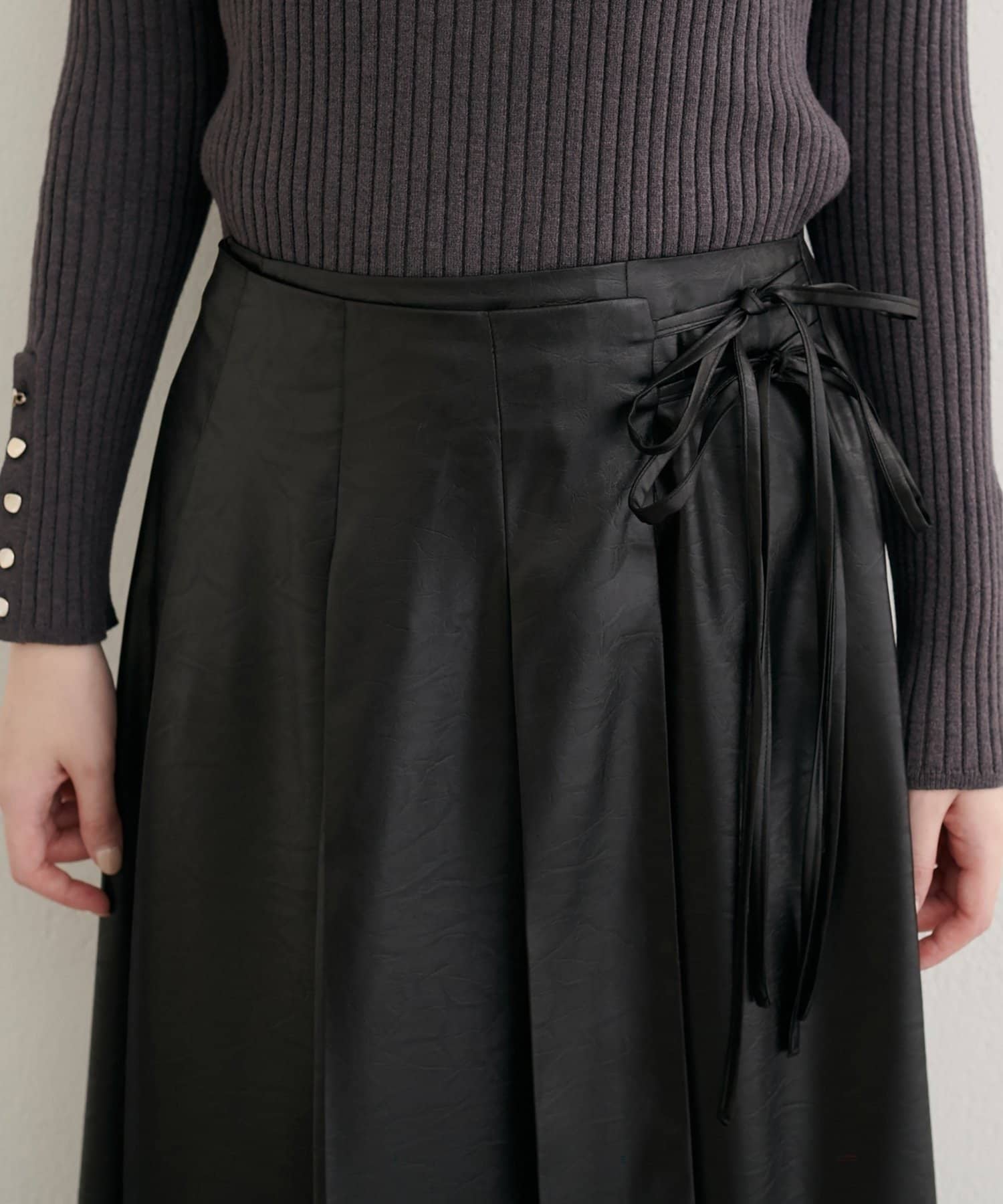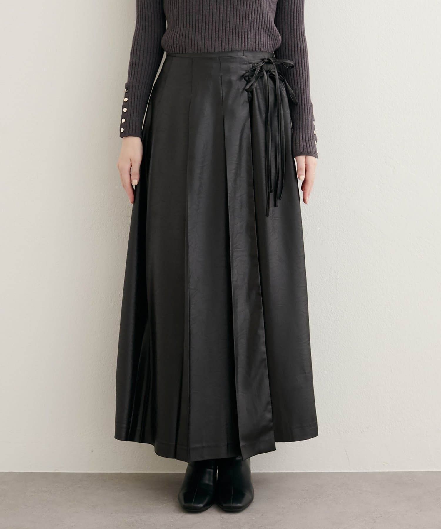 まるで本革のような上品さが魅力の、レザータッチプリーツラップスカート。