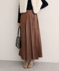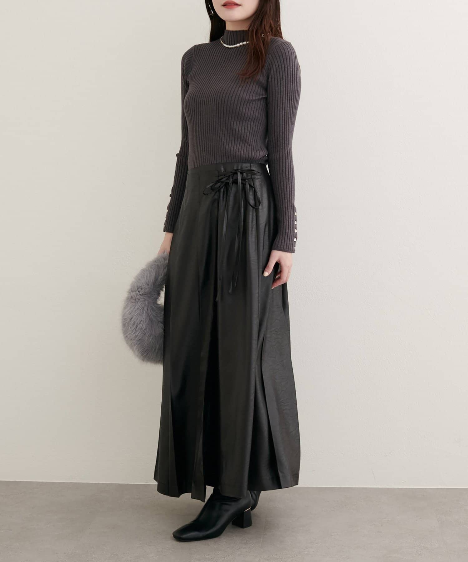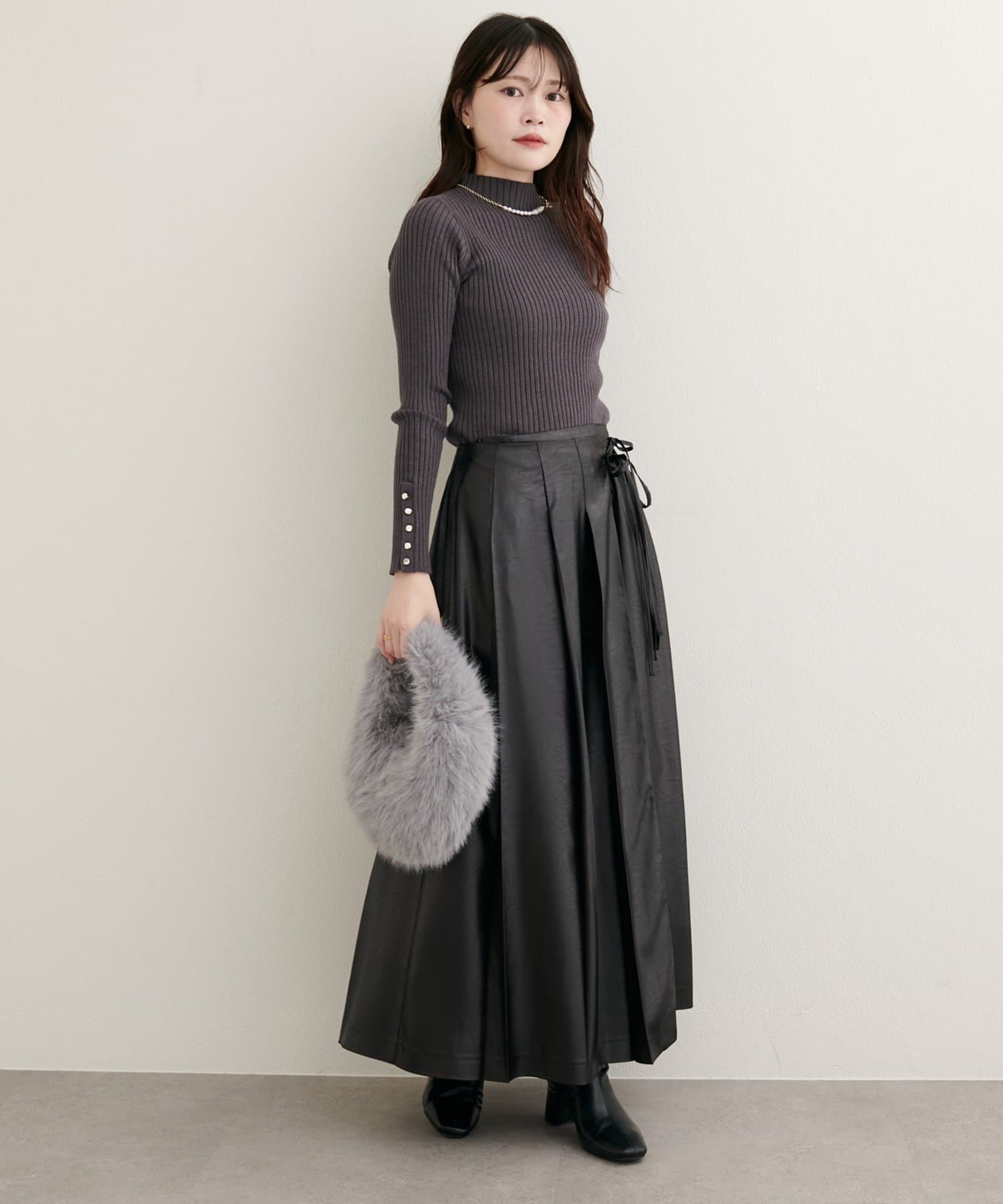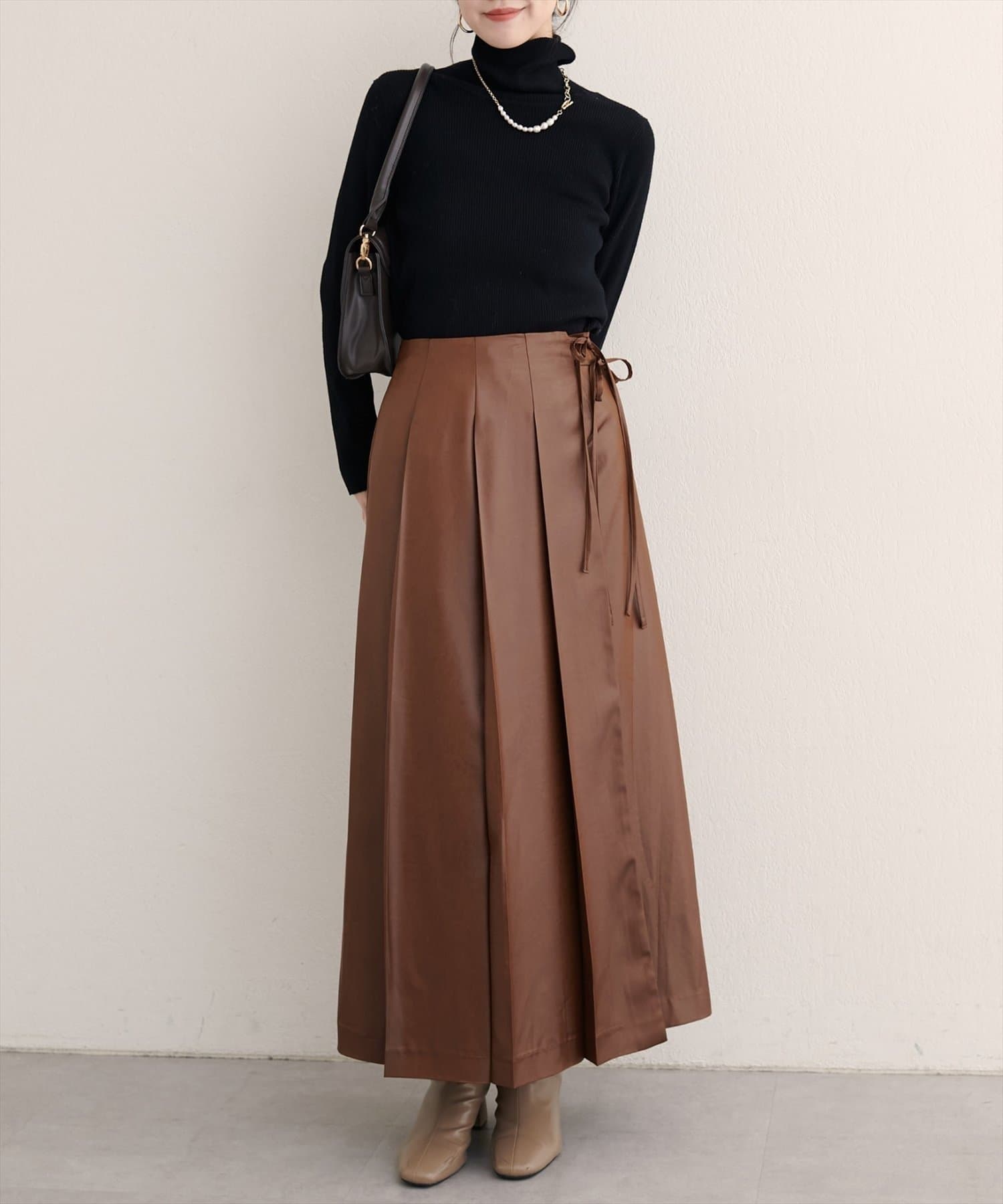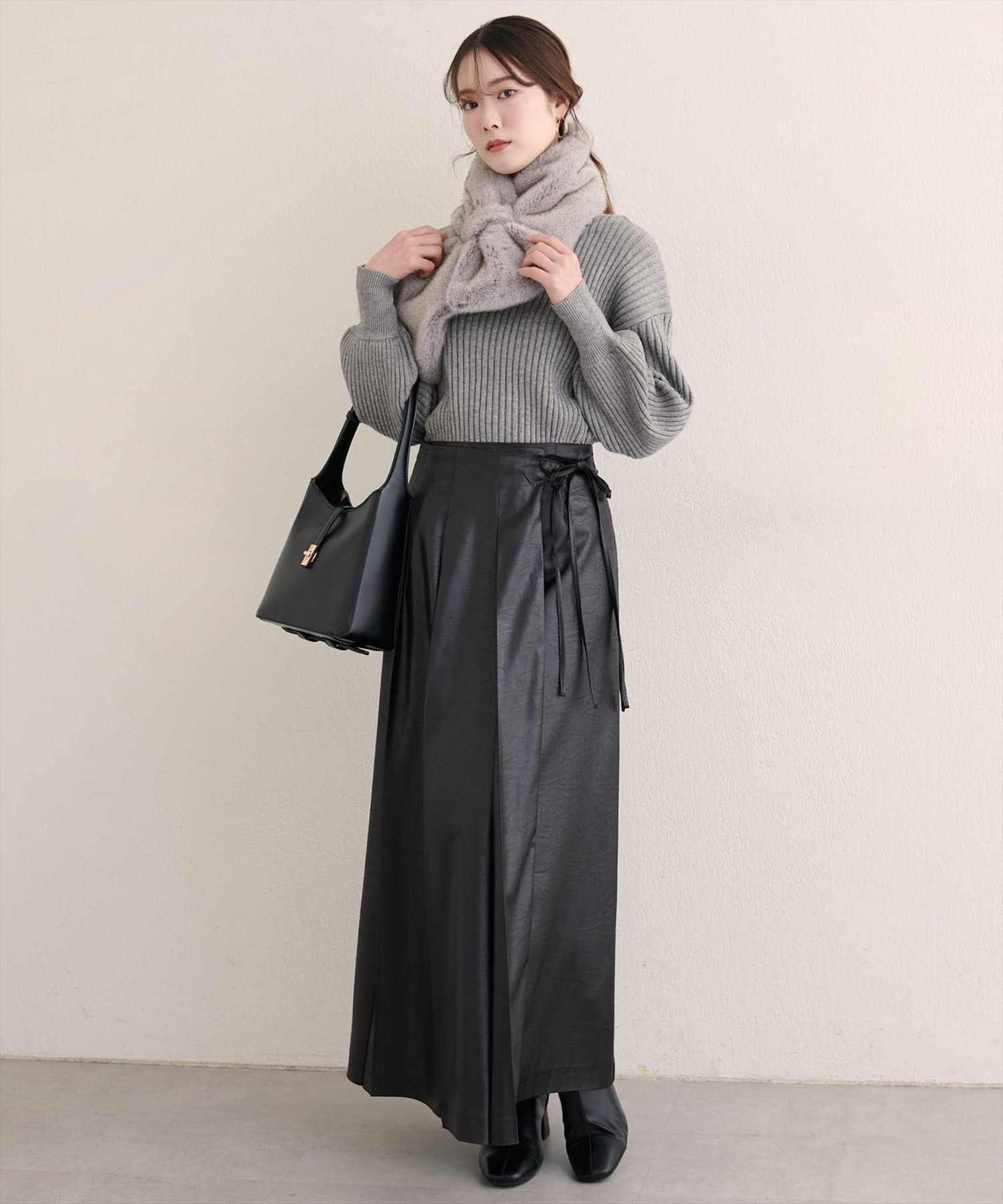 まるで本革のような上品さが魅力の、レザータッチプリーツラップスカート。