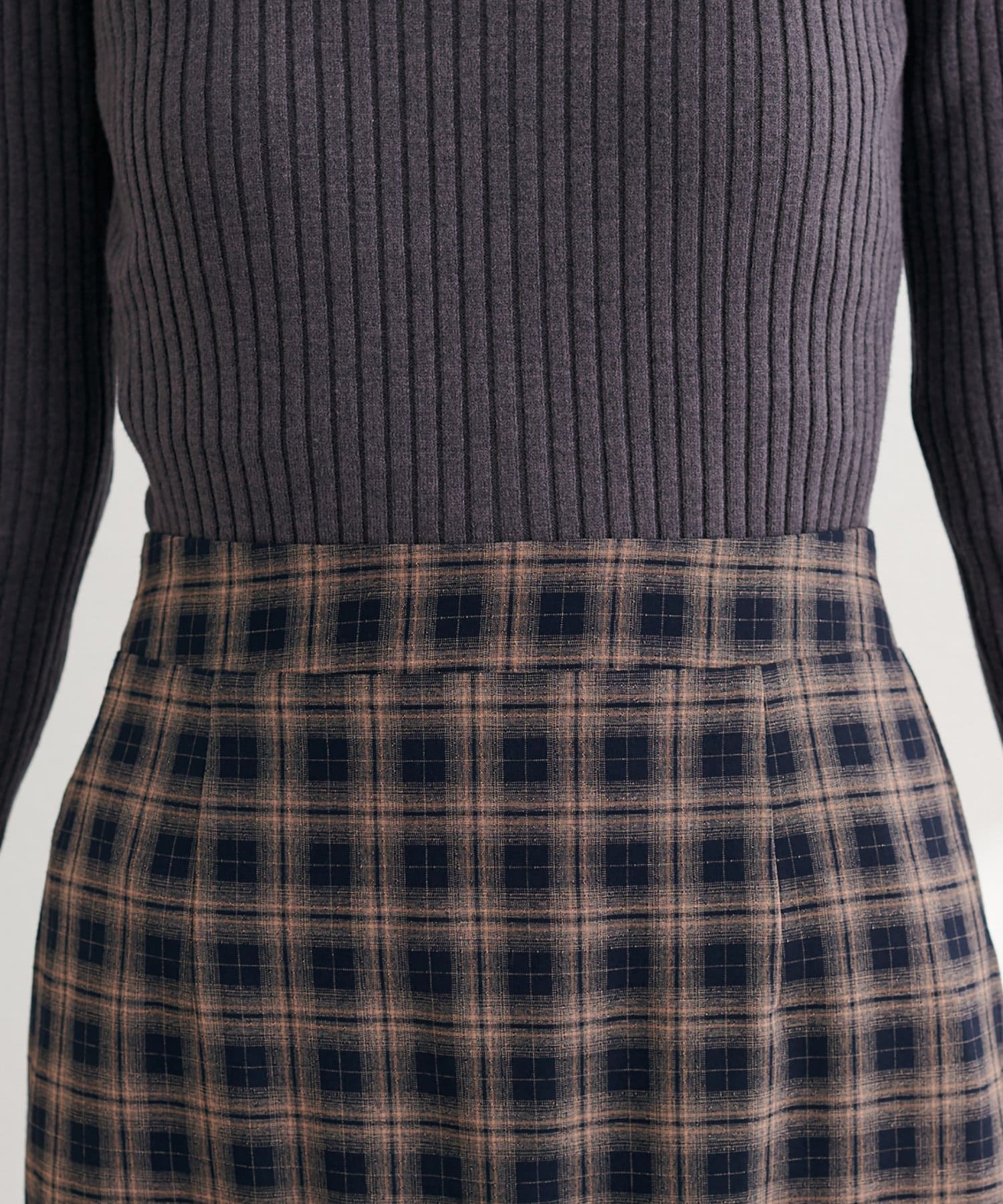 落ち着いた色合いのチェック柄は、カジュアルになりすぎず、上品な印象に。