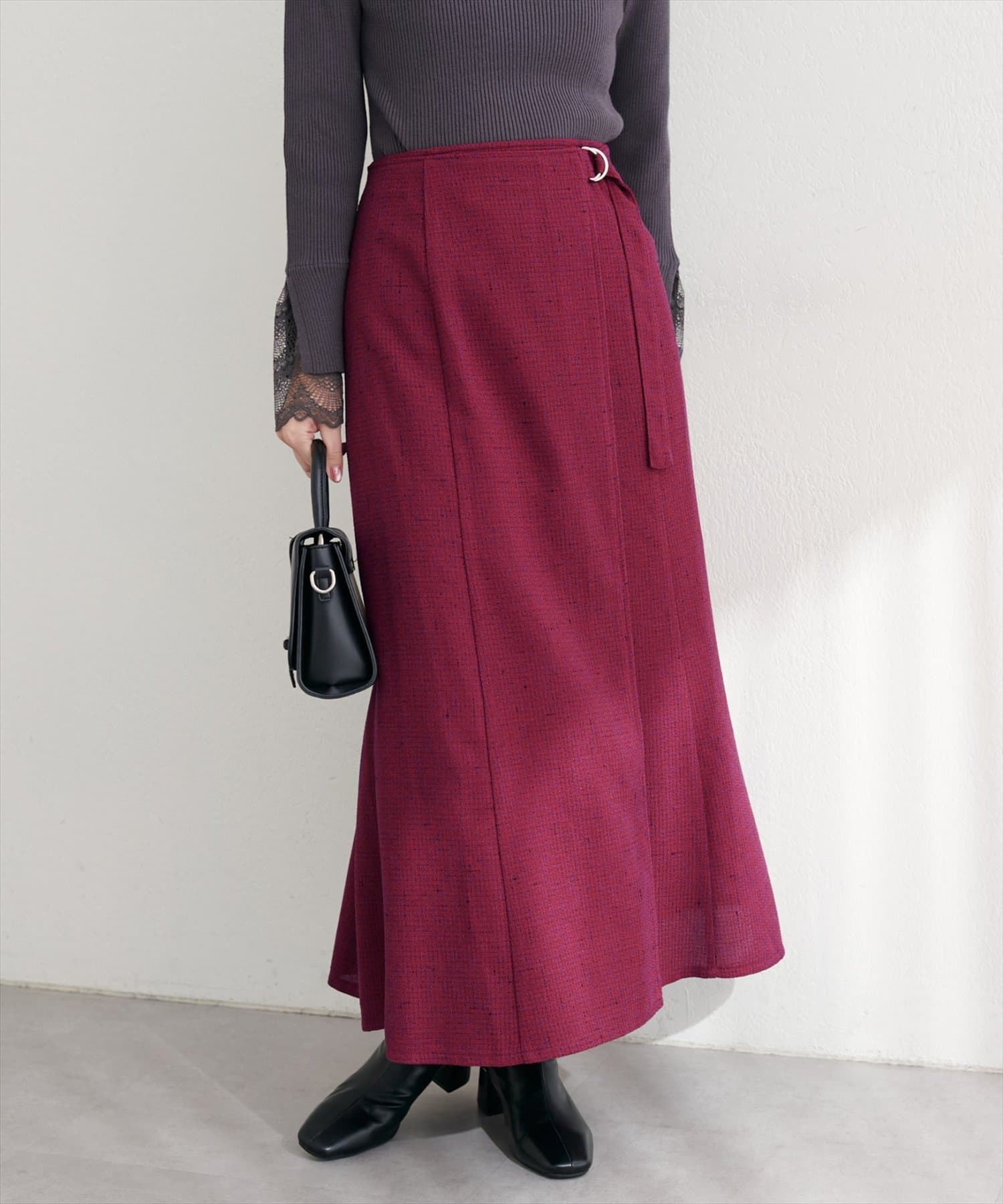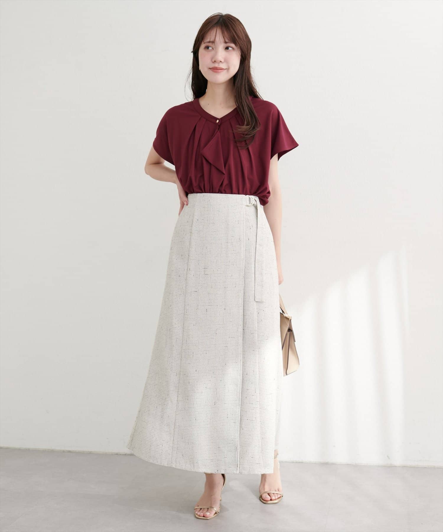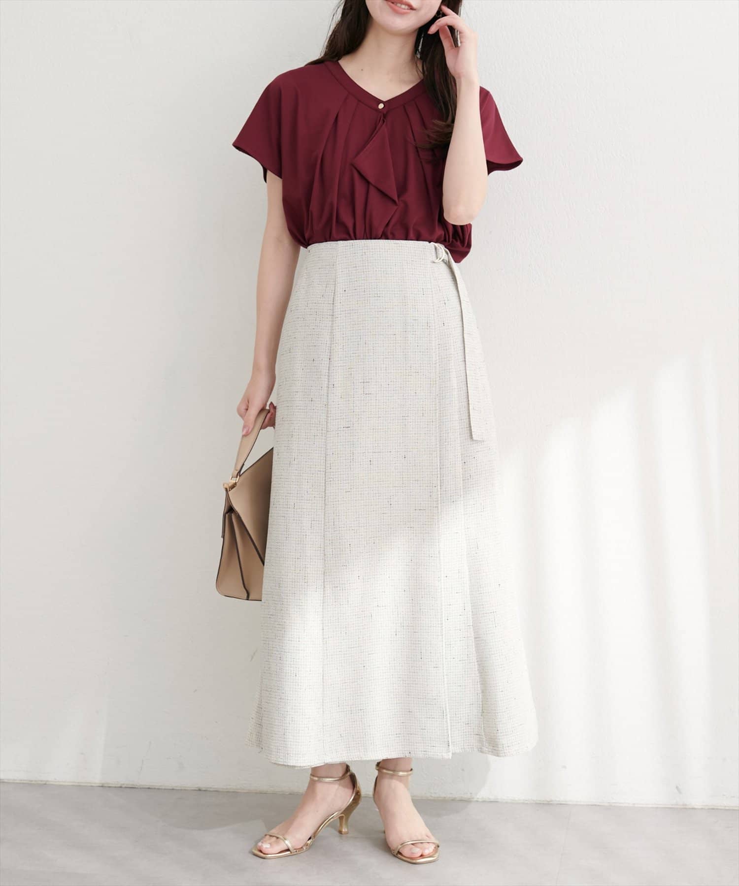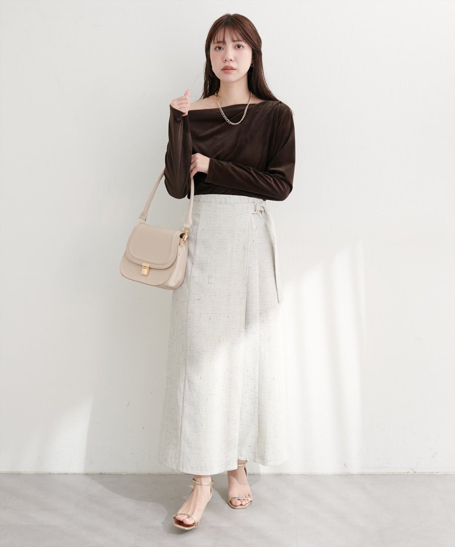大人の女性らしさを引き出す、ラップ風ツイードスカート。
