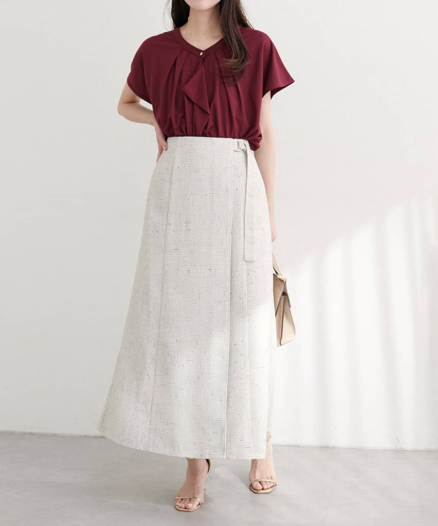 大人の女性らしさを引き出す、ラップ風ツイードスカート。